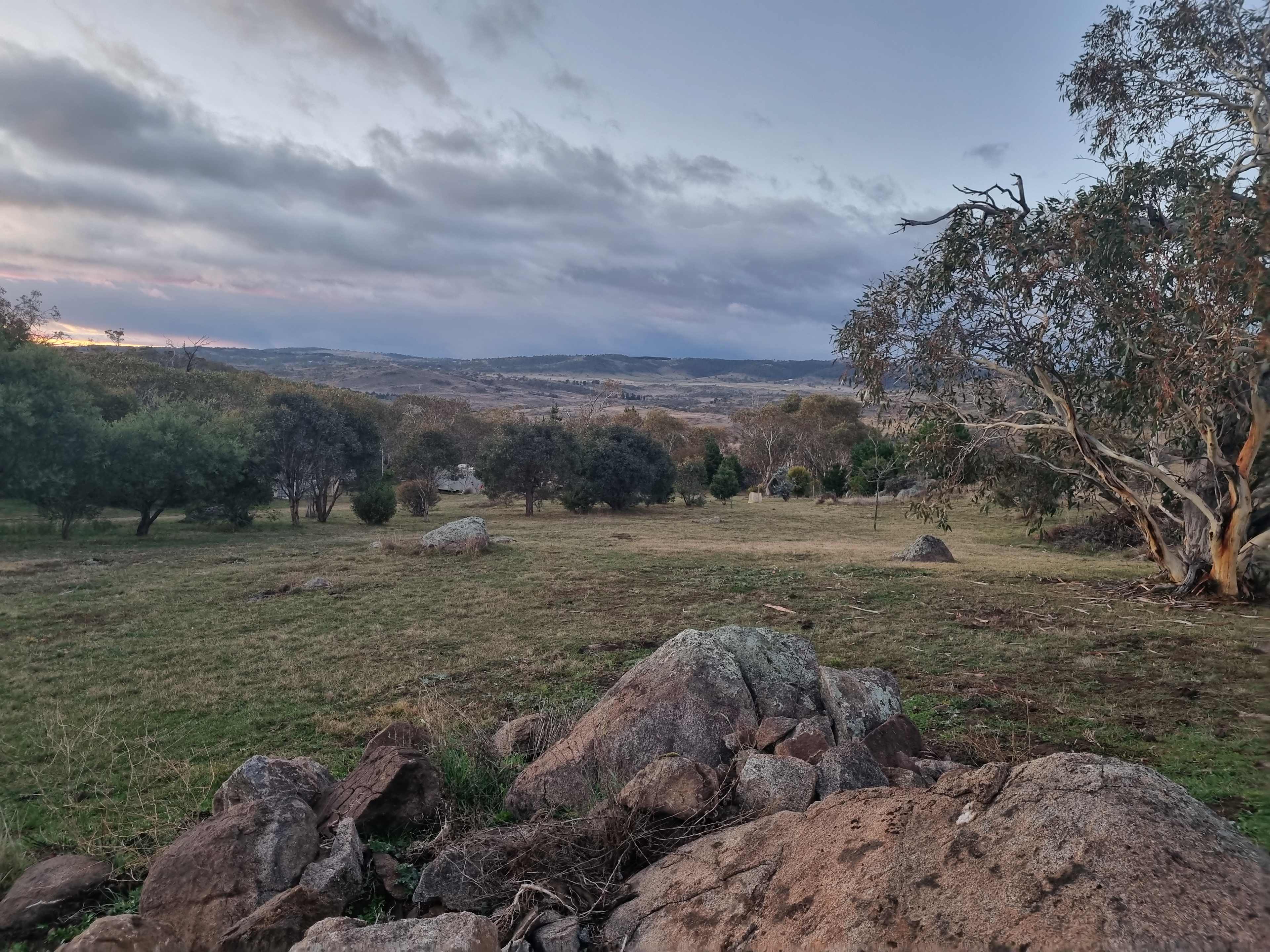 East paddock is a grass corner of the property with some old snow gums and natural granite out crops . The aspect is south east and sure to catch the morning sun rising over Mcgufficks Hill and lighting up hills and farmland and glimpses of the Moonbah River which is only a short walk . The morning views are not to be missed with low cloud in the valleys kangaroos and the odd wombat in the area .