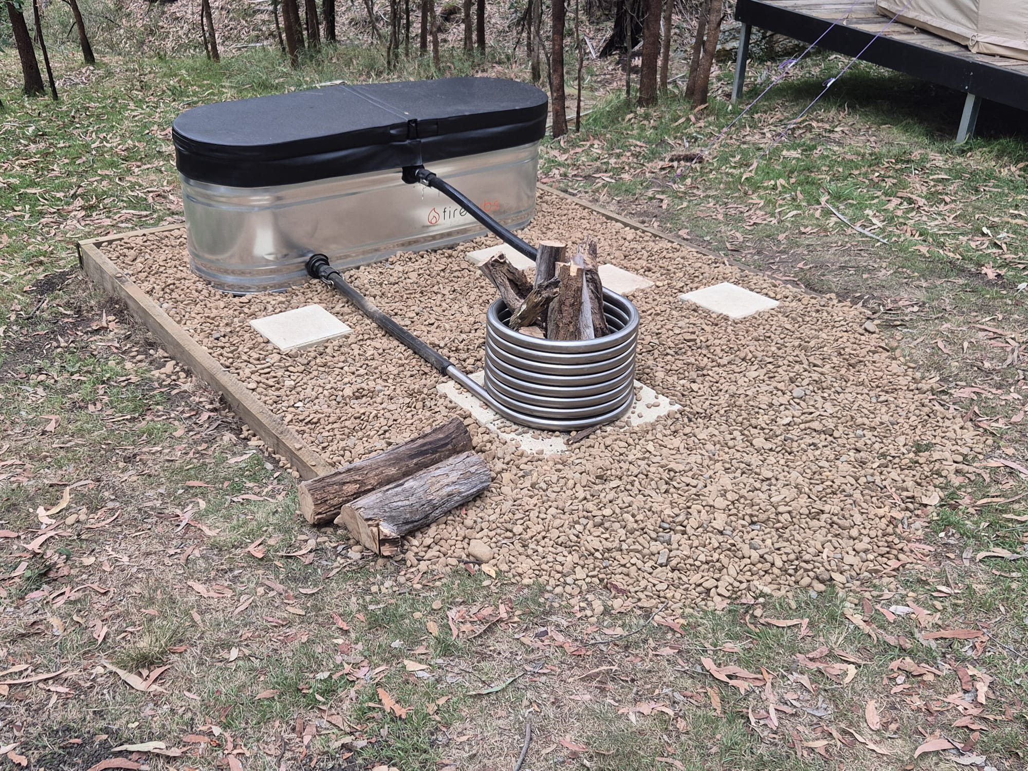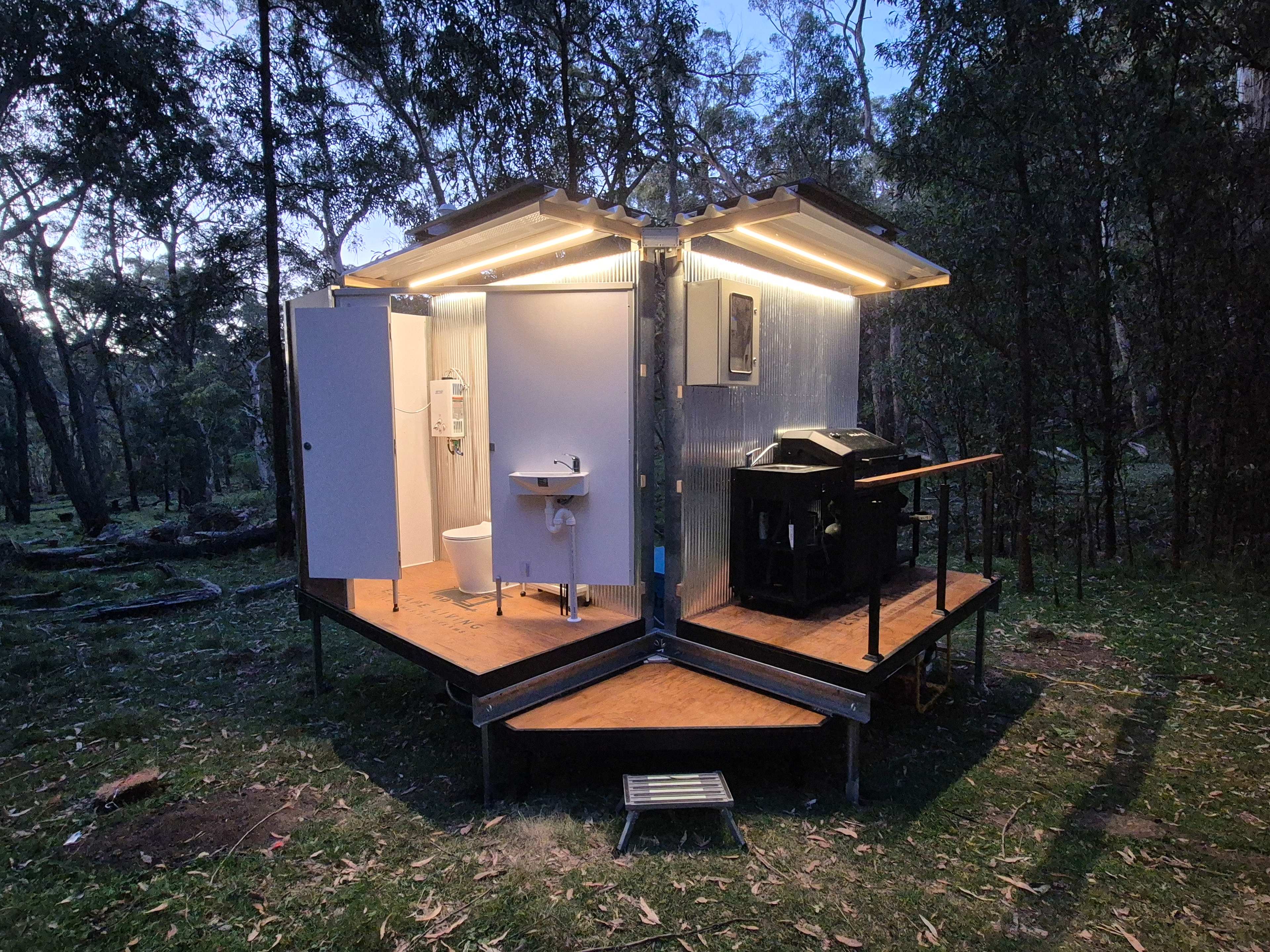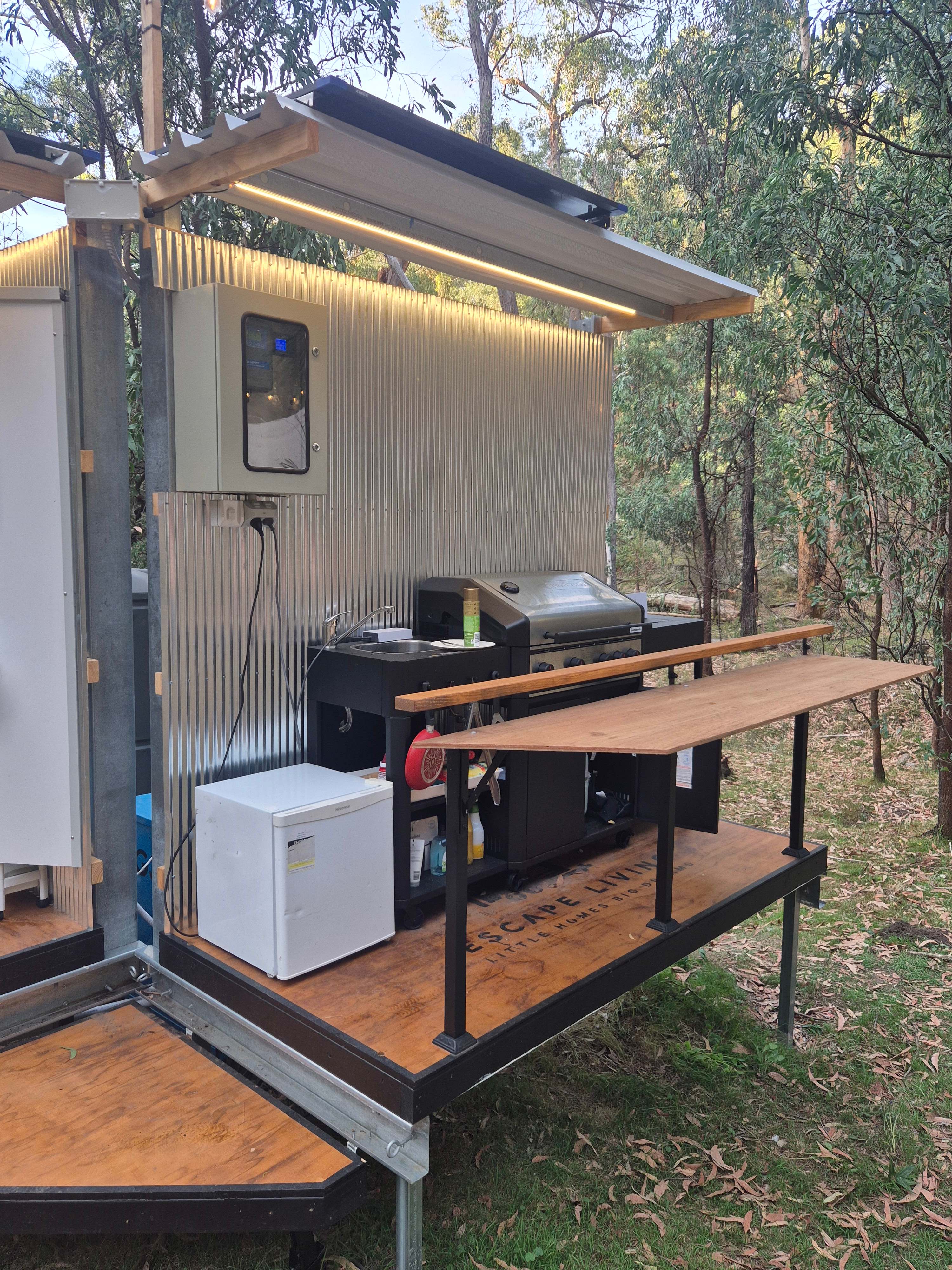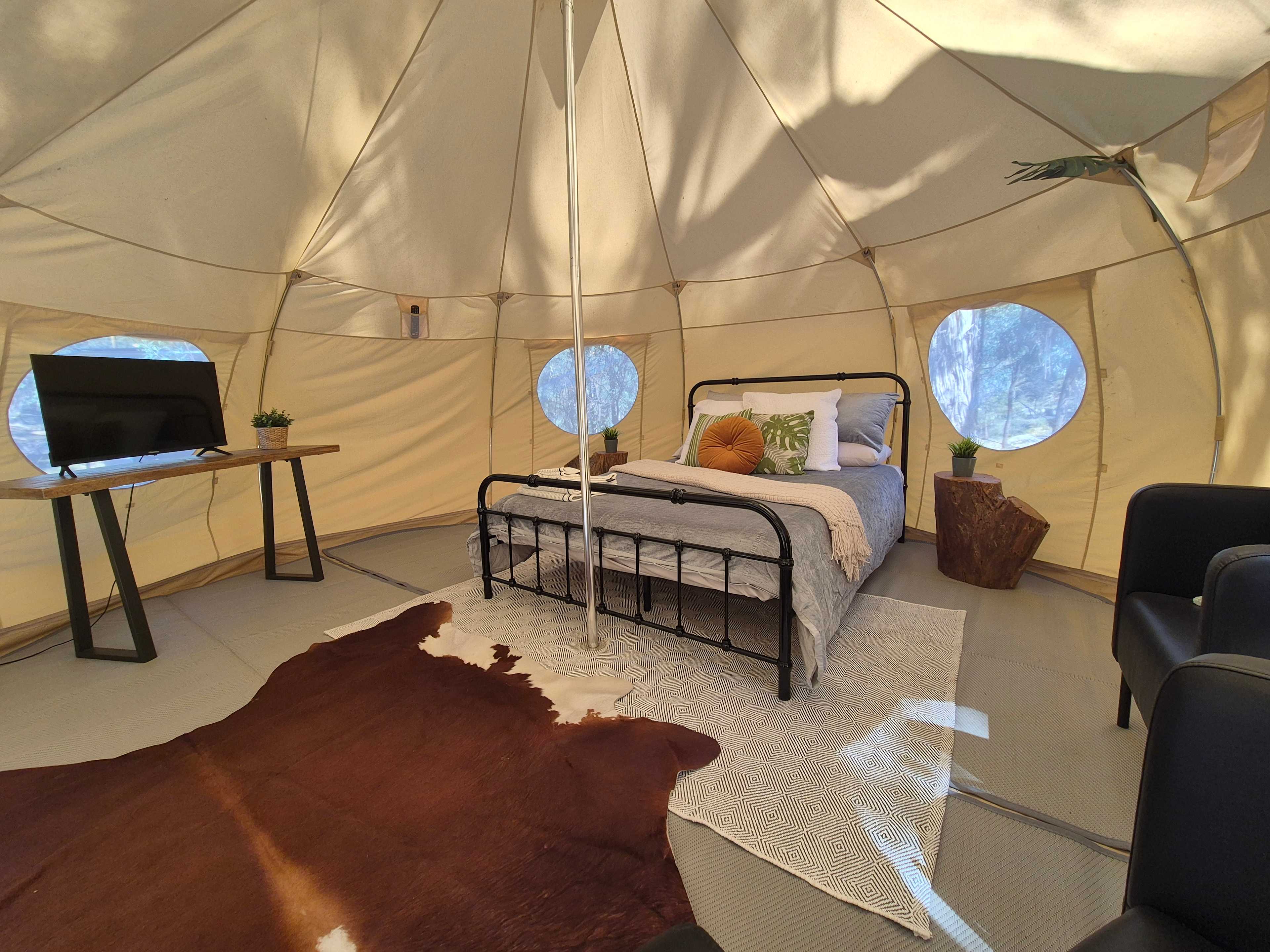 5m Glamping tent beautifully appointed with a full queen bed with linen, TV, wifi and lounge chairs, can sleep 4 in tent (guests to bring extra bedding for tent or swags etc for outdoors) Outdoor kitchen with 5 burner gas bbq, outdoor bathroom with gas hot water and shower, composting toilet (like a real toilet just add sawdust instead of flush), hand basin, Led lighting. Wood fired hot tub, fire pit. firewood provided for both. Site is solar and battery powered and will cope with lighting and small devices (phone charging, TV) but not heaters or cooking appliances.