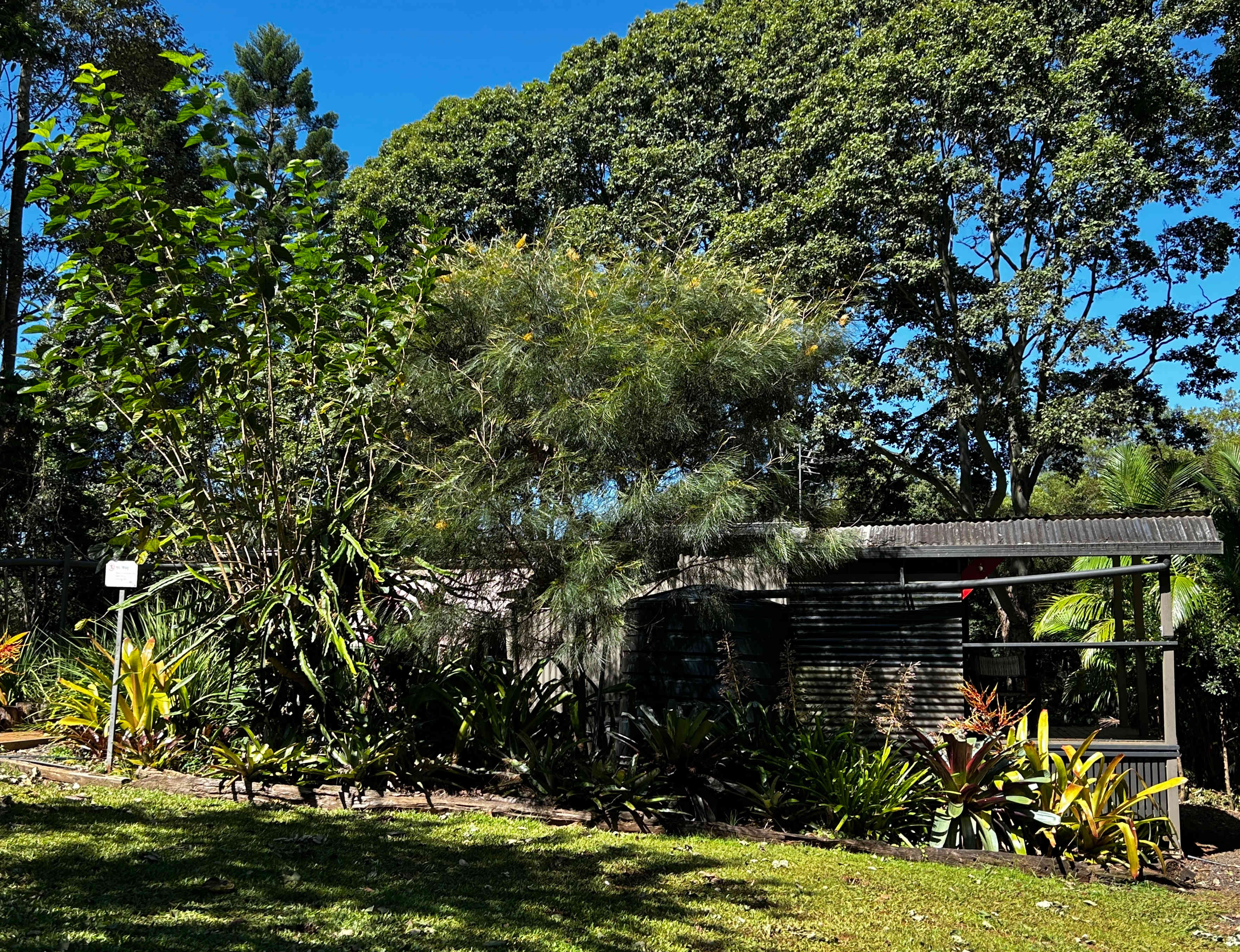 Our property is located in the hinterlands of Byron Bay Shire. We are surrounded by national parks…Nightcap Ranges, Goonengerry National Park and the Whian Whian Nature reserve. Protestor’s Falls and Killen Falls are within easy driving distance. Minyon Falls is a 10 min drive. Within a 30 minute drive in any direction you can be in Lismore, Byron Bay and Mullumbimby. The Northern Rivers Rail trail is a 35 minute drive away and the Lismore Rail Trail under 30mins. On-site accommodation provide is a cabin as a lounge/TV area, a caravan (with double bed) and a fully equipped kitchen, outside fully enclosed shower, wash basin and washing machine, a drop toilet on the front verandah. The caravan is totally cover with by a roof. The cabin has a front verandah overlooking the property and a rear door to access the caravan and bathroom. Linen and blankets are not provided. Dogs are welcome but your dog will need to chicken friendly as we do have free roaming very friendly hens that enjoy wandering area the caravan and cabin. Cats or birds are not welcome.Our site is situated at the end of our property about 50 metres from the main house but totally separate and private. The caravan and cabin our interconnected and surrounded by gardens. Beyond the caravan is the native fruit garden which is surrounded by an open grassed area. Our chicken coops are close but we DO NOT have a rooster to disturb your rest.
