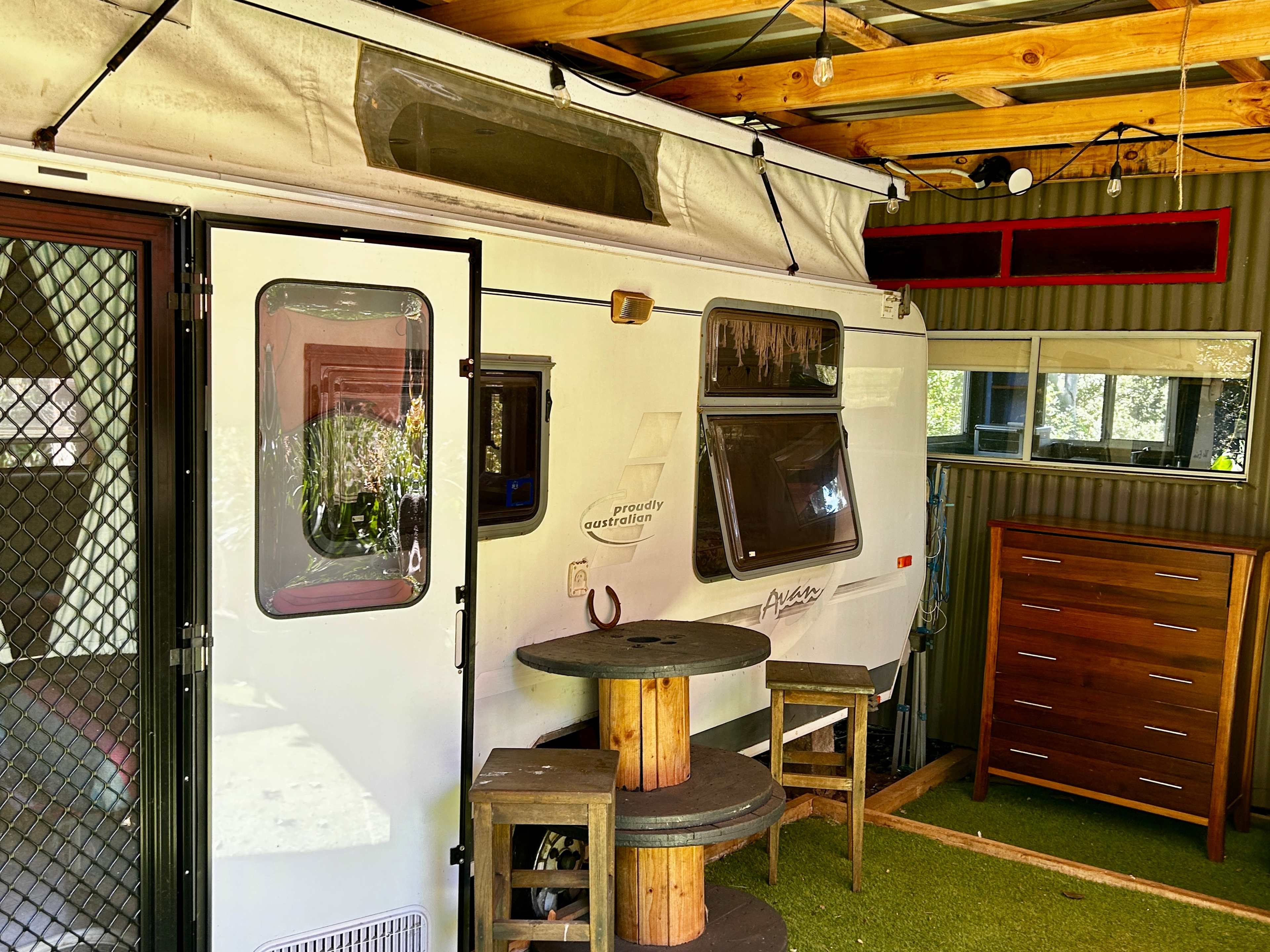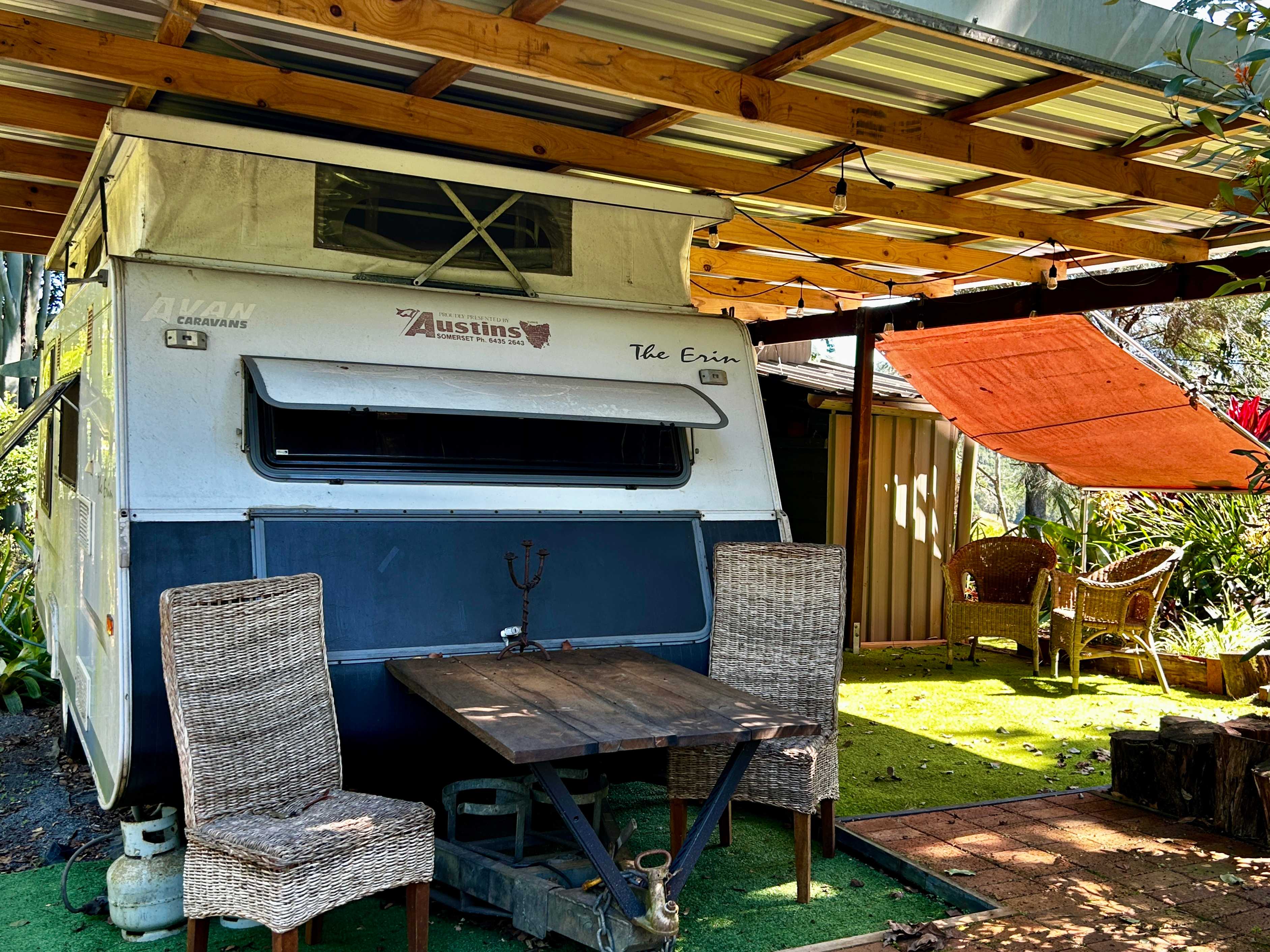 Our site is situated at the end of our property about 50 metres from the main house but totally separate and private. The caravan and cabin our interconnected and surrounded by gardens. Beyond the caravan is the native fruit garden which is surrounded by an open grassed area. Our chicken coops are close but we DO NOT have a rooster to disturb your rest.