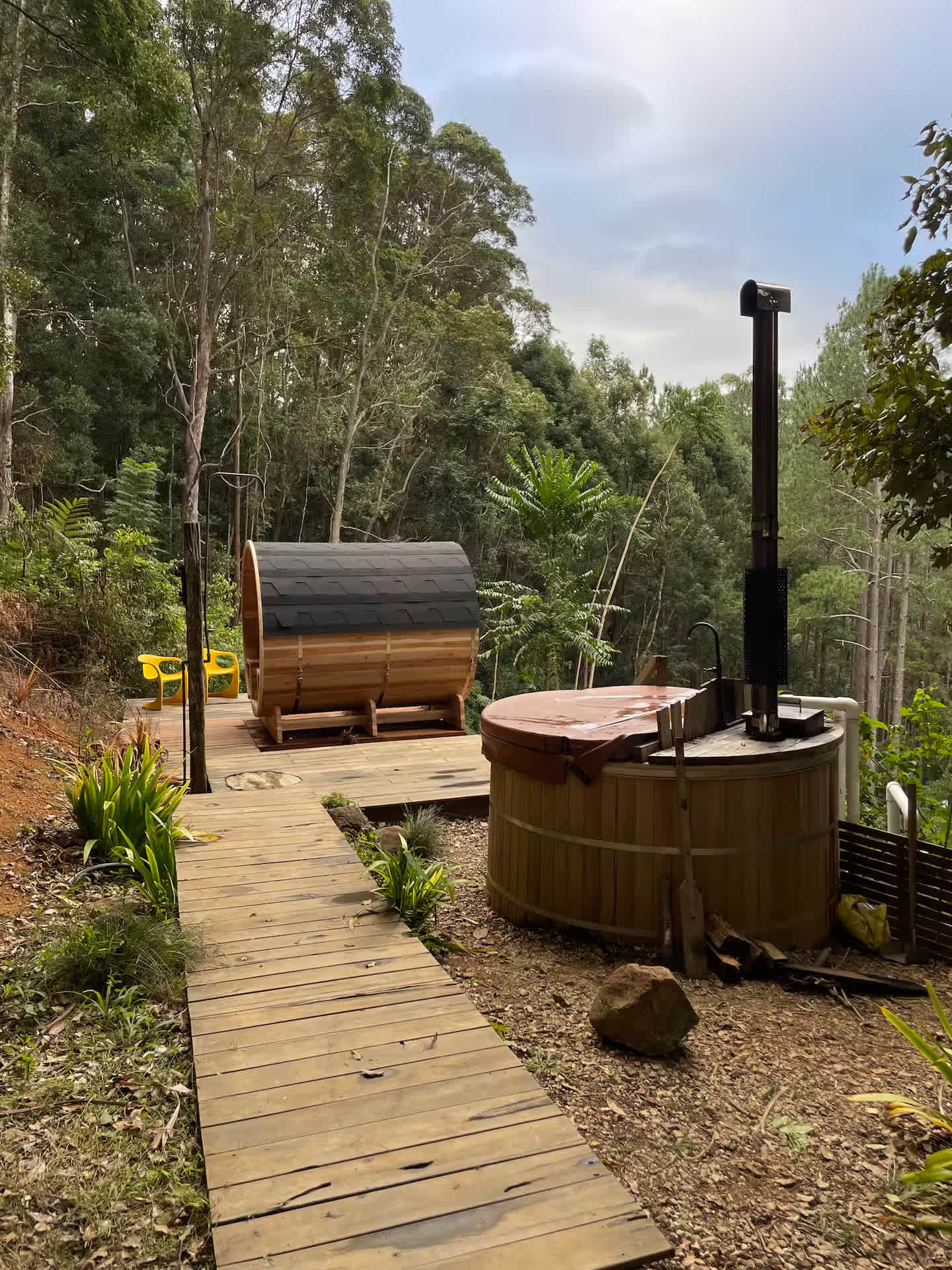 Welcome to Koru Sabi Lodge, your very own rainforest retreat. Located on 20 acres in Upper Burringbar, we have two cabins available for you to book: Pine Cabin (sleeps up to 5 people and has a private sauna and wood fire hot tub) and Tallowwood Cabin (sleeps 2 and has a private sauna) See more pictures and videos on our IG: @koru_sabi_lodge. You are: - 5 mins to the General Store & Natural Wine Shop - 15 to the nearest beach - 20 to Brunswick Heads - 30 to Byron Bay - 40 to Gold Coast airport Just minutes from your site you’ll find the Northern Rivers Rail Trail for easy walking and biking along scenic tracks, historic rail-tunnel stretches perfect for explorers, the leafy Masterson Park Burringbar for family picnics and strolls, tranquil bushland in Mooball National Park, and diverse rainforest hikes with mountain views in Wollumbin National Park — all great ways to enjoy nature right near your stay.