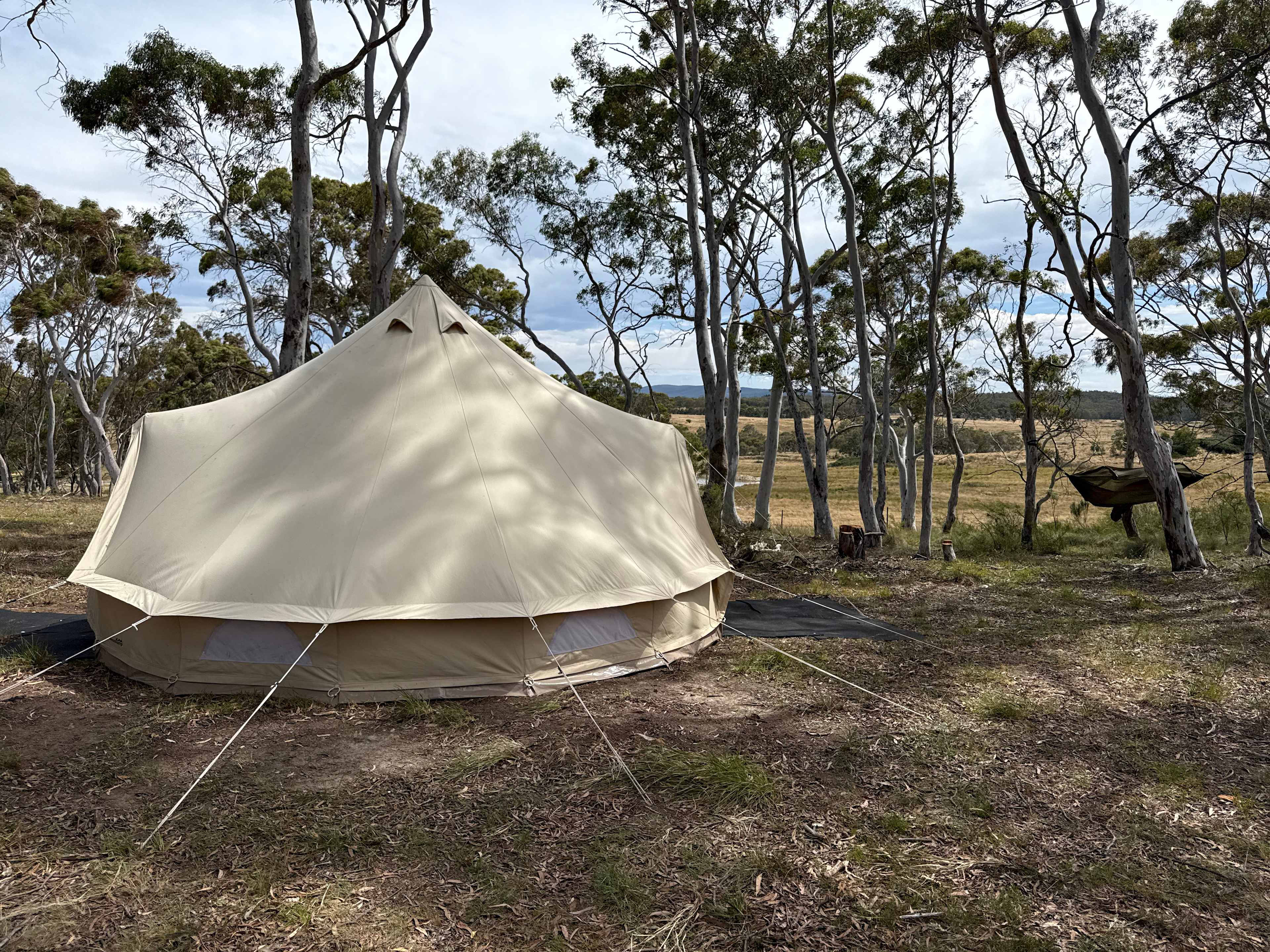 Nugget & Brumby’s sits on 83 acres of box gum grassy woodlands, natural springs, and open skies near Larbert, an hour from Canberra, between Bungendore and Braidwood on Walbanga country, Yuin Nation in NSW. Once used for grazing sheep and cattle, part of the land is cleared while the remainder is Eucalyptus box grassy woodlands—an endangered ecological community. These woodlands, featuring White Box, Yellow Box, and Blakely’s Red Gum, along with native grasses, herbs, and scattered shrubs, were once widespread but are now heavily cleared, making their conservation vital for biodiversity. One day, this land will host for-purpose events— conferences, retreats, creative residencies, and community gatherings—rooted in sustainability, connection, and care for Country. The tent is part of this vision: completely off-grid, and designed to help you slow down, reconnect, and experience the beauty and stillness of this unique land.