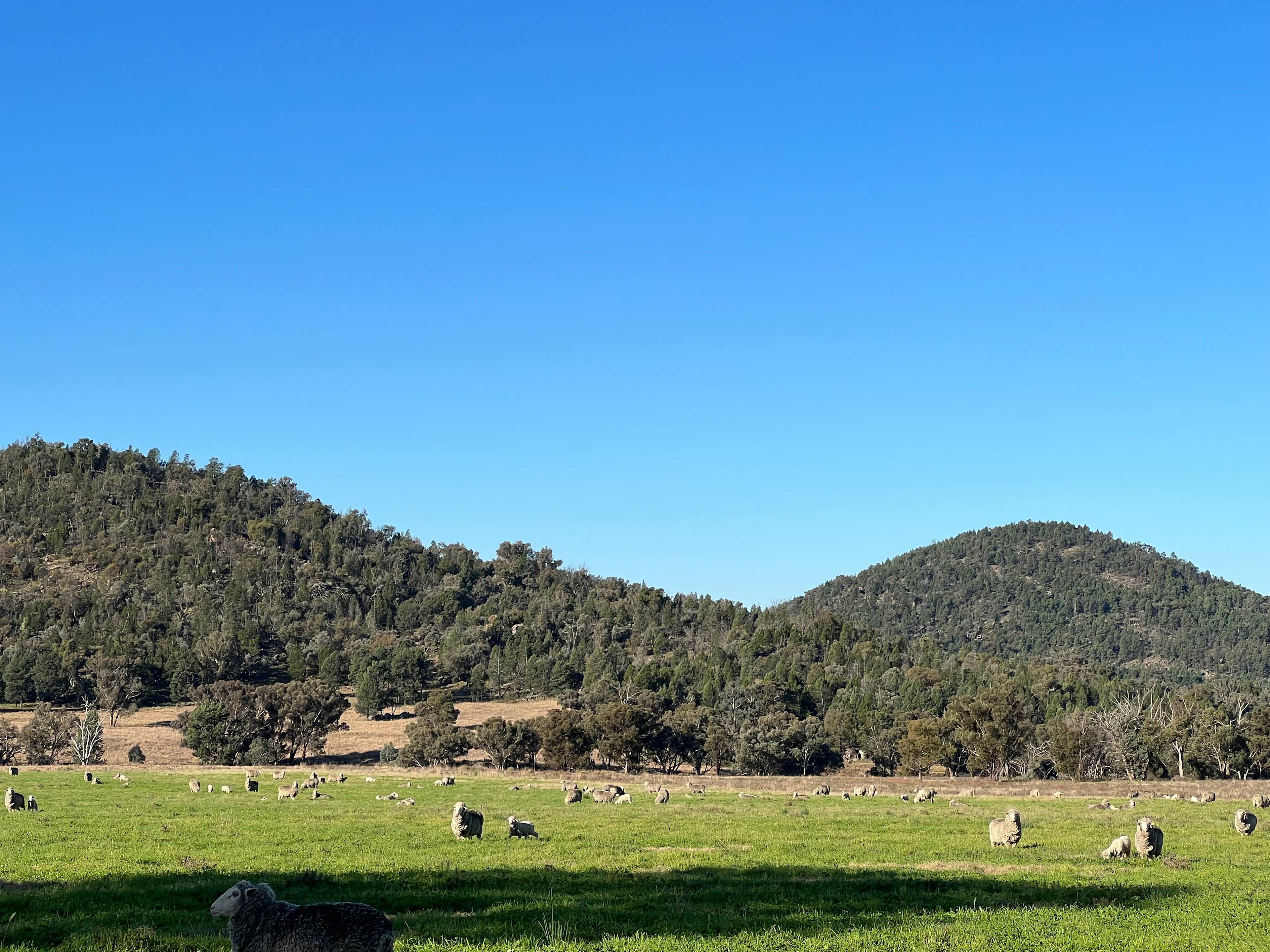 The camping sight has great views, is quiet and peaceful, and is close to the creek and the hills where you can listen to magpies warbling or watch the sheep grazing as you drink your coffee in the morning.
