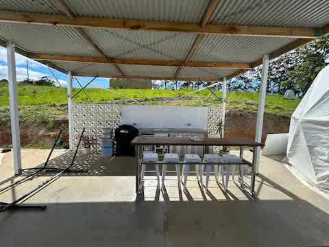 The kitchen area is well-equipped with everything you could possibly need — BBQ grill, plates, cups, cutlery — making it easy to cook and enjoy meals without missing the views.