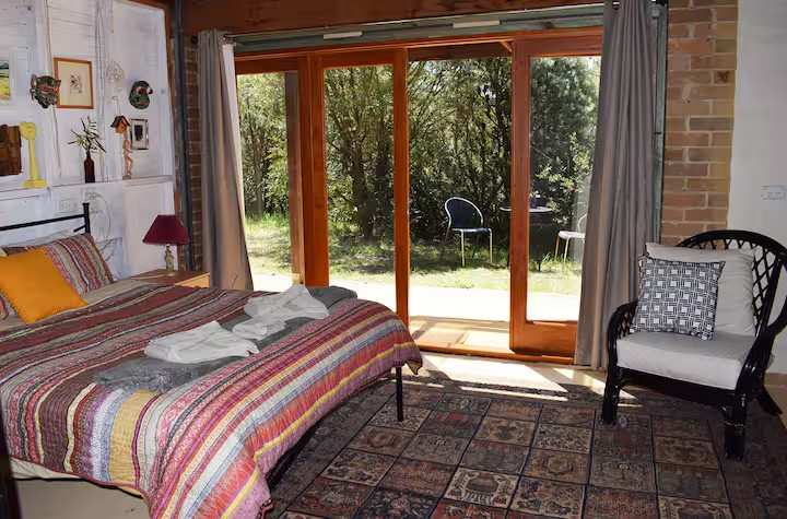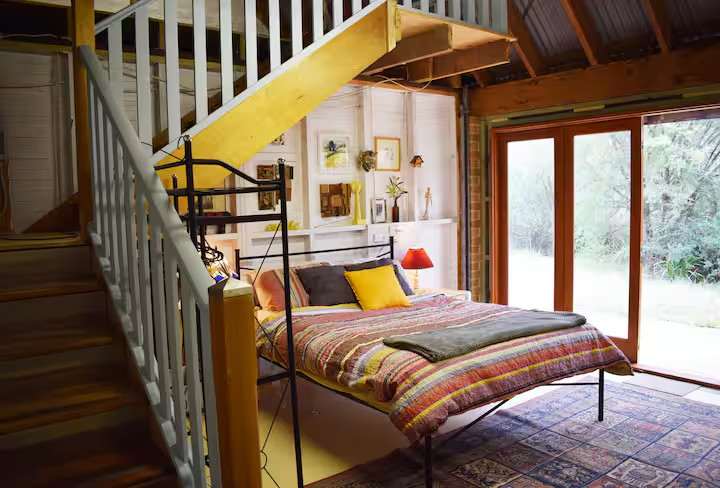 Scribbly Gum Loft Studio is a rustic retreat located in a bush setting on private bushland acreage, there are bush walks, a lake, private lookouts, and artists' studios on the site. The studio features a queen bed downstairs and a double bed up in the loft, ideal for close friends or children - who are comfortable using stairs and sharing the space, or a great space to read and relax. The eco-shared bathroom is located outside the loft along the covered verandah. The space Relax and Rewind in the eco and bushland setting. The Loft features a bush outlook and an outdoor seating area. Enjoy the walks to the lookout and lake on the property. Close drive to famous Wentworth Falls walks and Leura and Wentworth Falls Villages Kitchenette facilities include a bar fridge, sink, kettle, induction stove/hot plate and oven, toaster, pots, pans, tea and plunger, and espresso coffee. There is a table and chairs outside and a gas BBQ. There are 2 bathrooms - One is a full bathroom with shower, toilet, and sink and another separate bathroom with sink and toilet, these are sometimes shared with other guests located on the property. In winter there is a gas heater and outdoor fire pit to enjoy our crisp starry nights! The eco-bathroom is located outside the loft along the covered verandah. A few steps from the studio. There is a sink for washing in your room. Scribbly Gum is set inside the grounds of an eco off-the-grid environmental art center independently running on a large solar system and rainwater. There is a 500m maintained dirt road to the studio. There are walking tracks on the property around the lake and on the lookout. Our eco property has a five-star carbon rating. We welcome eco-friendly guests of all nationalities. Guest access Guests are welcome to explore the nature walks on the property, around the lake, and up to the lookout. Private art classes in painting, mosaics, and private yoga by arrangement Other things to note A 25-minute walk from Wentworth Falls Station. Bus and taxis available, Pick up with prior arrangement.