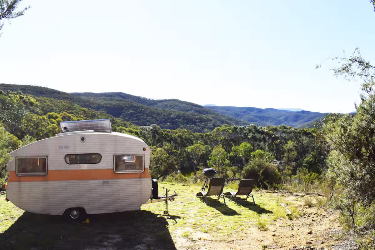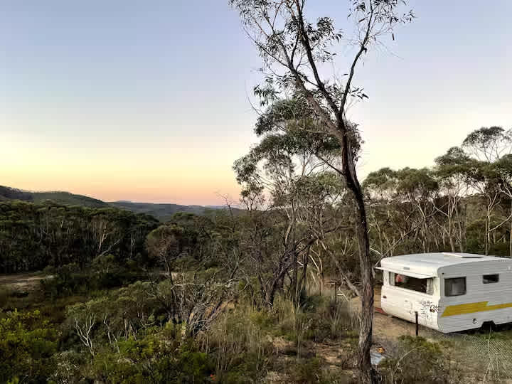 Vintage Vues - Cute, Quirky and Eco with Forever Views. 'Meg' the 1959 Globe Caravan is positioned with vistas across the stunning mountain ranges. Soak up the sunrises and sunsets in a cosy 50s style. The caravan features a seating area /kitchen with a gas cooker and an esky for cold things. There's an outdoor fire pit and gas BBQ for enjoying dinner, drinks and unforgettable sunsets! The bathroom and shower block is a 350-metre walk. The caravan is off-grid, solar-powered with bottled rainwater. The space Enjoy an off-grid glamping experience with breathtaking views. Set at the top of a large acreage property with bush and valley views and is ideally located between Wentworth Falls and Leura. This cute and quirky accommodation is suitable for guests who want a unique nature-style experience. The caravan is an original Globe caravan built in South Australia. The caravan has a solar panel for lights and charging devices and a solar-powered lantern with speakers for Bluetooth connection. PLEASE NOTE One small dog is welcome, but dogs cannot be left unattended in a caravan. The kitchen is equipped with 20 litres of water for drinking, cooking and washing. The kitchen is stocked with plates, cups, glasses, pots and pans The bed is a cosy double fitted with sheets, two duvets and woollen blankets, ideal for singles and romantic stays. Fire Pit (Autumn /Winter only) Firewood is provided for 1 -2 fires in the outdoor fire pit Other things to note Vintage Vues is suitable for agile guests who want a camping-type experience. There is no heating in the caravan, so you need to bring warm jackets, thermals, beanies and gloves in cold weather. The Caravan has only USB power outlets from Solar Panels, for lights and charging devices. There is a BBQ and Fire pit for wonderful sunrise and sunset views. Relax and unwind in nature, detox from technology with no internet and limited mobile reception ( Telstra Optus and Vodaphone good) just stones through to the gorgeous villages of Wentworth Falls and Leura. With a beautiful lake to swim in summer and the sounds of frogs at night you will be sure to feel refreshed!