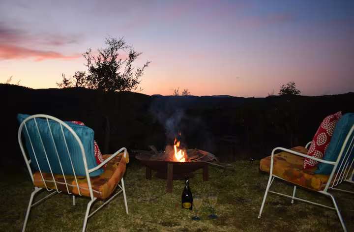 'Sunset Skies' is a 1960s Caravan positioned with vistas across wetlands and stunning mountain ranges. Soak up the sunrises and sunsets in cosy 60s style, featuring a seating area and double bed. Included in your stay is the separate studio building with a cosy indoor fireplace, kitchenette, bar fridge, lounge and creative space for painting, reading and relaxing. Outdoor fire pit and BBQ pavilion. The bathroom and shower block is a 350-metre walk. The caravan is off the grid. The space Enjoy an off-grid glamping experience with breathtaking views. Set at the top of a large acreage property with wetland, bush and valley views. Ideally located between Wentworth Falls and Leura. This cute and quirky accommodation is suitable for guests who want a unique nature-style experience. The caravan has a cosy double bed and seating area. The caravan is off-grid has no power and is fitted with portable lights. PLEASE NOTE One small dog is welcome, but dogs cannot be left unattended in a caravan. Included in your stay is a separate studio with solar power for charging devices and a kitchenette, bar fridge, toaster, cooking element and kettle. The kitchen is equipped with plates, cups, glasses, pots and pans. The bed is a cosy double fitted with sheets, duvet and blankets, ideal for singles and romantic stays. Fire Pit (Autumn /Winter only) Firewood is provided for 1 -2 fires in the outdoor or indoor fire pit. More firewood can be purchased locally at the Wentworth Falls BP. Other things to note Please Note - 'Sunset Skies' is suitable for agile guests who want a camping-type experience. There is no heating in the caravan and no power, so you need to bring warm jackets, thermals, beanies and gloves in cold weather. There is a BBQ pavilion and Fire pit for wonderful sunrise and sunset views. Relax and unwind in nature, detox from technology with no internet and limited mobile reception ( Telstra Optus and Vodaphone are good) just stone through to the gorgeous villages of Wentworth Falls and Leura. With a beautiful lake to swim in summer and the sounds of frogs at night you will be sure to feel refreshed!