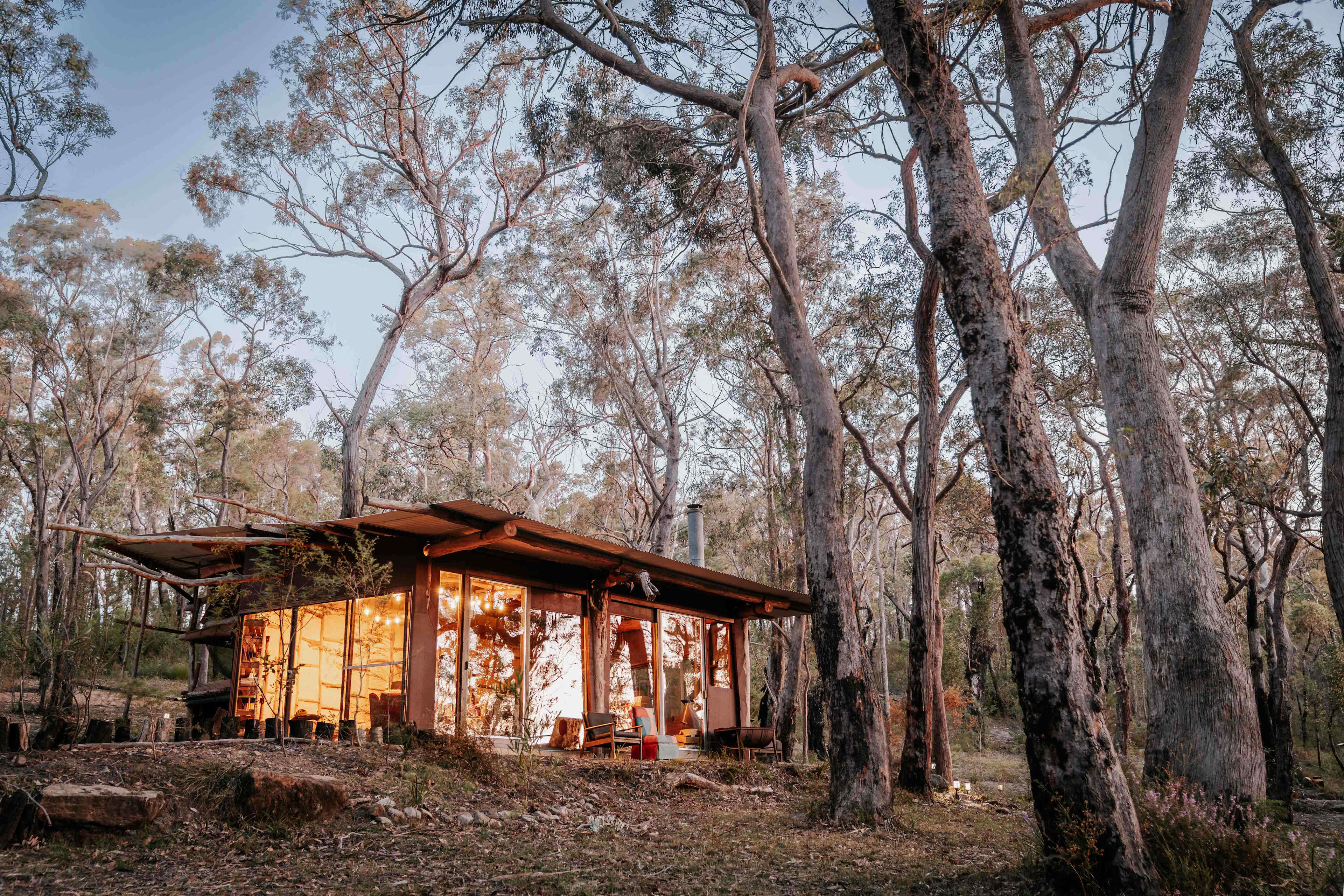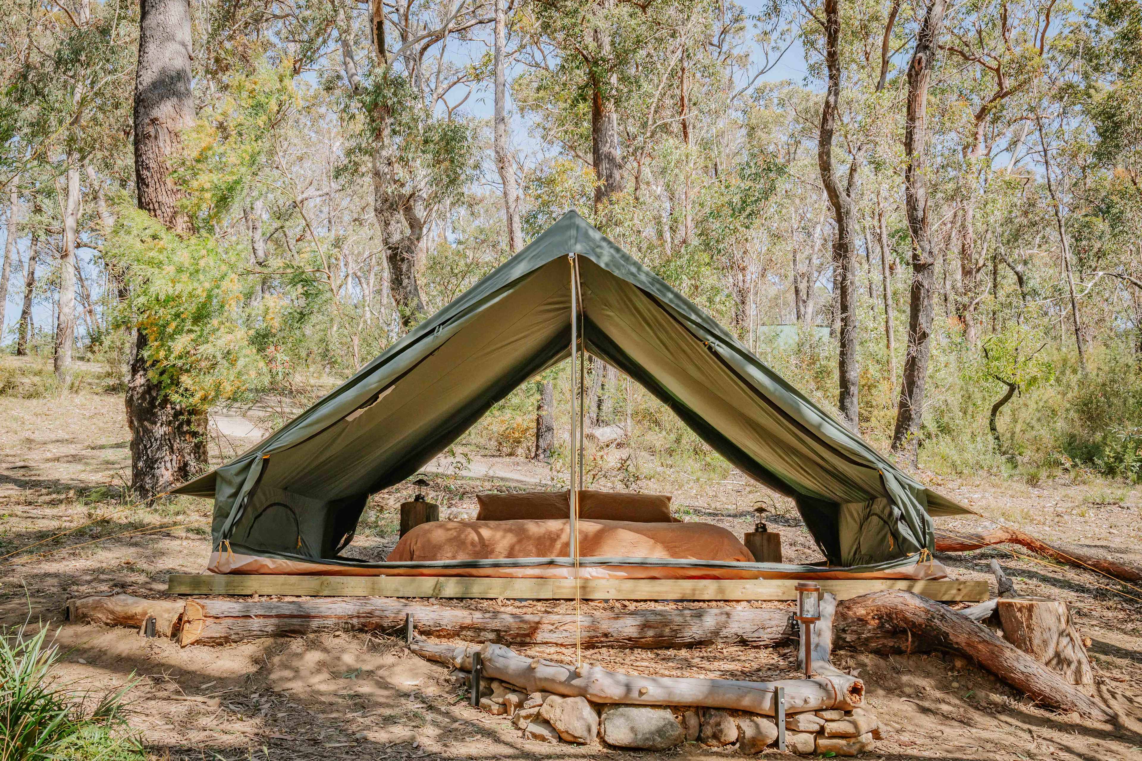 Prices reflect the Grounded Getaway Package which includes 2 night minimum stay, welcome charcuterie board and local non alcoholic cider, induction walk and glowworms tour per person. Wollemi Ridge Retreats is a secluded bush property in Bilpin, on the edge of Wollemi National Park in the Blue Mountains. Surrounded by native forest and ridgeline views, it offers a quiet, off-grid escape for those looking to slow down, reconnect with nature, and spend time outdoors. Guests stay in separate, thoughtfully spaced glamping setups, including safari tents and tipis, each positioned for privacy while still being part of the wider retreat environment. Inside, you’ll find comfortable beds with quality linen, simple furnishings, and soft lighting. Designed for a grounded, comfortable stay. We also offer our unique outdoor bunk setup for groups of up to six, evoking a sense of shared experience and the simplicity of an open-air sleepover. At the centre of the property is a communal area with a fully equip kitchen, dining space, and lounge where guests can cook, eat, and gather. There is a shared fire pit, along with communal bathroom facilities including hot showers and toilets. The surrounding bushland invites you to explore, walk, or rest at your own pace. We also offer optional day experiences, including bush walks and seasonal nature-based activities. Wollemi Ridge can be experienced in different ways. Our Grounded Getaway is a flexible, self-guided stay, while our hosted bush retreats offer fully catered stays with meals and guided experiences included. Wollemi Ridge is best suited to those who value nature, simplicity, and a slower pace. A place for calm, connection, and time away from the day-to-day.