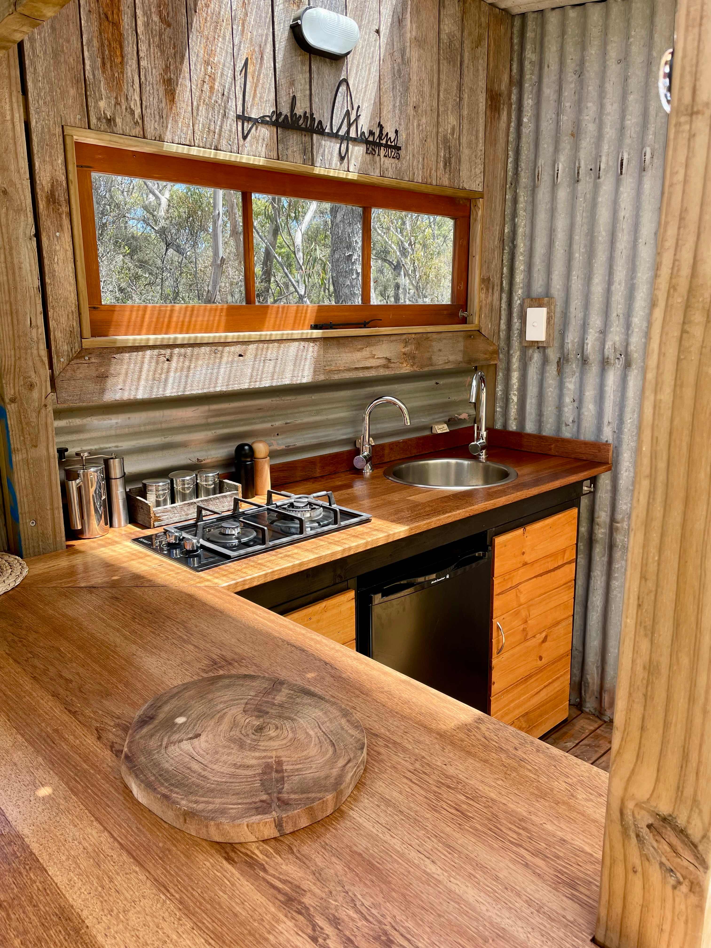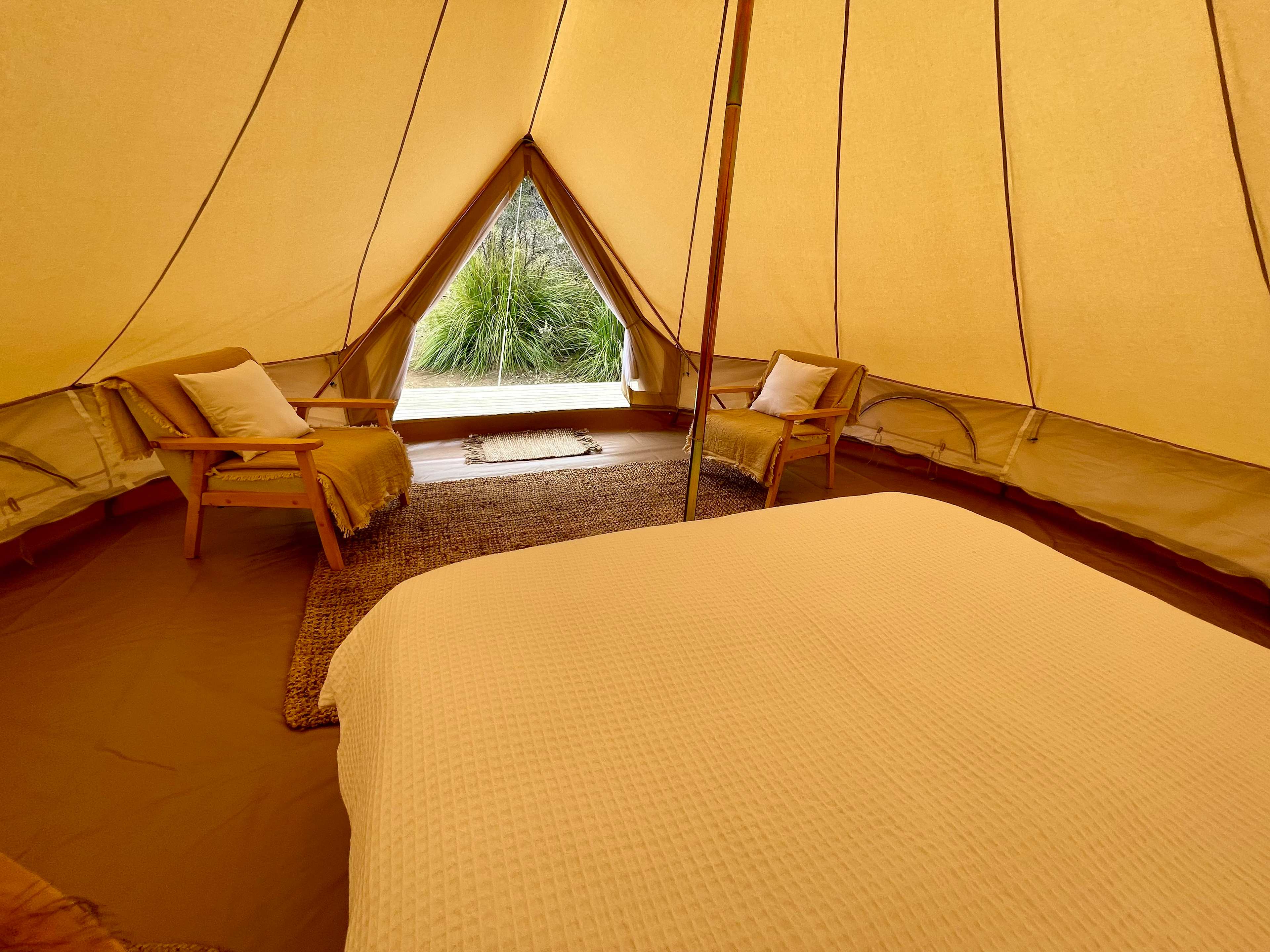Leeaberra Glamping is a unique private 25 acre property that is located inside the Northern end of the Douglas Apsley National Park. We offer luxury off grid glamping in multiple bell tents and our premium tent Glitz Camp with floor to ceiling windows to immerse yourself in nature. Each tent comes with a private outdoor tub. Guest can relax in our one of a kind luxury wood fired sauna. Explore the National Park, with lots of bush walking trails leading to waterfalls or hire one of our mountain bikes and hit the trails.Inala - Queen bed - Private outdoor tub - Shared, shower, toilet, glamp kitchen, fire pit and sauna.