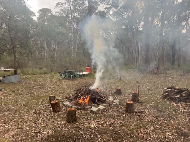 About 9 acres of native forest, bounded on 3 sides to thousands of acres of Enfield & Ross Creek State Forests. Kangaroos, possums and many native birds live in and around my property. Wake up to bird sounds: Kookaburra's early morning call. Green & Red Rosellas and clever Magpies come to feed. Spotted pardelotes flit around bushes and trees. Occasional gangs of black Gang Gang Cockatoos pick at cones on the tallest trees. Kids can collect kindling or pinecones or use the playground on the property; swing, slide, seesaw... Plenty of historic walks from 1850’s goldrush times. Follow the water “races” down toward the mines. Good bike riding. Star gazing. Historic village of Smythesdale ten minutes away. Beautiful Ballarat 15 minutes to north east. In the bush you can feel away from civilisation… it was my retreat to nature during Covid era! Heals Nature Deficit Disorder! Some say it feels like a McCubbin painting of pioneers… Be nurtured by Nature! 4 campsites: Kookaburra Camp: ($77 per night per couple) Walk 50 metres on clearly marked track from parking area near main Kabin. Already set-up Bell tent, double mattress plus space for 1-2 singles. Bedding available on request. Chairs/ hammocks available. Solar lights. Short walk to fire pit. Wood plentiful. Sauna nearby & available as Extra. Kookaburra call "alarm" at 6.45-7.15am. Rosella Camp: ($44 per night) Easy access + flat site for self-contained Caravan or RV ( up to 10 metres) with access to circular drive exit. Use of communal fire pit included. Magpie Camp: ($77 per night) Existing modern Tent, double mattress plus space for 1-2 singles. Bedding available on request. Pre-dug fire pit. Solar lights. Wood fired Sauna (as Extra) adjacent. Cockatoo Camp: ($44 per night) Flat and accessible site for self-contained RV up to 8 metres, adjacent to 65kms State Forest, pre-dug fire pit, solar lights. Composting toilet is available for tent sites guests,, at varying distance from tent sites. This is a digital detox zone. No reliable wifi or mobile reception. Starlink for emergencies at main Cabin. Families of wild (not tame!) kangaroos & native birds live near or on my nature retreat- they have priority and are spooked by loud noise or dogs. Sauna available as Extra.Easy access RV or caravan site close to front gate of property. Can drive Caravan forward - through to circular driveway - for easy exit. Grassy flat site with native trees.