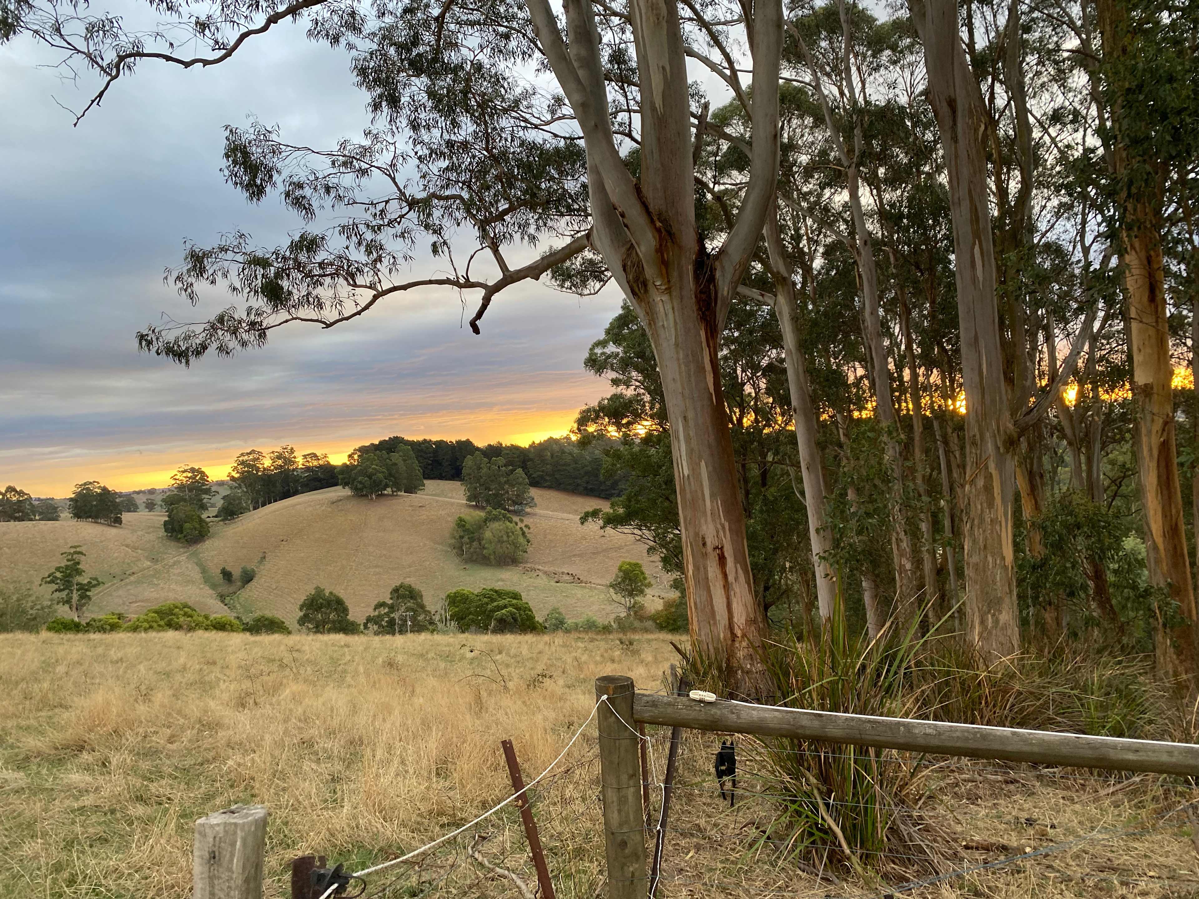 Kookaburra Nursery Campsite is suitable for tents up to 3m diameter and has an adjoining rustic shelter to protect campers from any weather conditions. The site is in the middle of a woodland of local Strzelecki gum trees with hollows used by local kookaburras when raising their young. Campers will need to be self sufficient for power, water and toilet facilities. Limited rainwater is available but must be carried 10m to the site. Please contain your own rubbish, but you are welcome to dispose of rubbish bags in the bins near the carpark. Cars can be unloaded of camp gear 10m from the campsite, and car parking is 85 m away. Two camp tables and a couple of arm chairs are provided in the shelter for campers to use. Pets are welcome at the campsite, but must be kept within the immediate vicinity. We recommend that pets be on a leash when leaving the campsite for a walk, as wallabies, deer and wombats frequent the camp areas. The car park is in the farm yard near the Host's house, but neither are visible from the campsite. No other houses or sheds are visible from the campsite.