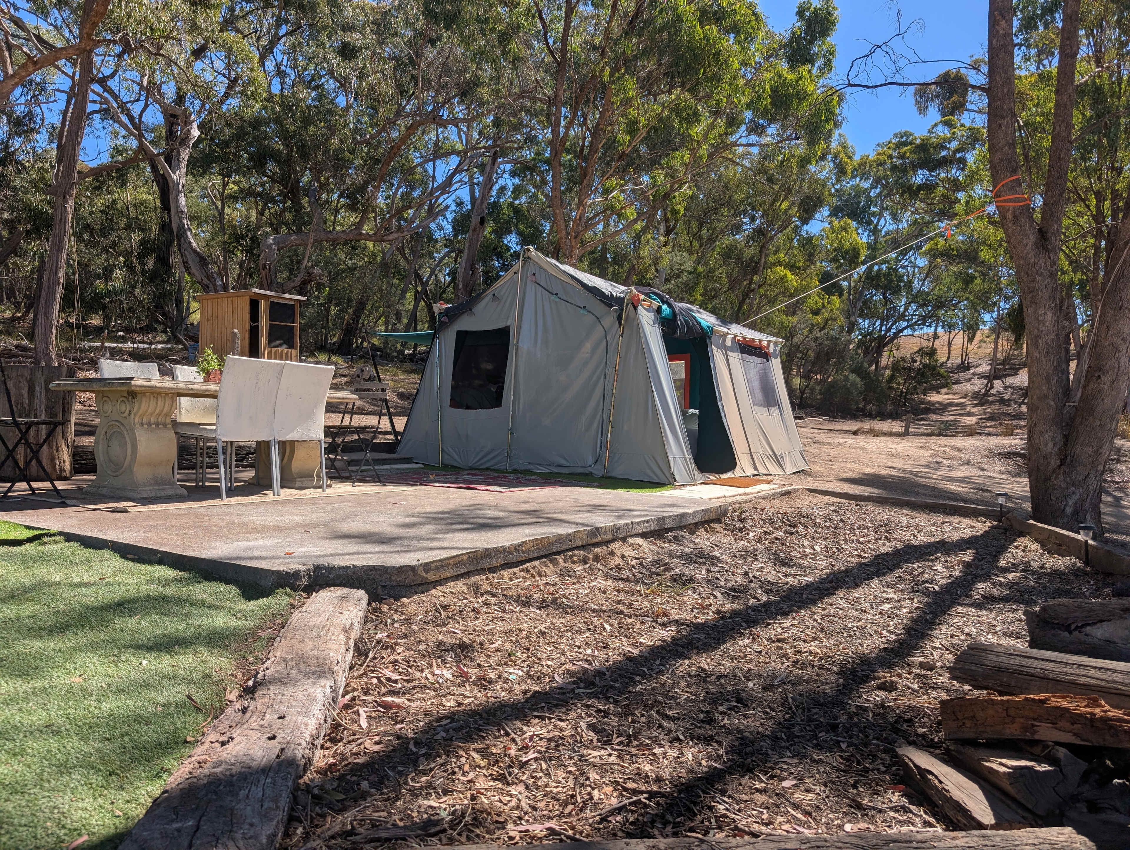 Tucked in a Central Victorian valley is Liberty Flat camp. Perfectly placed between Malmsbury, Taradale, Castlemaine, Harcourt Kyneton and Daylesford just 20 minutes away. It’s an ideal base for exploring the region—though many guests find the real joy is mother nature's work with the Cascades Turpin falls and Vaughn springs just to name a few. Liberty Flat is a retreat in the truest sense. As the light fades, return to canvas cabin campsite. This is camping without the stress and planning, thoughtfully prepared sites that are personalised to suit, designed for comfort and simplicity. You bring the curiosity—we’ll handle the rest. Beds, equipped outdoor cooking, running water,lighting and spaces to relax and breath in the eucalyptus air. The campsites are secluded, with walking tracks and bordered by a running creek for much of the year. Valley views unfold around the camp, with a peaceful dam at its centre. Nature does the talking, and time listens. Sites are prepared to cater to the romantic couple family gatherings, groups mates escapes, and are ideal for small classy celebrations, Liberty Flat adapts to your occasion. If your group grows beyond our pre-pitched accommodation, extra guests are welcome to bring their own tents and pitch together on site—keeping everyone close, connected, and comfortable. Liberty Flat is where you slow down and remember how good simple things can feel. Arrive curious. Leave restored.