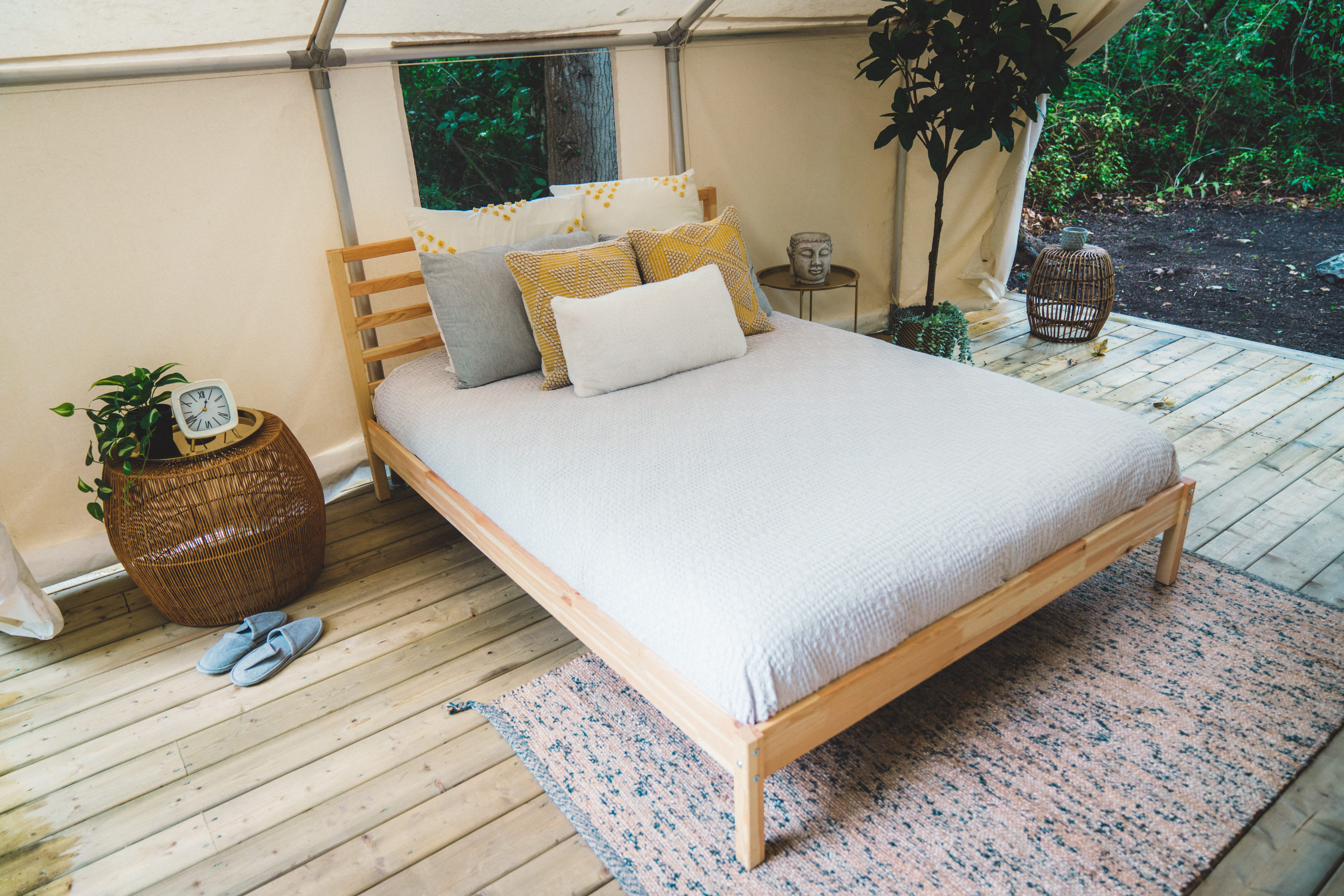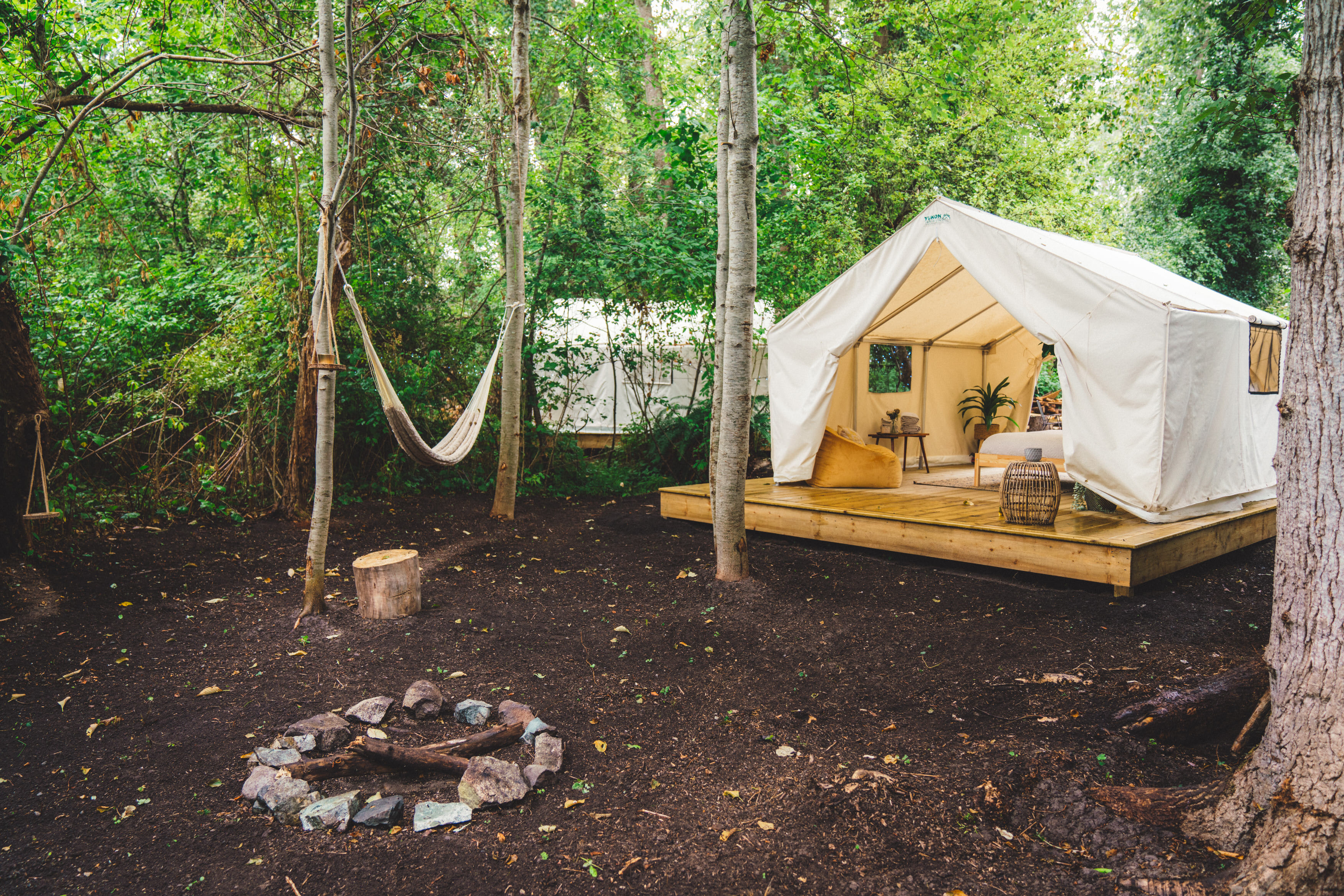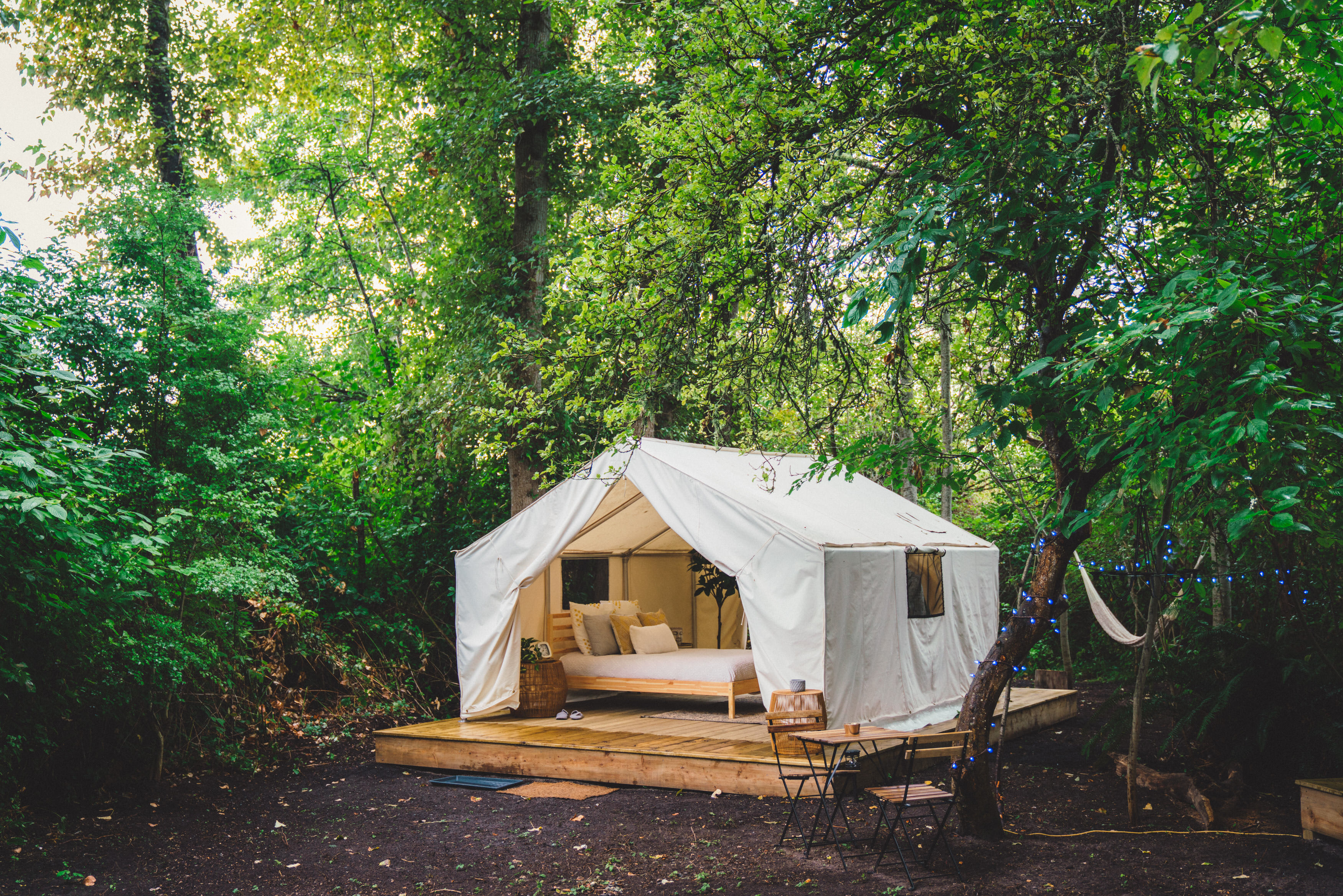 Walking across the green grass to the back of the gorgeous property, one enters a truly amazing setting. Sheltered on all sides by lush trees, the two canvas tents are supplemented by essentially everything one could need; multiple sitting areas, multiple fire pits with firewood, a clean porta-potty, a solar shower, and essentially a full camp kitchen (just bring your own plates, cutlery, and water). The tents themselves are tastefully equipped with a comfortable bed, towels, a beanbag chair, and decorations, making you feel right at home. Throughout the camping area are a number of further decorations, truly fleshing out the boho feel.