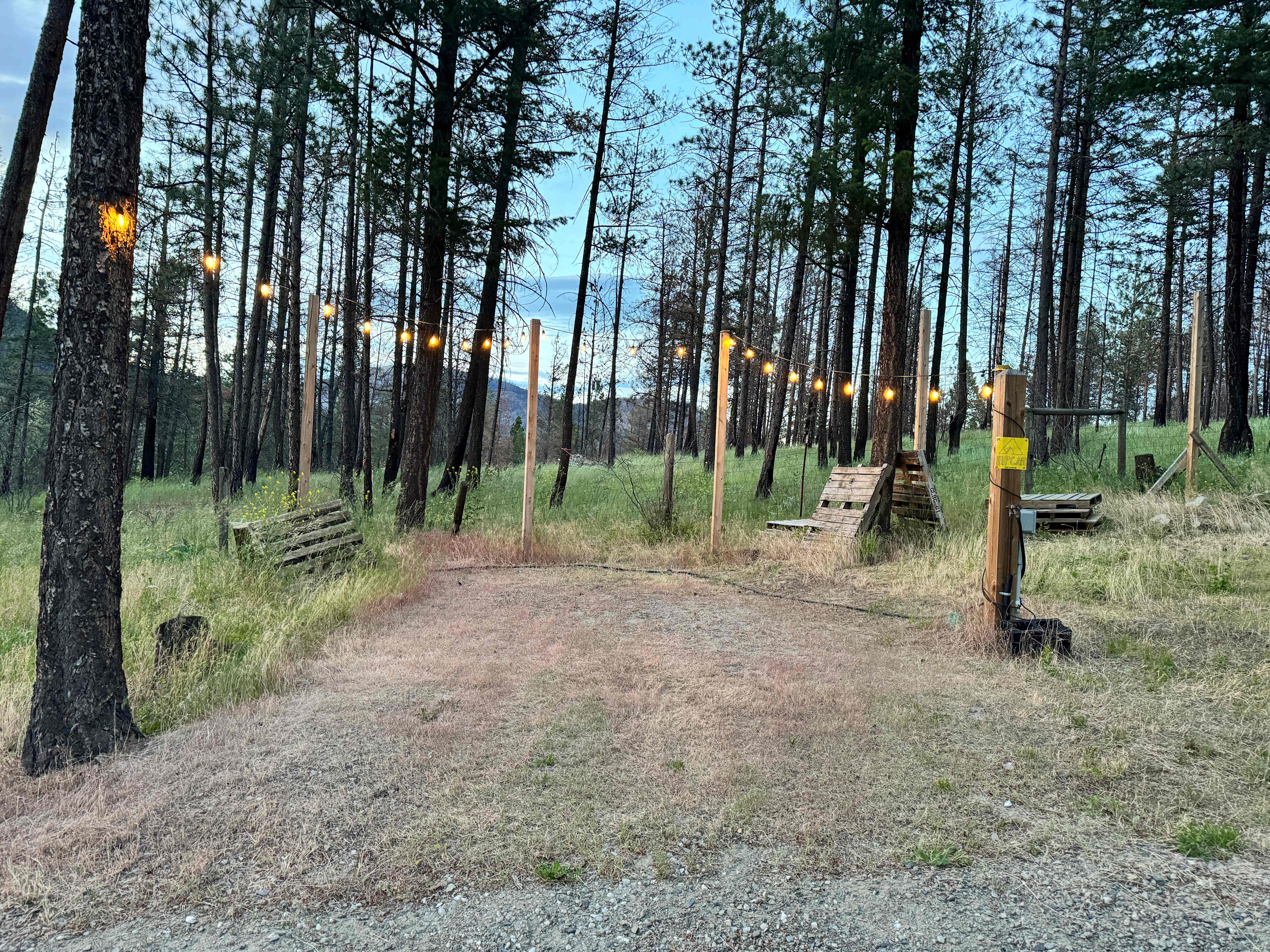This site is a site that overlooks my beach vb courts! It’s under some large pine/fir trees and is the most shady area we have on the property. We can run an extension cord for you and I will provide a large bottle of water for guests! We have moved into a trailer on the property as we rebuild our home so we live there and are quiet people so we expect quiet guests. We also will allow access to an outdoor kitchen area! Please bring your own plates and utensils. We will provide some cooking utensils as needed.
