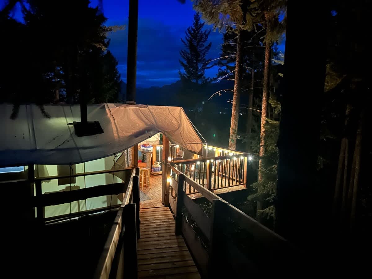 ONLY 9 km from Golden's center! This unforgettable nest high above the forest floor is your opportunity to take flight. Endless trails and spectacular views give you access to nature in a whole new way. Explore on foot, bike or snowshoes(provided), then spend your evening up on the deck around the tree-top propane fire pit. Cook your meals in the outdoor kitchen or on the wood burning stove in the Trapper's Tent. Eat inside or out under the sky, then curl up in the luxurious queen bed to rest up and do it again tomorrow! *You are booking an off-grid TENT high above the ground with a private OUTHOUSE. If you enjoy camping, this may be one of your most amazing experiences ever! ACCESS requires - gentle off road driving (4 wheel drive best in winter) - forest walking (5 minutes) IN COLDER SEASONS: - Start and stoke the wood burning stove for your heat, both day and night (with a little buddy heater to to take the chill off while you get it going) We DO NOT provide - electricity or internet - running water We DO provide OUTHOUSE: designed to make you smile - solar motion light - sanitizer, toilet paper - lockbox for valuables - snowshoes in winter OUTDOOR KITCHEN: under cover on the outdoor deck with solar light - two burner camp stove with propane - pots, utensils, serving dishes, kettle, coffee percolator - potable water, wash station with supplies - spices, tea, oatmeal, margarine or oil - 2 smell proof 5 gallon pails with bags for temporary garbage, food and scented item storage PROPANE and FIRE BOWL: - outdoor use only, on uncovered deck ELECTRIC FENCE 3 season: - surrounds the bridge, outhouse and treehouse to deter any bear INSIDE all year long: - queen bed with linens, pillows - bedside lights - wood burning fireplace with wood, starter and tools *** NO BONFIRES *** in the forest - hanging solar light with switch - table and two chairs *Emergency exit with rope ladder *Carbon monoxide detector YOU ARE RESPONSIBLE FOR: - packing lightly - bike security (ie: a lock to use around a tree) - a flashlight, if arriving after dark. (contact us, if you need to borrow one) - small freezer pack to put with food in the smell proof bin - phone powerpack back up - food and coffee :)