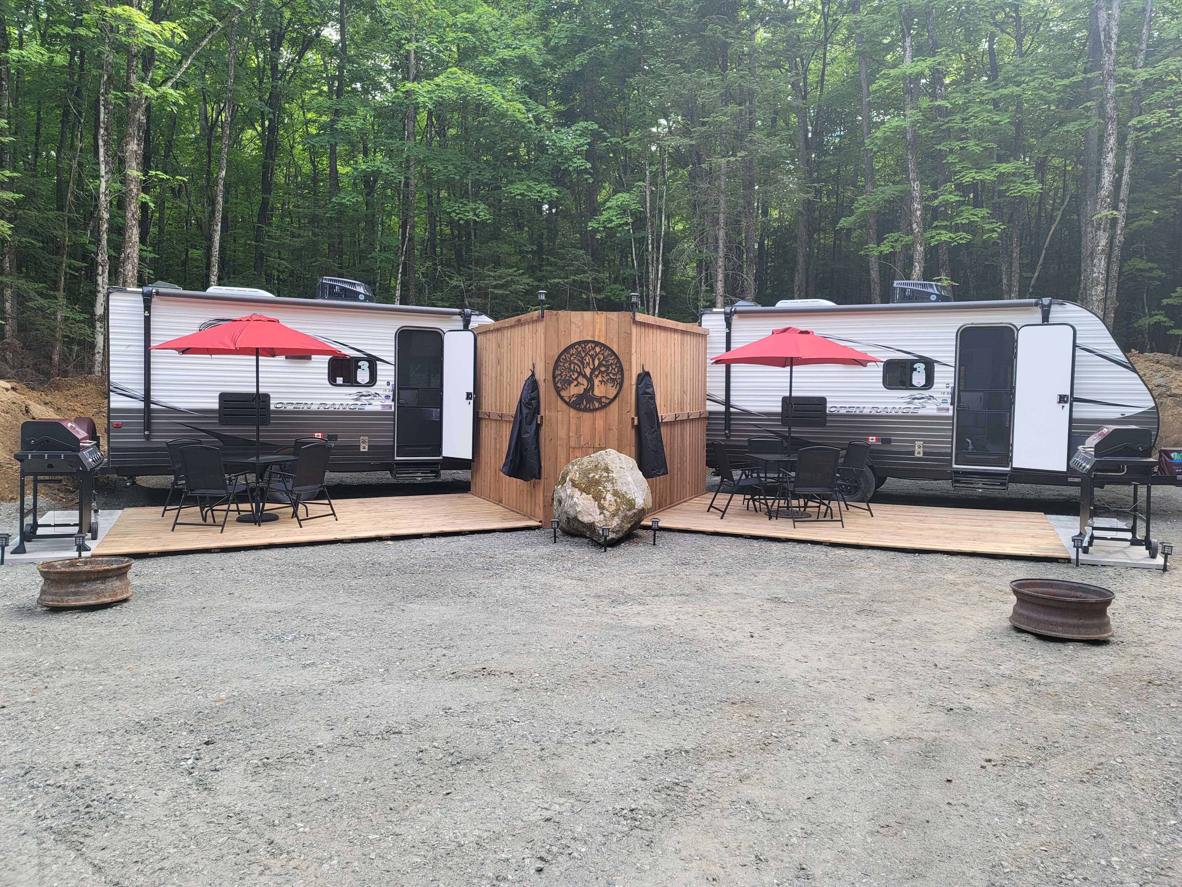 There are lots of walking trails, ATV trails, two spring-fed lakes with easy boat launches for swimming, fishing, or kayaking within a 2 or 3 mins drive. There is plenty of opportunity for hiking through the property trails and multiple star gazing areas. There are numerous grocery stores and shops within 20 minutes of the site! Silent Lake Provincial Park is within 30 minutes drive and Kawartha Highlands Provincial Park is within an hour. Choose from two on-site travel trailers. Each sleeps 4. There is a kitchen with all the necessary supplies and a BBQ for grilling. Each trailer has its own bathroom and shower. Fires are permitted (within local regulations) and pets on leash are welcome. This is the perfect spot to get back to nature but still have all the comforts of home!