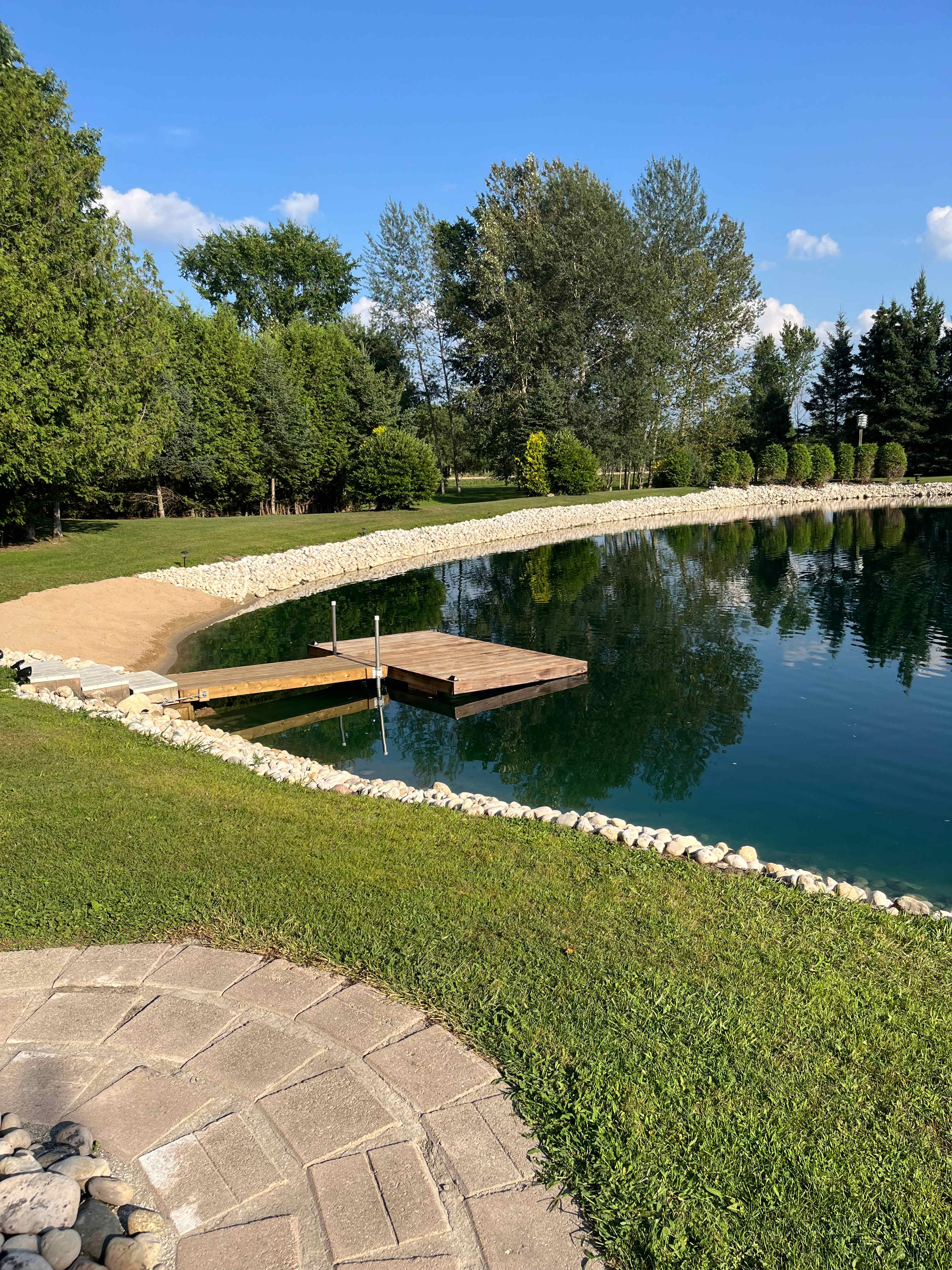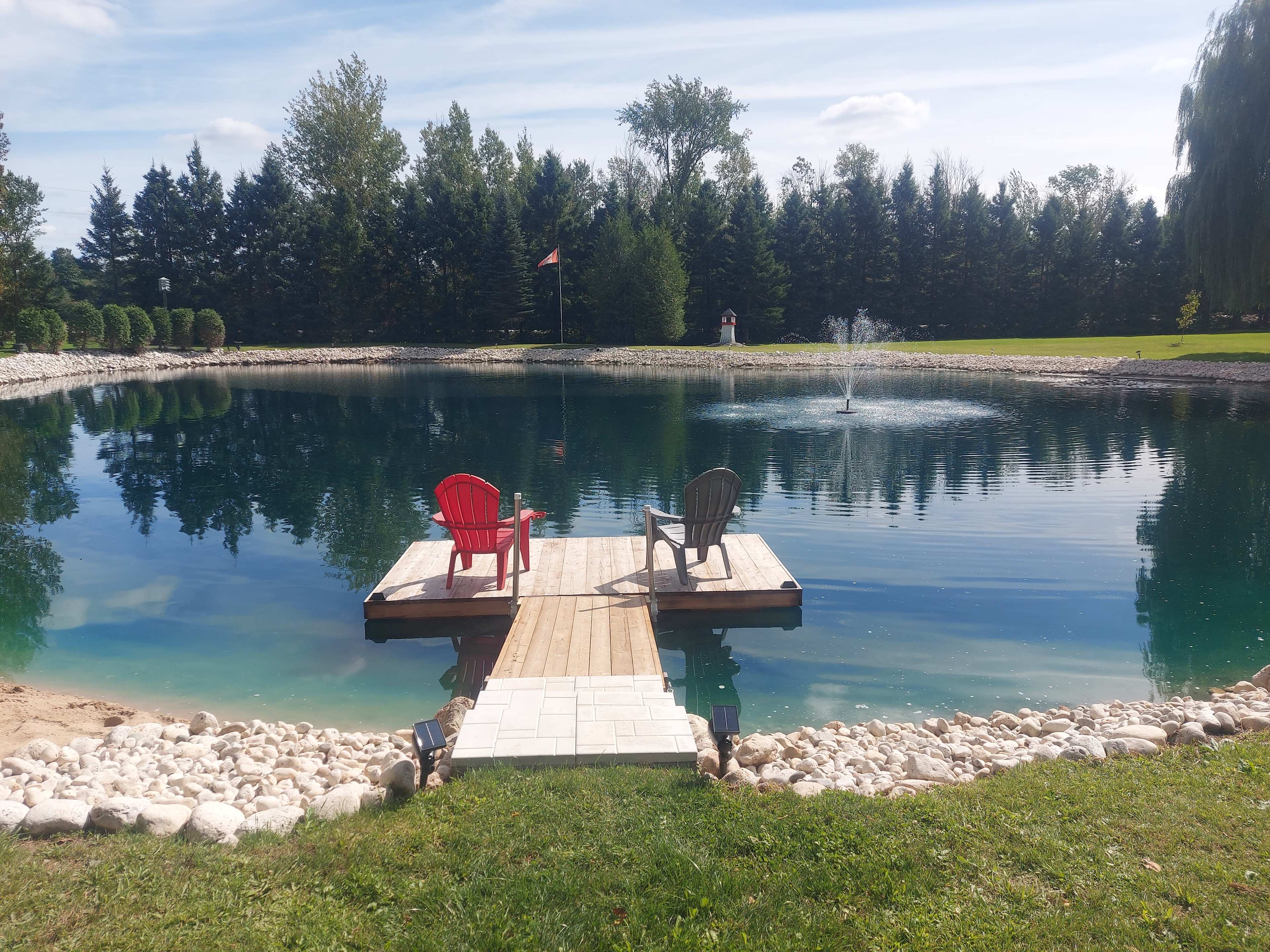We loved all the little thoughtful touches—a spotless washroom, a drinking water jug, and fun outdoor games. The pond with its fountain, dock, and graceful willow tree quickly became our favorite spot. Nights by the fire with the pond lights glowing felt magical. We also adored the chicken coop—watching the hens being fed and collecting some super fresh eggs was such a treat!