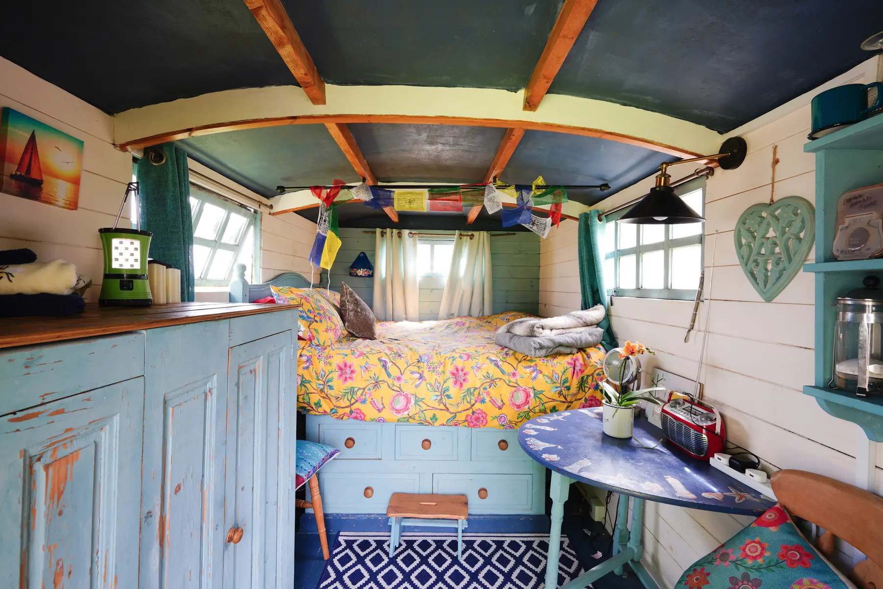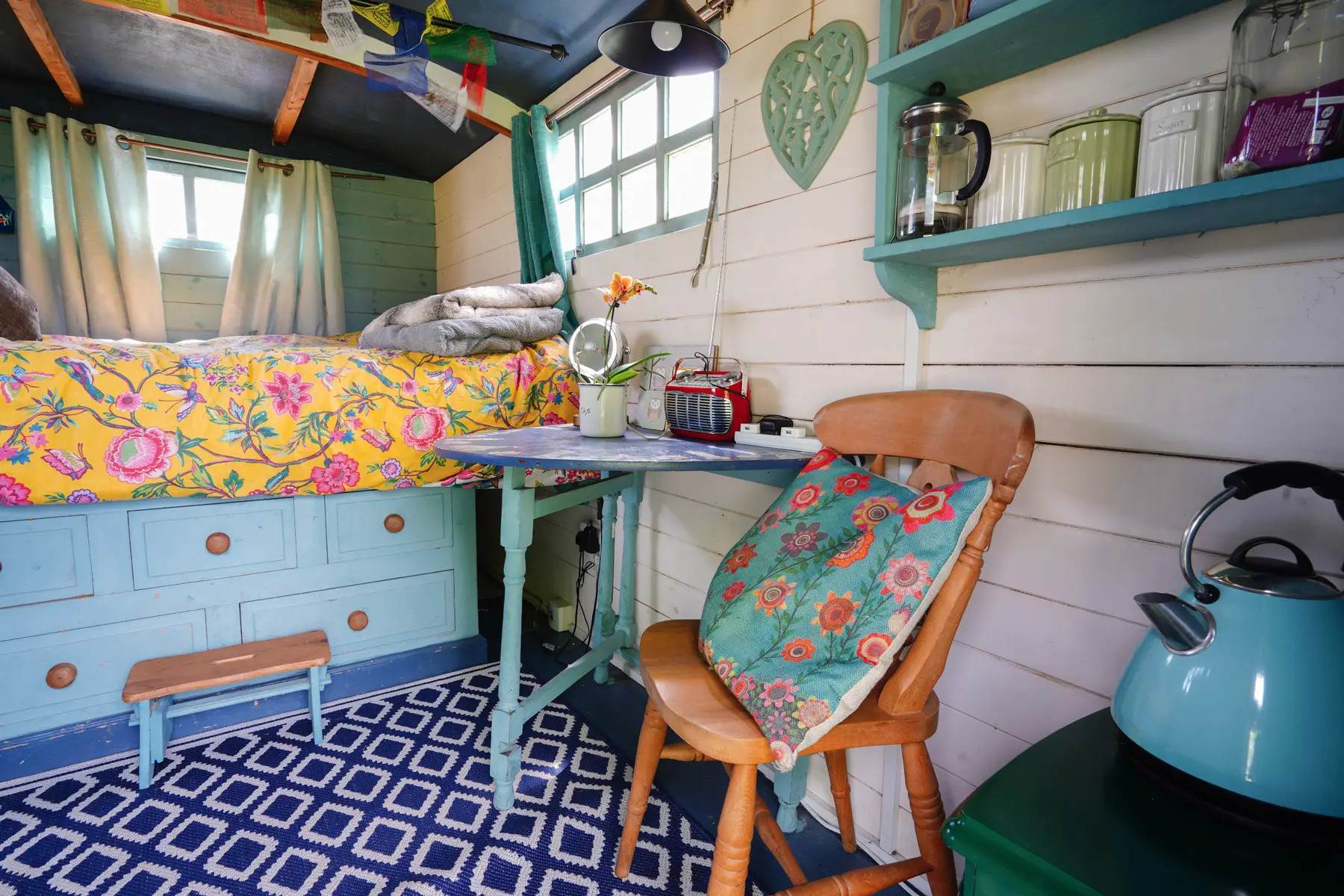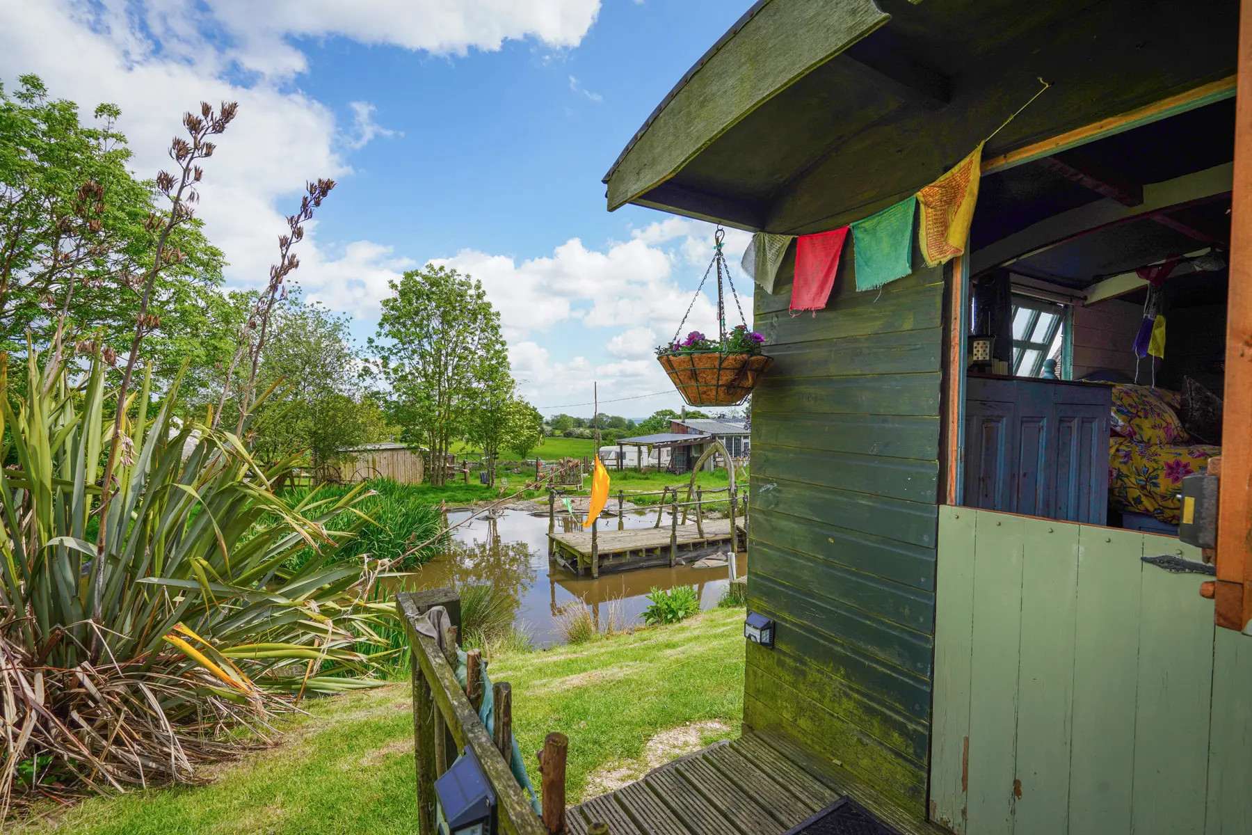 Warm and cosy in Winter and cool in Summer, your Shepherd’s Hut is a brightly decorated spaces with a cosy, super-king bed, with linen, towels and a goose feather and down duvet all provided. We built the Haven Shepherd’s Hut, by hand, on site, using recycled and up-cycled materials. Right next door is a bathroom with luxury rain shower, toilet, and sink. There is a very well equipped outdoor kitchen with a gas BBQ & hob, microwave, toaster, fridge, pots & pans cooking utensils, crockery and cutlery. There is even a wood-fired pizza oven. Outside Haven Shepherds hut, you can unwind by the fire-pit enjoying the view of the ancient duck pond and seven standing stones. The pond is Illuminated at night, creating a unique, serene and romantic atmosphere.