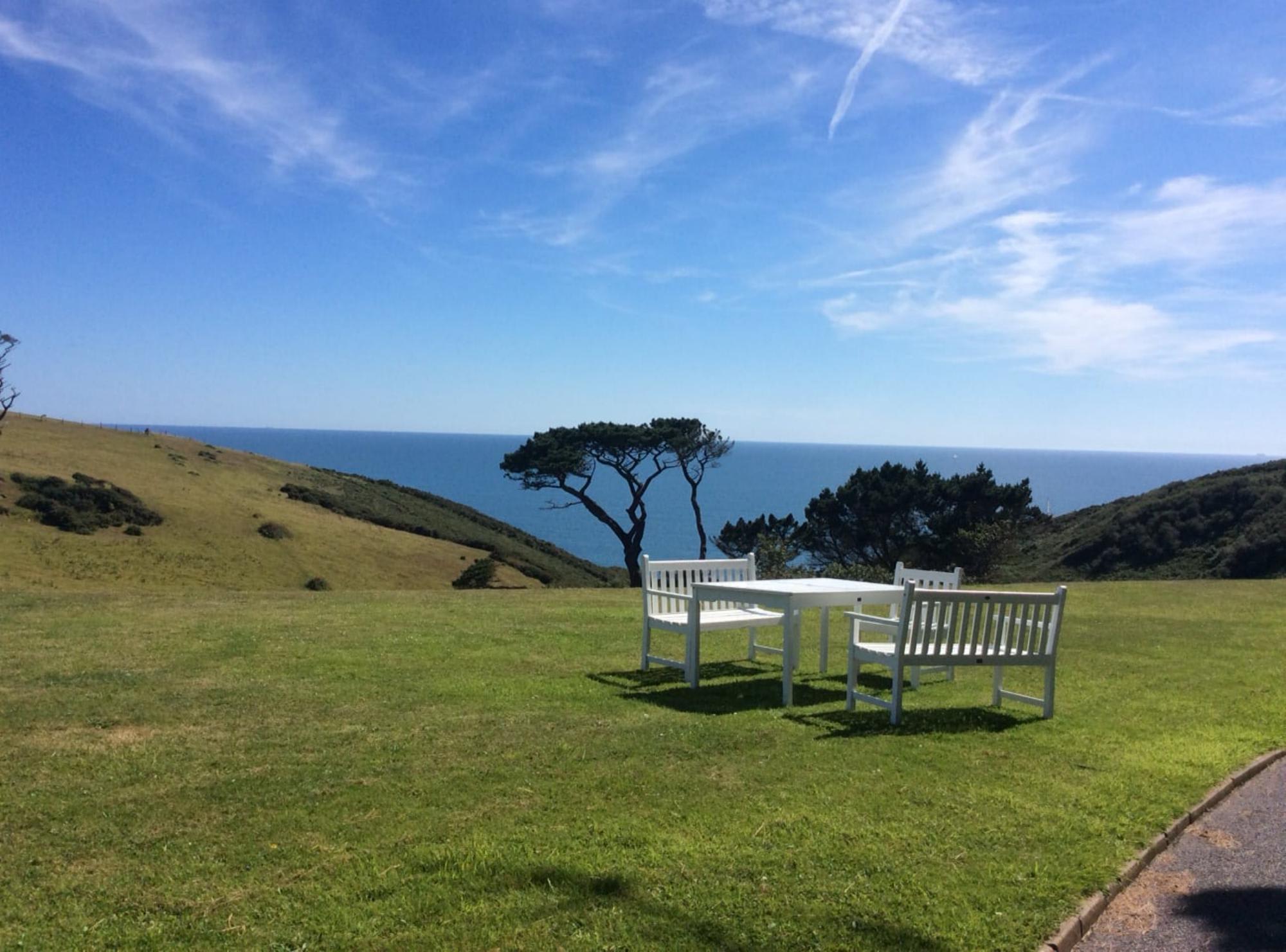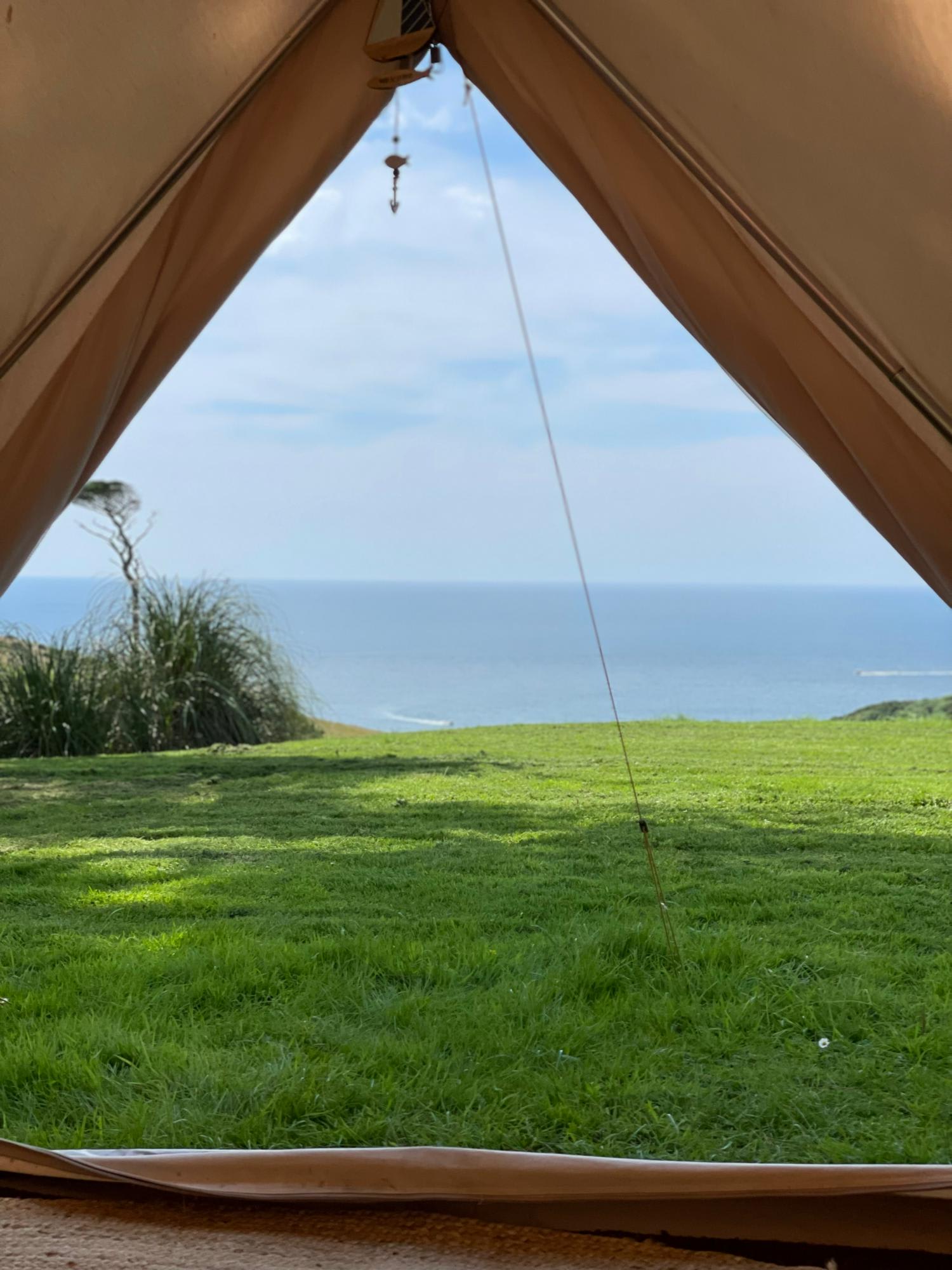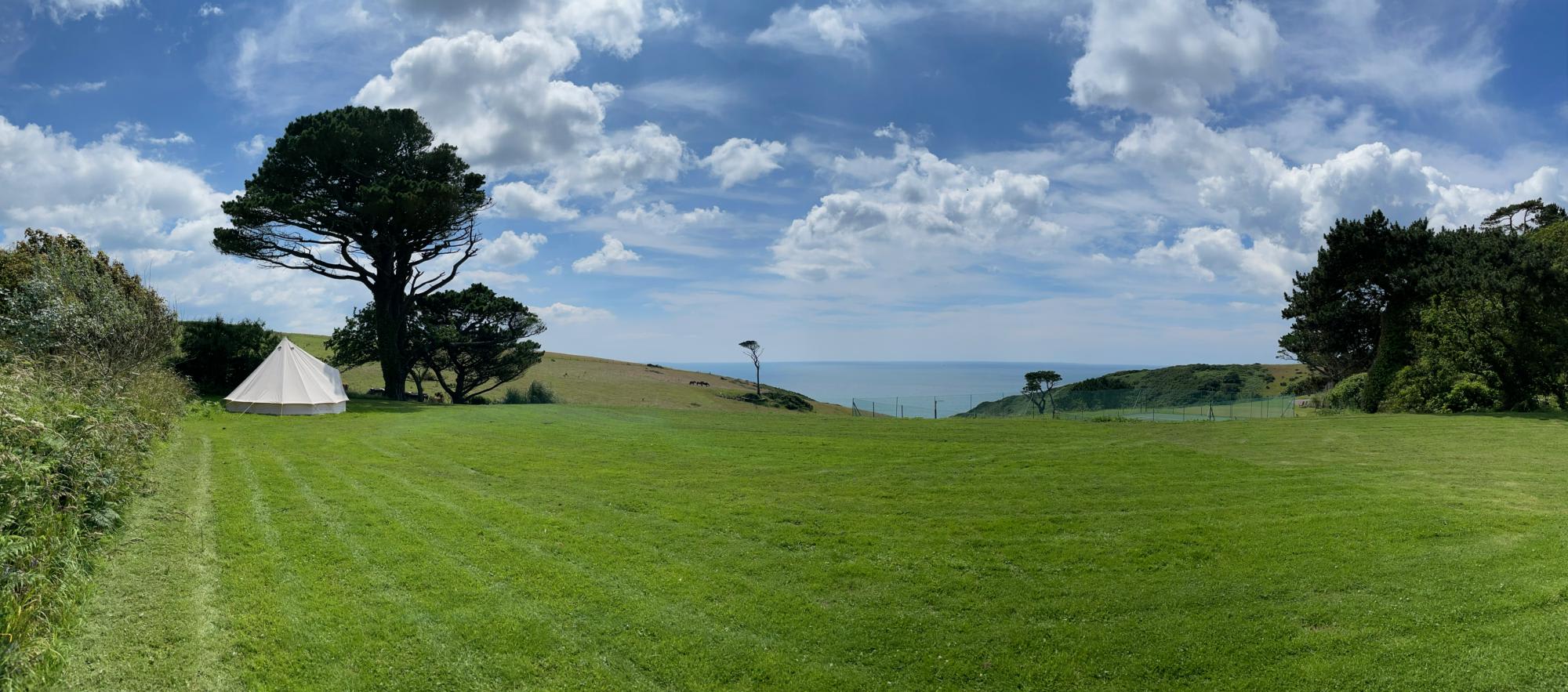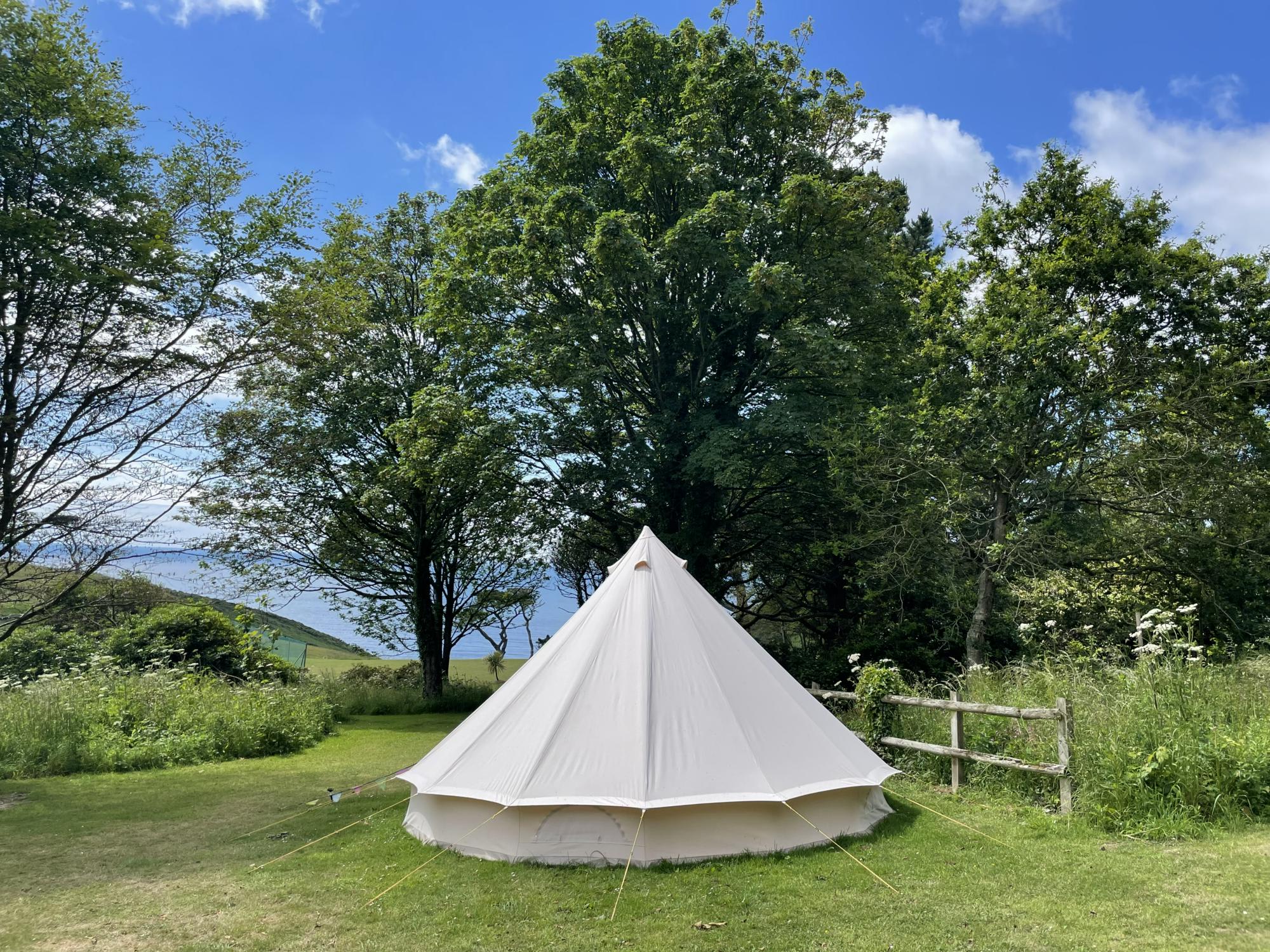 In any other location you might be wooed by the comfort of the bell tents at Battisborough House. The sprung mattresses, the antique bedsteads, the bunting, the lanterns, the lights. But it takes a lot, here, for anything to grab your attention other than view. Set on a perfectly flat terrace of land above the country house's tennis court (which guests are welcome to use), a drop in the landscape reveals the sparkling blue of the sea. On a clear day it seems to merge into the blue of the open sky. 'Welcome to the coast', the view seems to say. Get any closer and you'll be camping in the sea.
