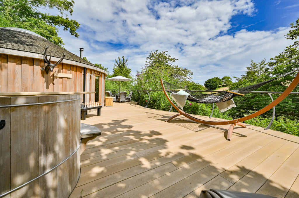 Dittisham Hideaway's treehouses are its focal point, tucked away in a wooded valley and elevated for views across the treetops. On sunny days you'll surely spend most of your time on the spacious furnished decking, lazing in the hammock, or taking a dip in the wood-fired hot tub. The kids can be kept occupied with the outdoor table football and chess sets, while the adults can cook up a storm on the barbecue before relaxing on the sun loungers. Inside, the treehouses replicate the feel of a luxury hotel with their underfloor heating, Egyptian cotton bed linen, and en-suite bathrooms with power showers, while a welcome hamper with West Country produce awaits all guests.