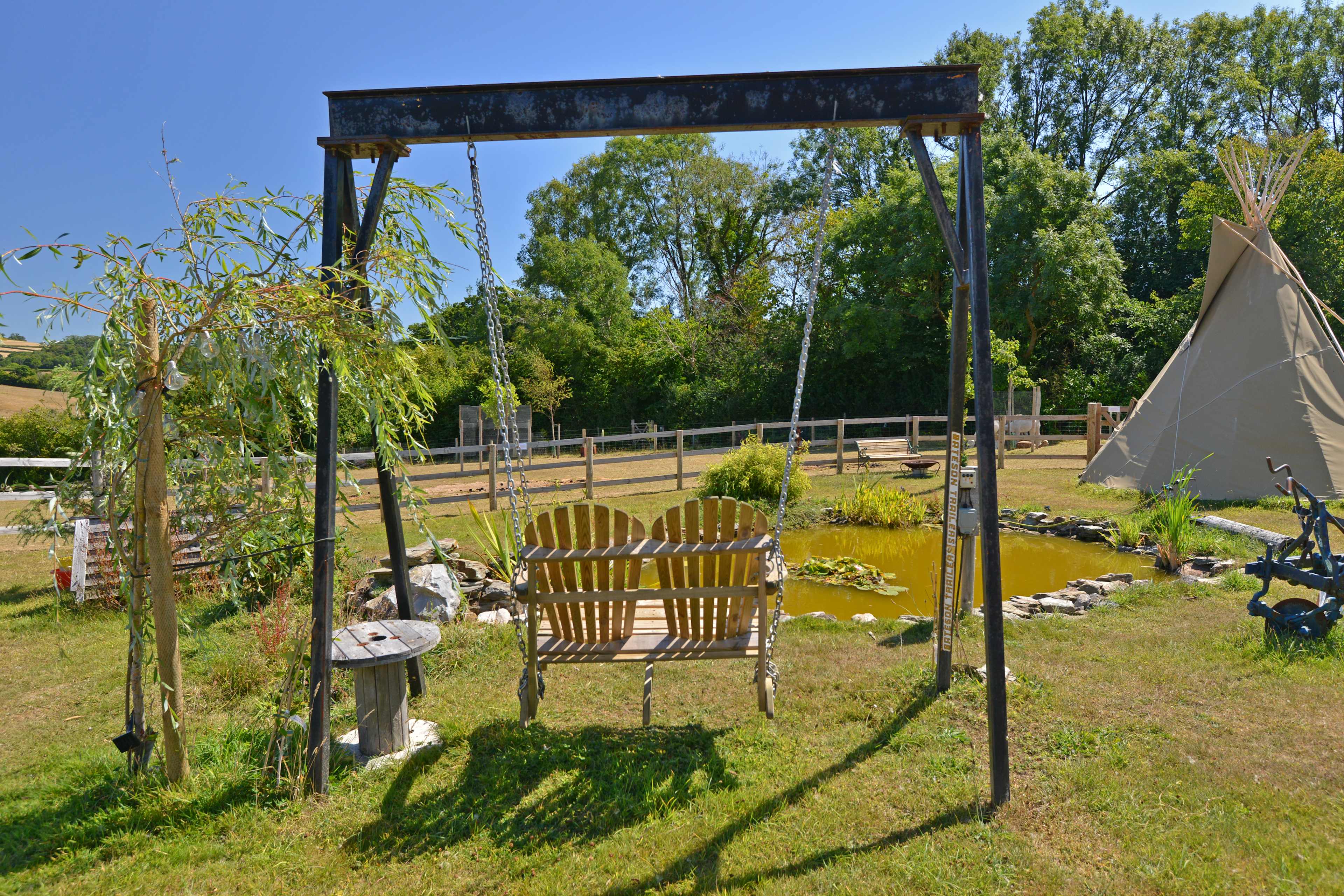 The tipi tent offers a cosy double bed, outdoor furniture, and a fire pit, with wood available to buy on site. The tipi can be upgraded to four at request.