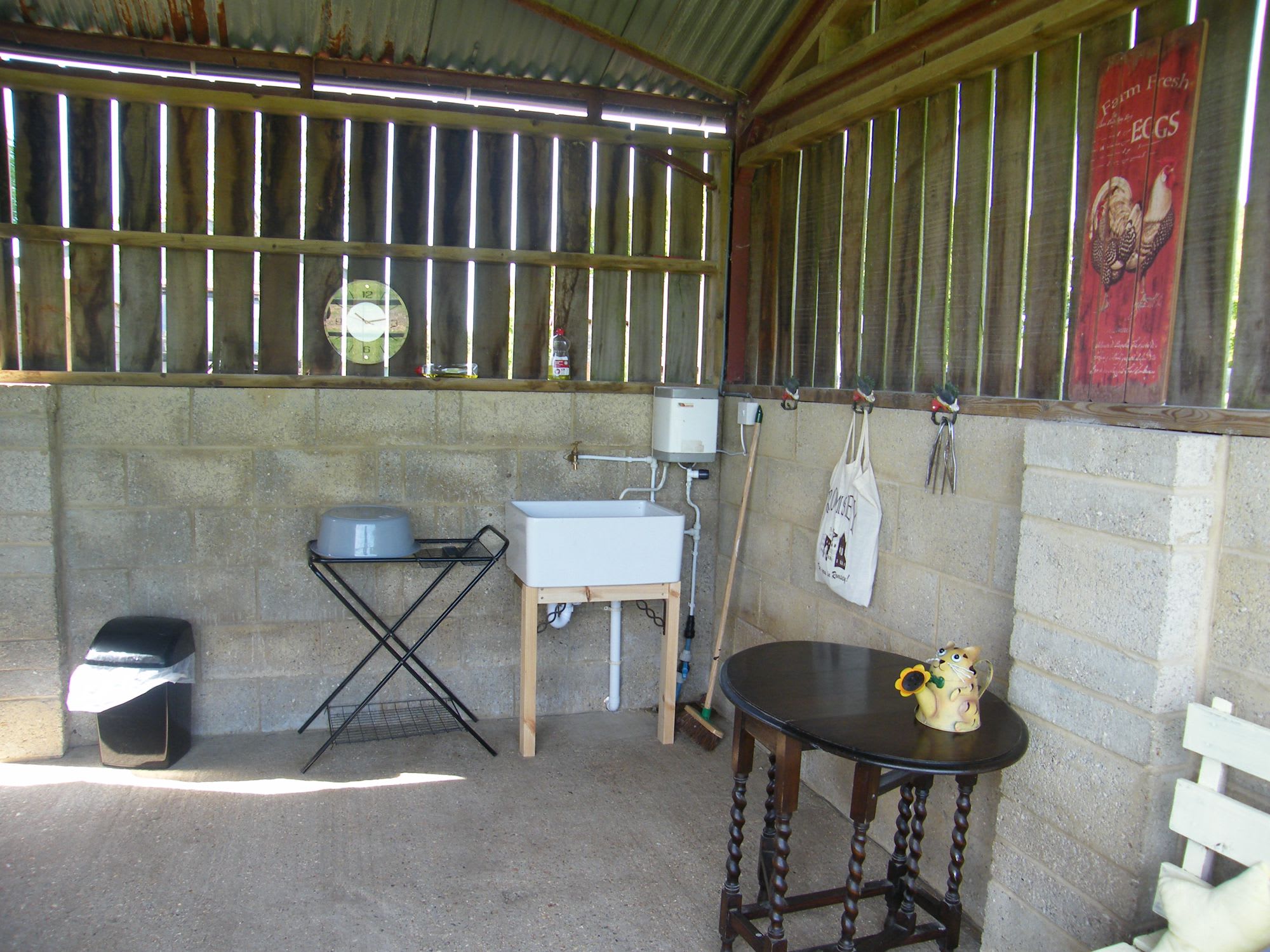 four toilets and a washing up point sheltered beneath the roof of a lean-to