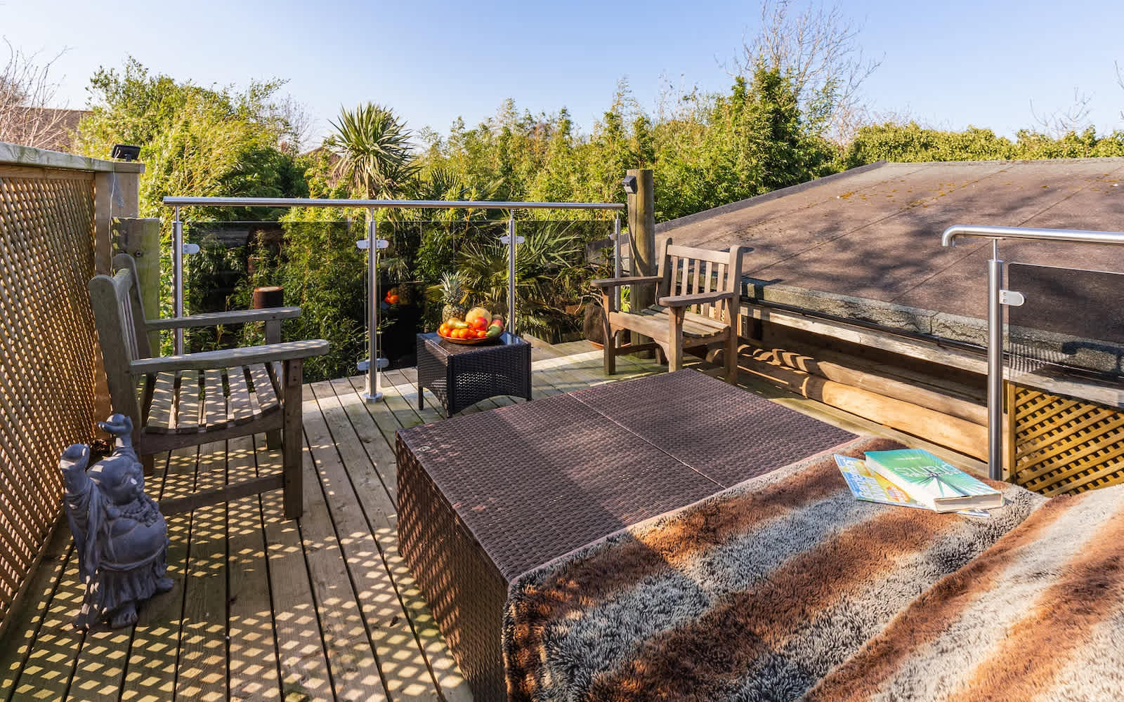 This easy-to-get-to hideaway was handcrafted by host, Jon. It sits in a secluded position in the large garden behind his family home, just two miles from the sea. Its indoor and outdoor living space is split over two levels. Outside, that means a hot tub on the patio and a raised deck with sun loungers above. Inside, it means a few steps provide separation between the open-plan kitchen/lounge and the spacious bedroom with its four-poster bed.