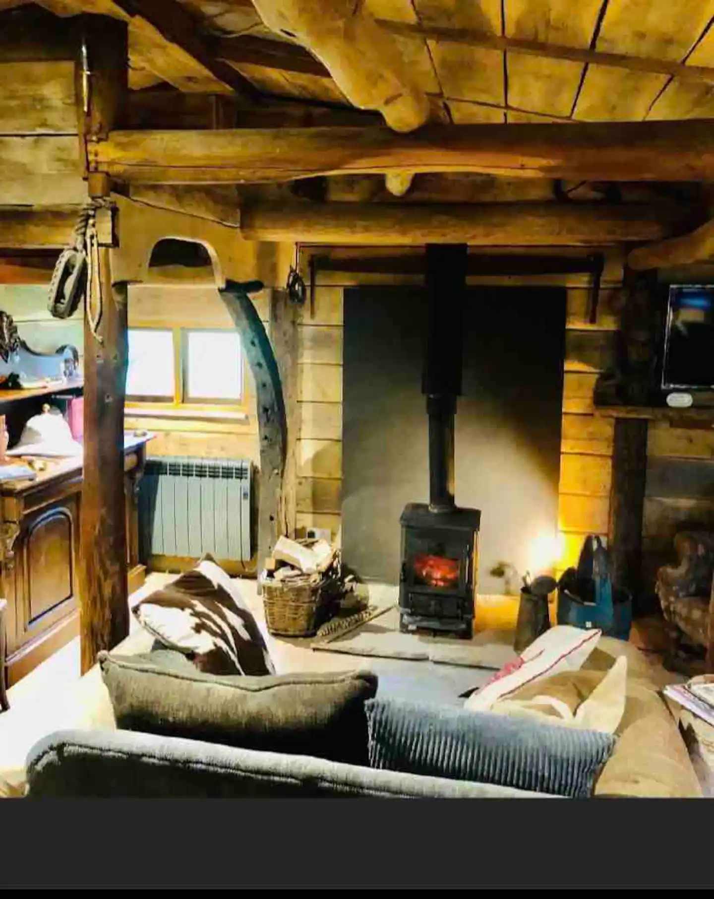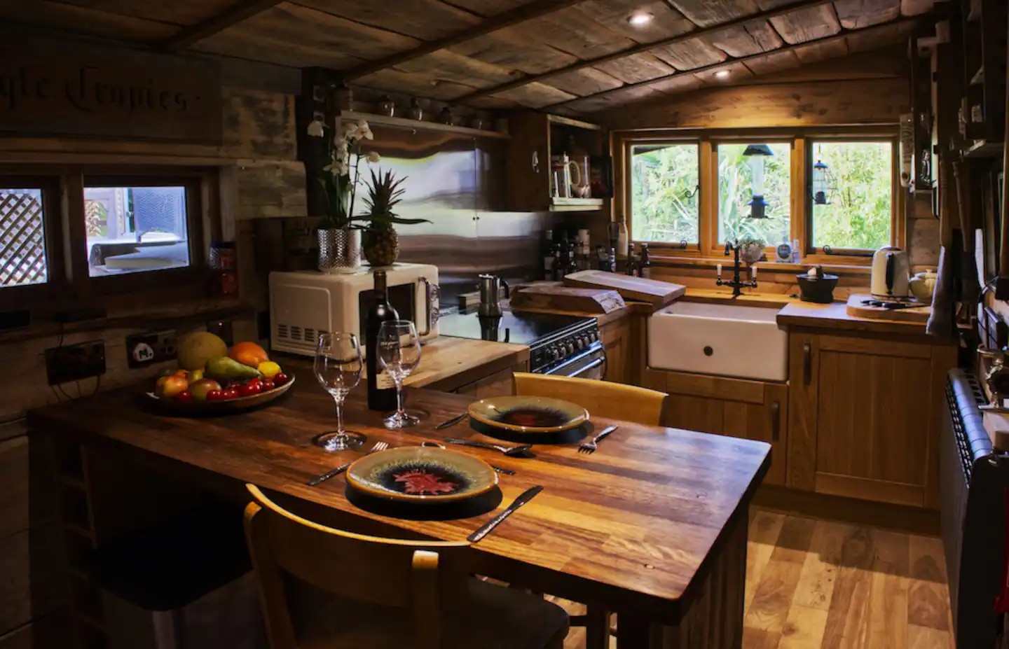 Everywhere you look there’s something to see: a grandfather clock here, a giraffe sculpture there, local paintings on the walls. There are as many themes and styles as there are types of timber. It’s cedar clad with oak floors; the bedroom door is walnut, the bed itself – mango wood. There’s polished antique furniture and rough-hewn crates for shelves. Somehow all this works together – and works together very well. That’s thanks, not just to Jon's eye for design, but to the modern amenities that underpin your stay: electricity, wifi, kitchen appliances and a bathroom you’ll wish you had at home.