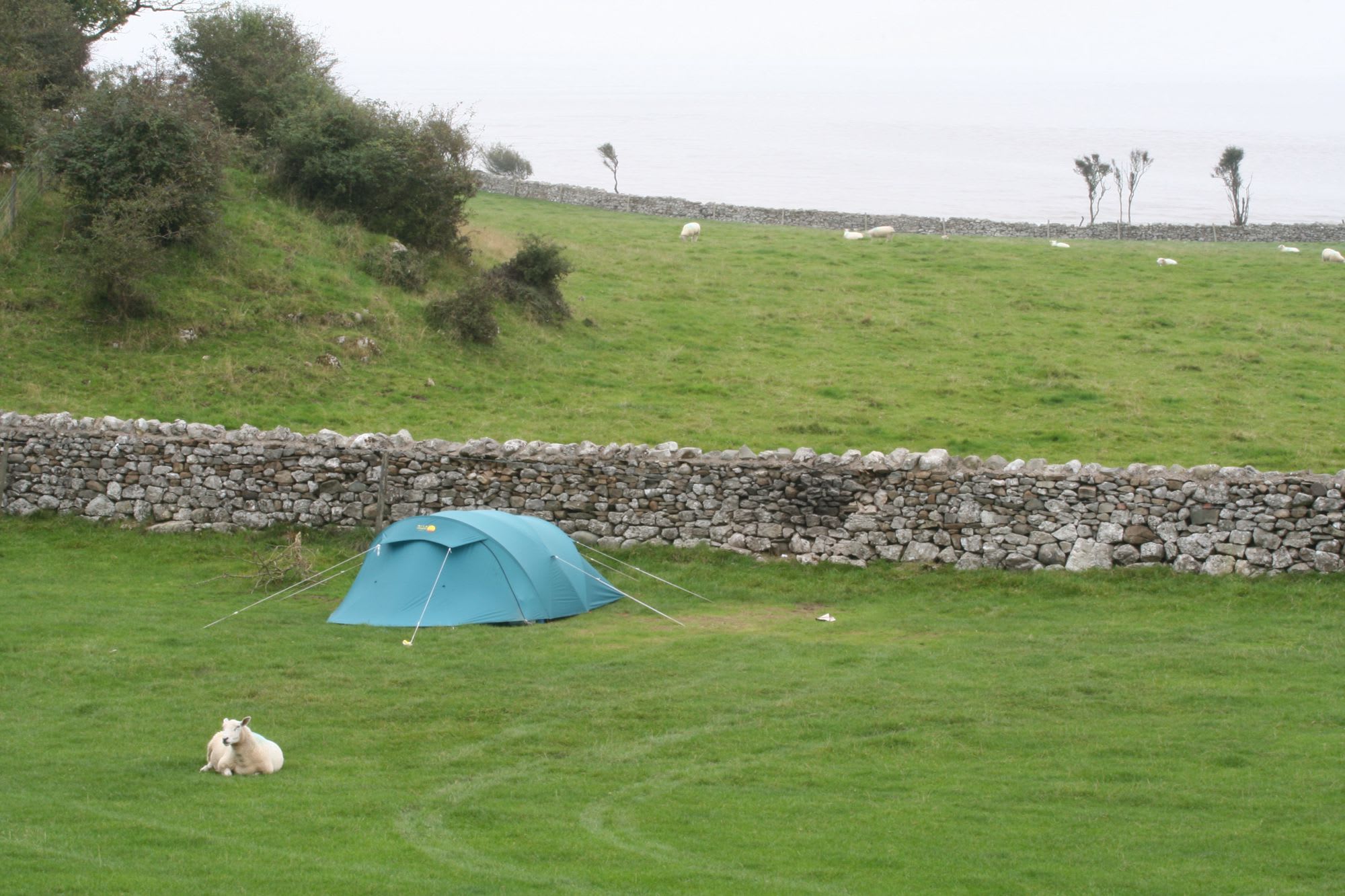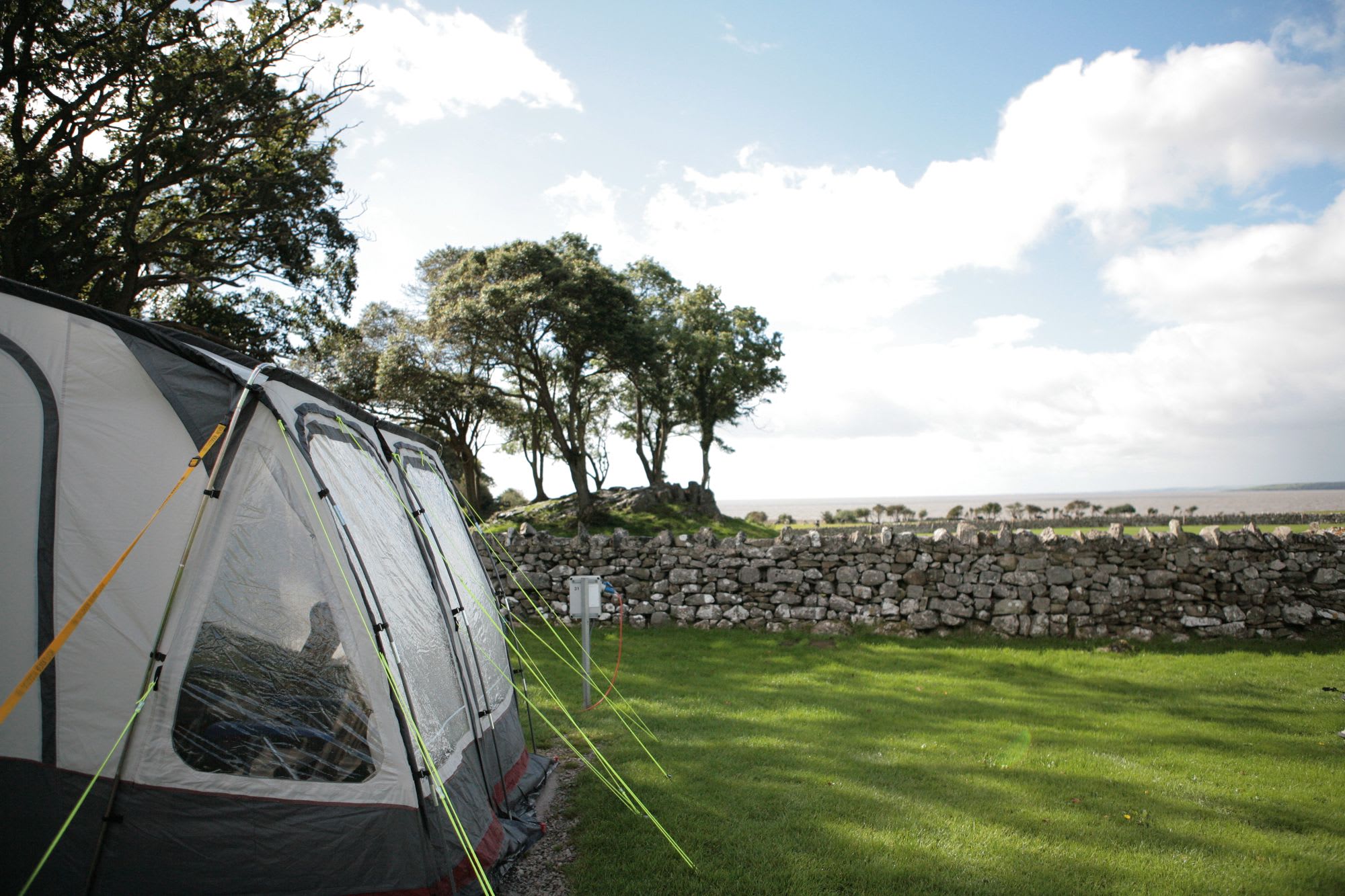 One of the best places from which to enjoy the sands of Morecambe Bay at a safe distance is the Gibraltar Farm Campsite, near Silverdale. Coming through the farm gates, you’re greeted with a panoramic view of the bay with the camping area lying down an access track through a lovely field beyond the trees. So you can pitch your tent in the large grassy area set around a rocky protrusion on the seaward side of the farm and enjoy the sight and sound of the capricious curls of Morecambe Bay’s waves just beyond the walled perimeter.