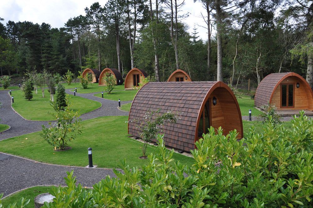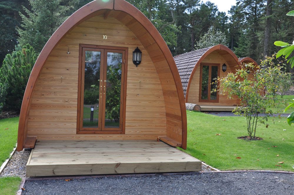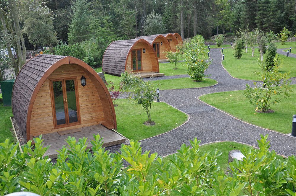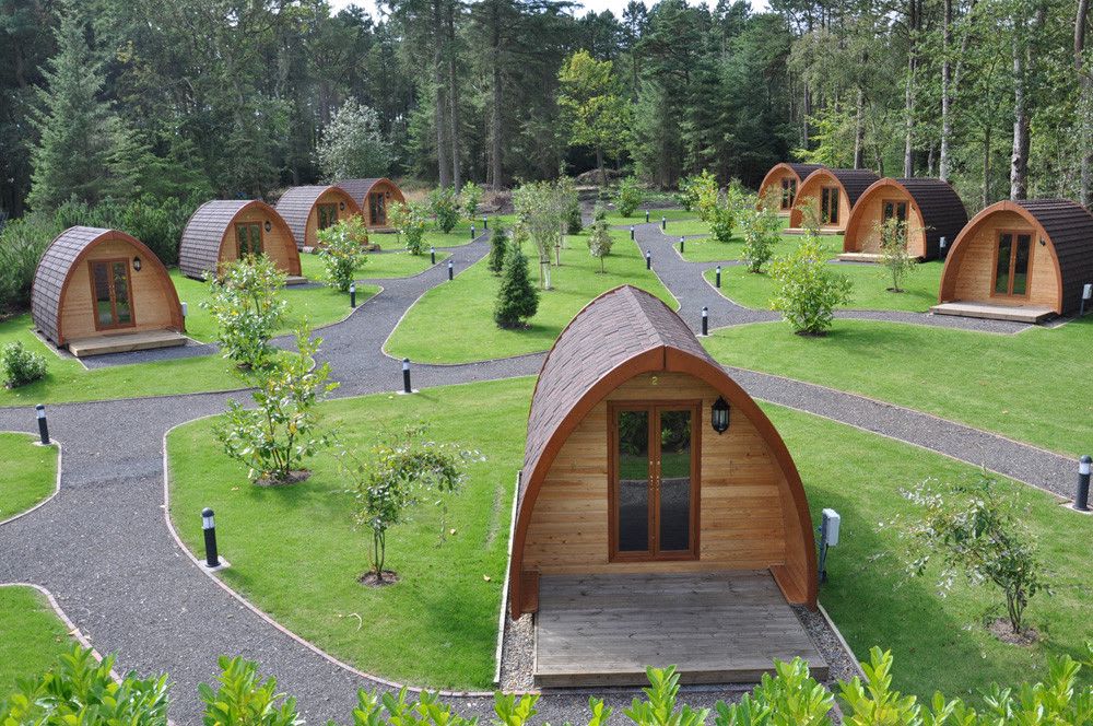 Scarborough and the coast. A gravelly path leads around the 11 glamping pods. Softly lit by small lamps in the evening, the pods boast a wooden finish that