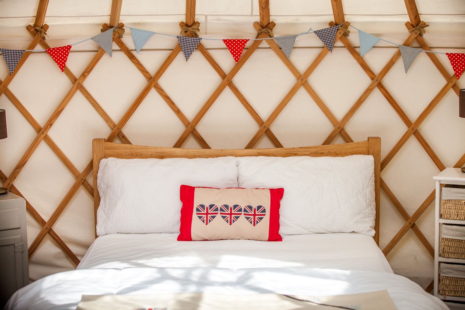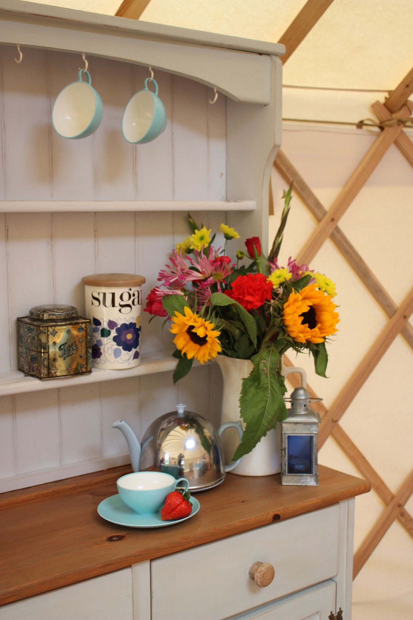 The Yurts are tucked around the edge of woodland with the communal building 'The Lodge' at the heart. The Lodge contains a beautiful country kitchen, with a large table big enough for everyone to fit around. There is a lounge in the roof of the building where you can sit to read or watch a film on our comfy sofas.