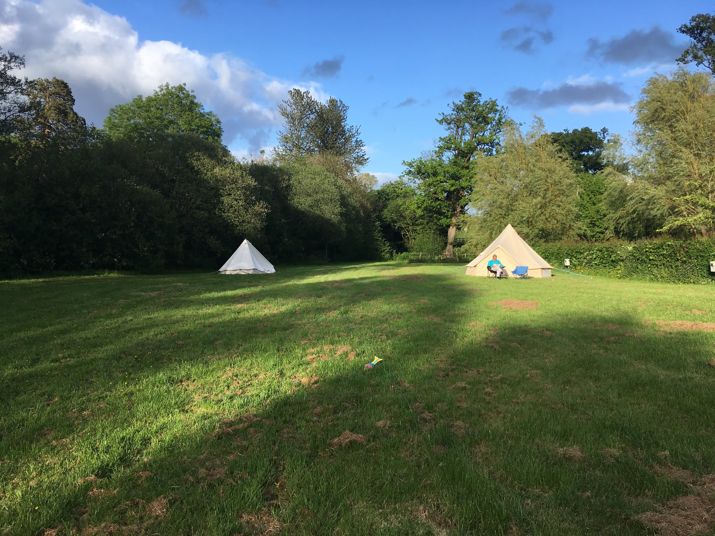The campsite occupies a one-acre field that’s surrounded by mature trees and part of a 25-acre smallholding on a former farm. There are just 15 pitches almost equally split between those with electric hook up and those without. If you opt for off grid, you can just choose your spot in the field. If you choose one with electric, you’ll find a board in reception that details where you should pitch or park up. It’s also here that you’ll find a handy fridge/freezer for campers to share, logs to buy, off-ground fire pits to rent and info on the local area.