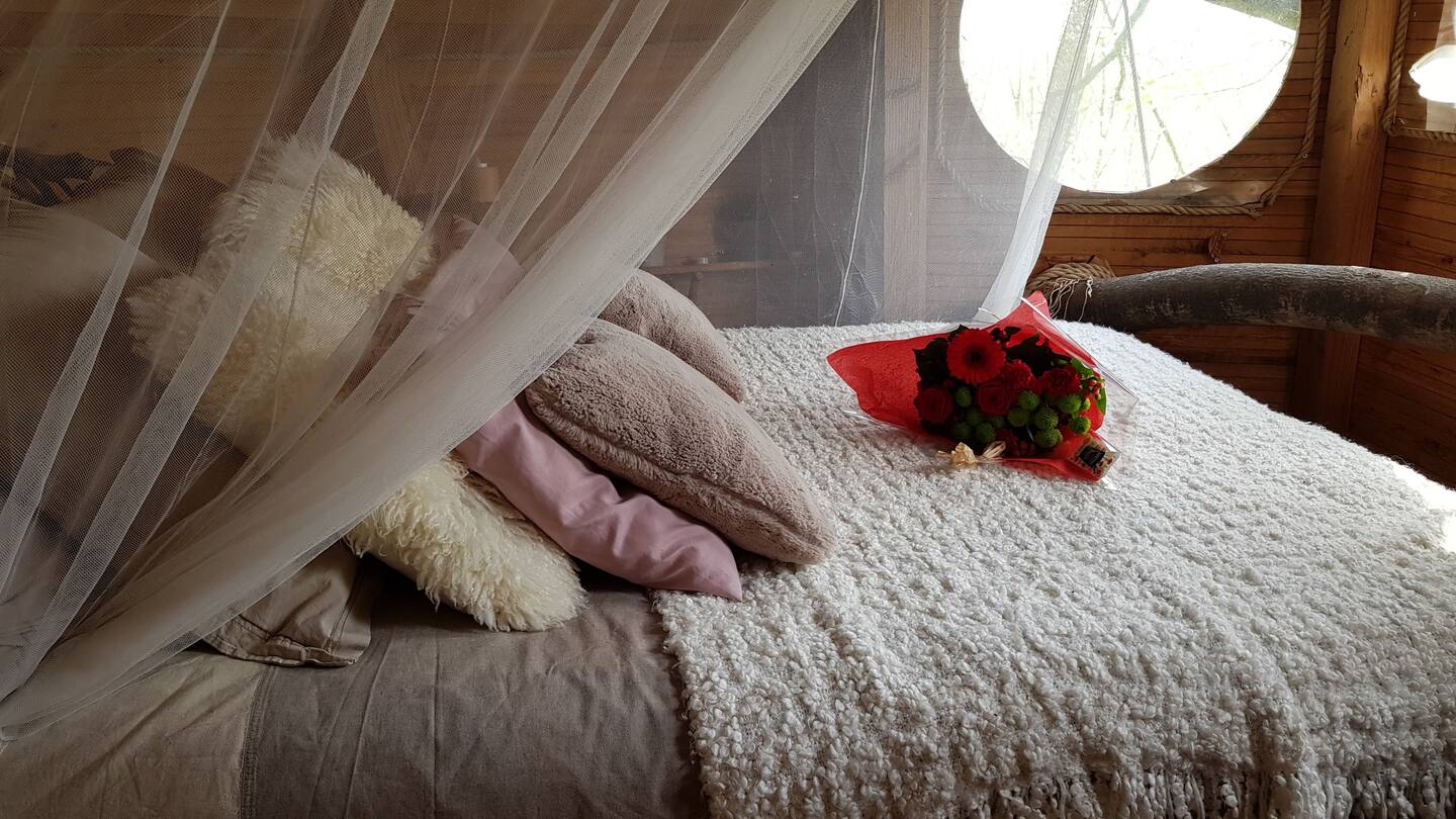 An unusual accommodation perched 16 meters high, is totally nestled in a tree, with its own terrace and garden furniture. La Cabane Haut-Perchée is the highest hut in the Hauts-de-France region and the 7 valleys, which will give you an exceptional and totally unusual experience. The cabin is equipped with a double bed, household linen and dry toiletries as well as a welcome tray. At the foot of the cabin you will find its private bathroom as well as a nature spa area with Nordic bath, sauna, light therapy and bathrobes available for 2 people.
