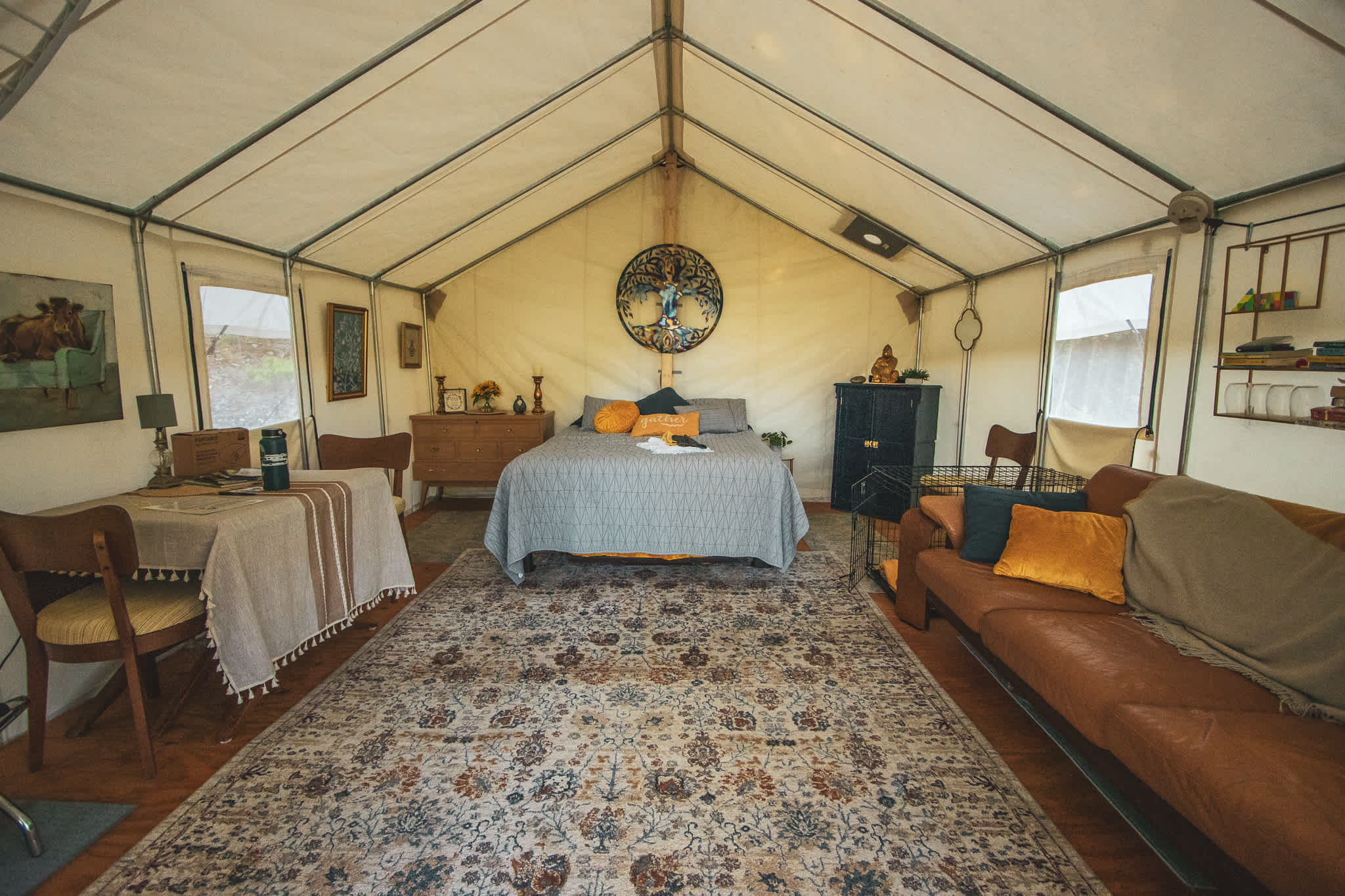 The tent itself is large, sturdy and on top of a wooden platform. It had real beds (which is a bonus for us parents, as air mattresses and the ground hurt at this point in our lives), a couch, table, some games, fresh towels, linens, cookware, dishes, cups etc. a few special touches like custom souvenir cups, a welcome note, projector and power source were also included.