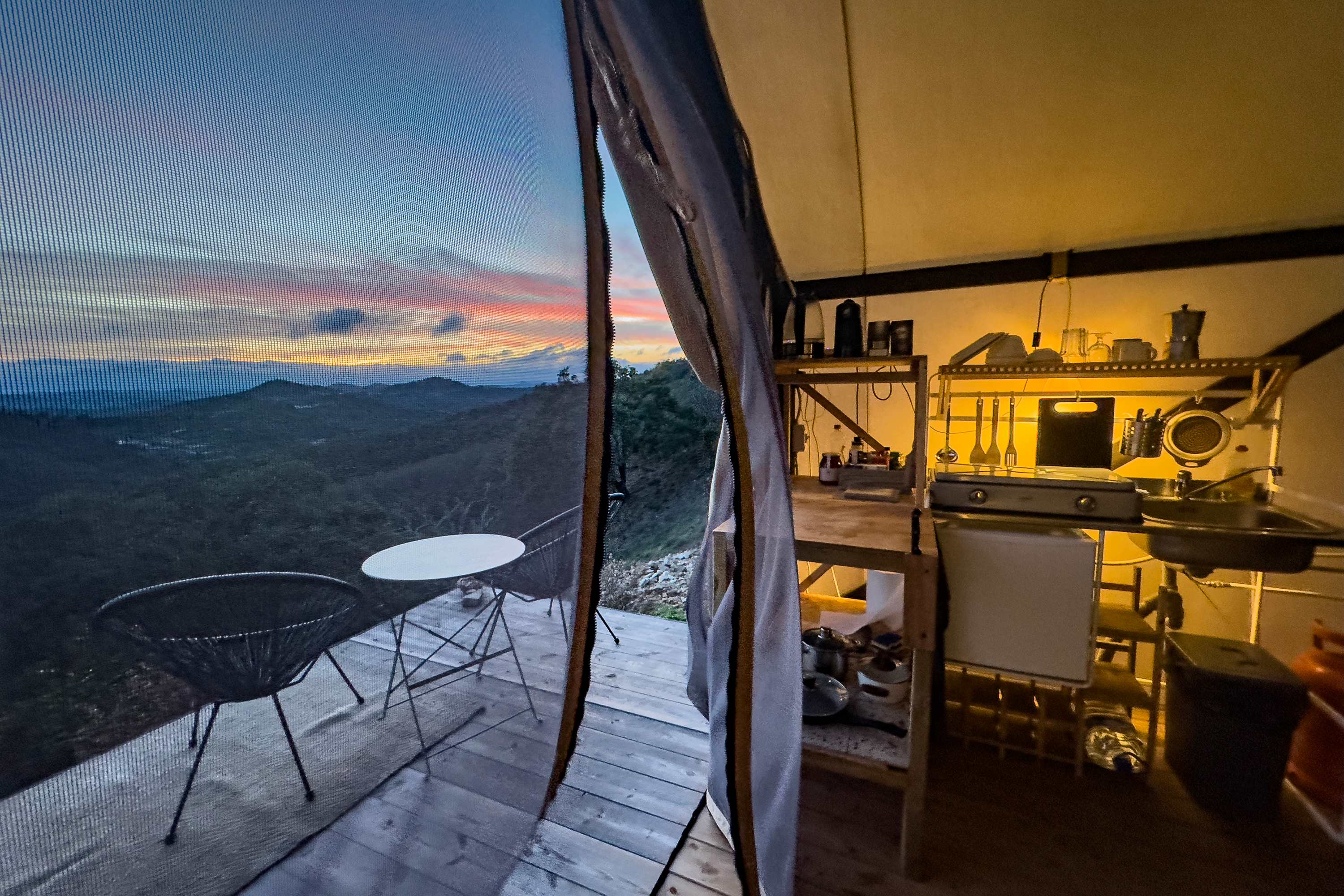 Safari tent with full kitchen, bathroom, Swedish composting toilet, shower, hot H2O, 2x queen size beds, deck, breathtaking views of Baixo Alentejo mountains and sunset, 45 min from Albufeira and the southern coast, ±1 hr from Faro airport. Supreme silence and light pollution-free views of the stars in the Serra do Caldeirão. We offer a rustic classic safari tent with all amenities: high-tech composting toilet, hot water, shower, kitchenette with gas hob, fridge and coffee maker, quiet and efficient diesel heater. Fast and reliable Starlink wifi. Two queen sized beds, deck/terrace. Surrounded by mature cork oaks, olive trees and an orange grove, a bucolic landscape dotted with classic "Monte Alentejano" houses and ancient mills. Stunning sunset and sunrise views. The tent is self-contained, with a private drive. The property is located on a dirt track, 1 km off the main highway. Fire pit (available outside of burn-ban season, usually end of Sept.), 1k liter "dorna" (wine-crushing tub) sitting tub. Enjoy hikes through the mountains, local tavernas (5 min) and restaurants (within 30 min), coastal activities 45 min away. 30 minutes to Almodovar, with restaurants, museums, etc. We are dog and child friendly (with caveats)- please contact us in advance to discuss. We can offer a home cooked meal (at an extra cost) with advanced notice and dicussion, and recommend bringing food and/or snacks, as the closest supermarket is ± 30 min away.We are situated in the stunning Serra do Caldeirão, on the border of Alentejo and Algarve, about 45 min north of Albufeira, 1 hr from Faro Intl. Airport. It is sublimely serene, and noise/light pollution-free. There are a variety of local flora and fauna, including wild lavender and orchid, cork oak, olives, oranges, Iberian lynx, Egyptian mongoose, hawks, owls and “javeli”- wild boar (they are shy, and stay away from us and our dog). There are no dangerous animals. Nearby “Tabernas da Serra” (mountain taverns) offer “Autêntica cultura alentejana”. Stay in a fully equipped Safari Glamping Tent offering: • 2x Queen sized beds • Private bathroom with hot shower • Heating for cozy nights • Fast WiFi • Kitchenette for comfort and convenience • Silence, privacy, and uninterrupted nature