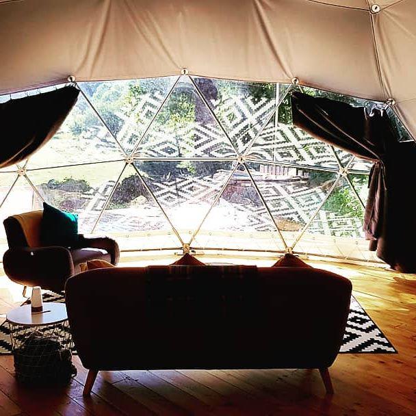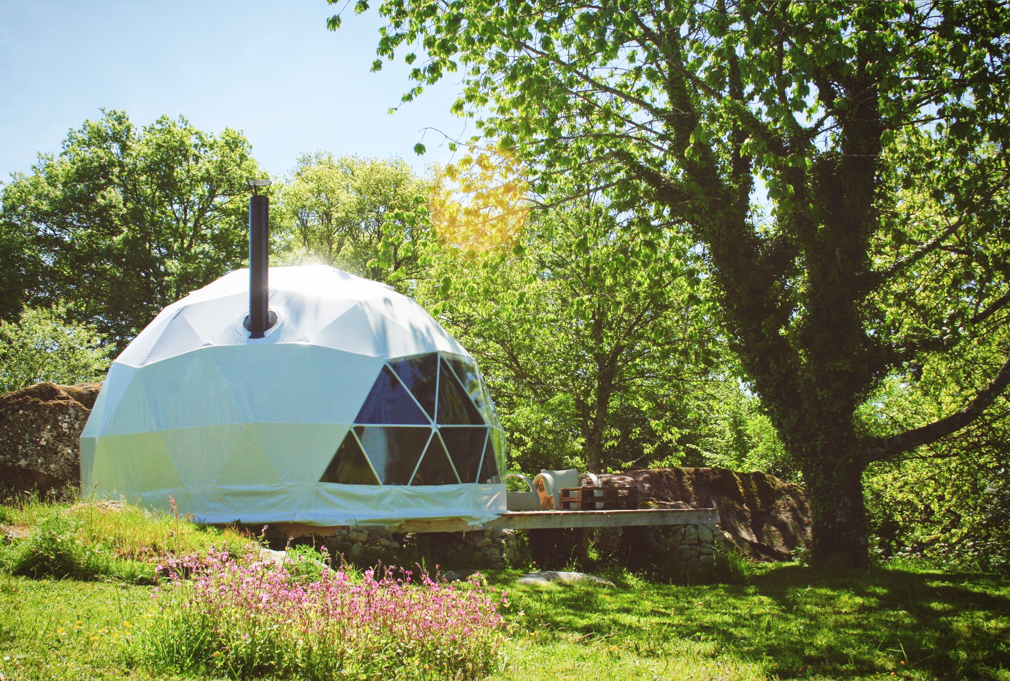 Just as wolves have been returned to Chabrières, Charley and Calum are re-introducing life to this old dwelling, too, and, since early 2016, have been restoring not just the cottage but the land around it as well. The eight-acre small holding today plays host to two luxurious glamping domes, each kitted inside with a king-sized bed, wood-burning stove and enough bedding to keep you snug and warm whatever the weather. A huge, semi-circular bay window in the dome-side allows you to look out into the trees and keep watch for wildlife of the non-wolf kind, while within, battery and solar powered lighting adds some extra function to the off-grid setup.