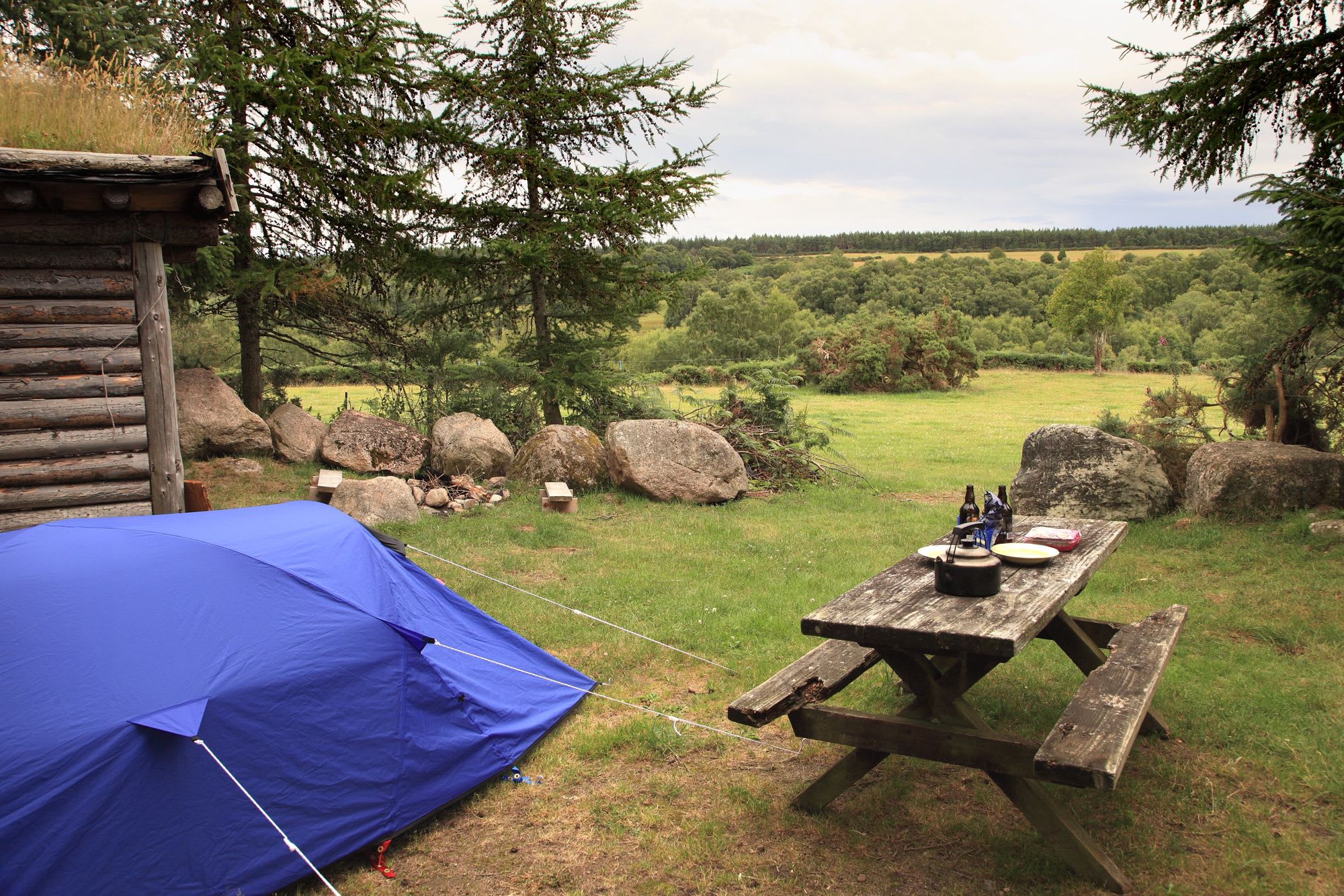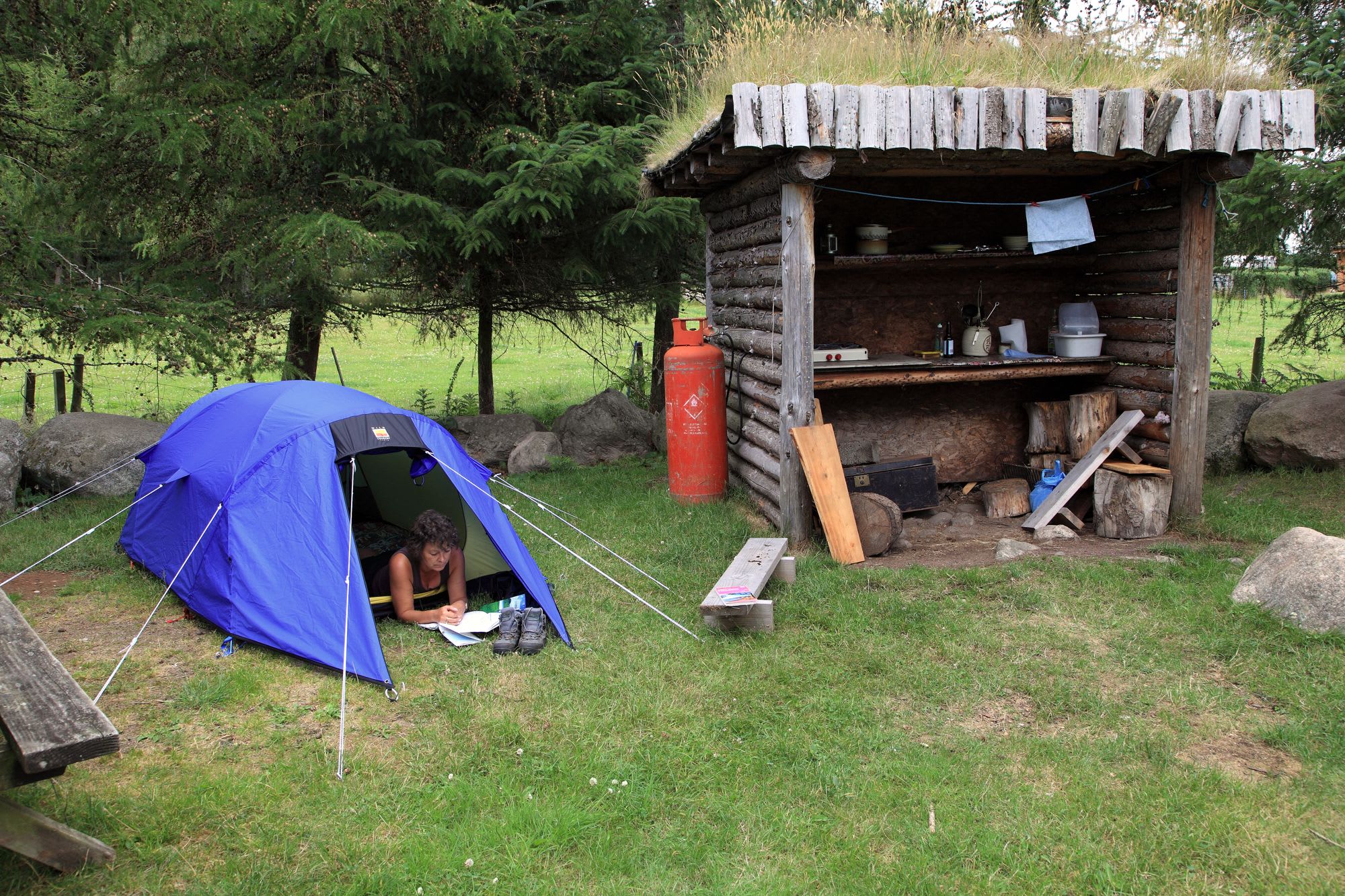 And what a campsite it is too. Lying on a gentle slope overlooking some vast and empty lands of afforested rolling hills that romp off relentlessly into the distance, the ground is home to the stony remnants of an Iron-Age hut village. And the principal pitch (because so far rarely no more than a single tent has been allowed at any given time) is sheltered within a ring of rocks and trees. This camping circle also houses a kitchen shelter (with grass roof), cooker and, round the back, a very Heath-Robinson-looking compost toilet. If you need a shower there is a bucket and plenty of privacy. Firewood is also provided for the built-in fireplace, plus a picnic bench for meal times. All in all it’s a strange and hypnotic mix of the civilised and the wild all rolled into one very mysterious setting.