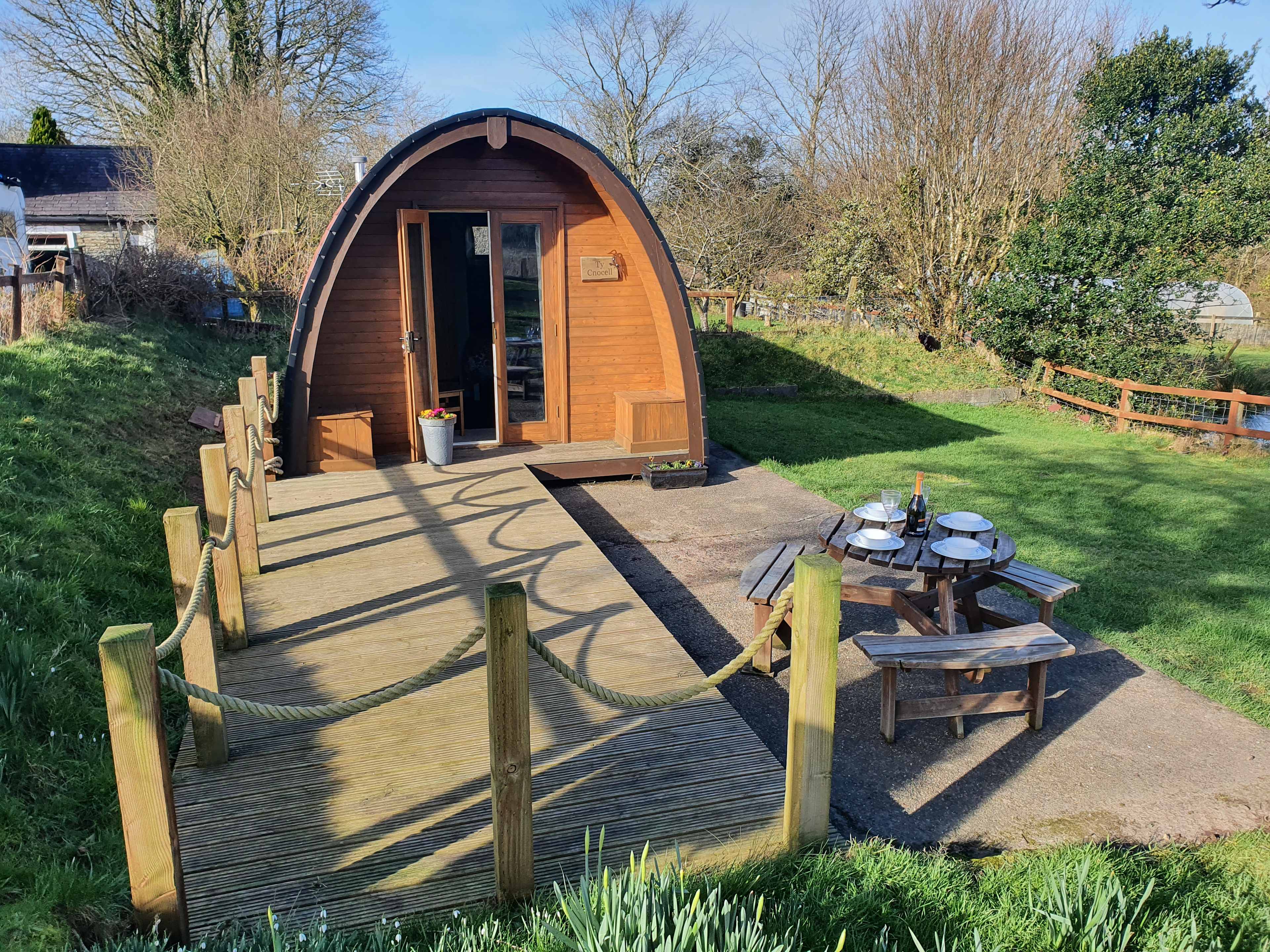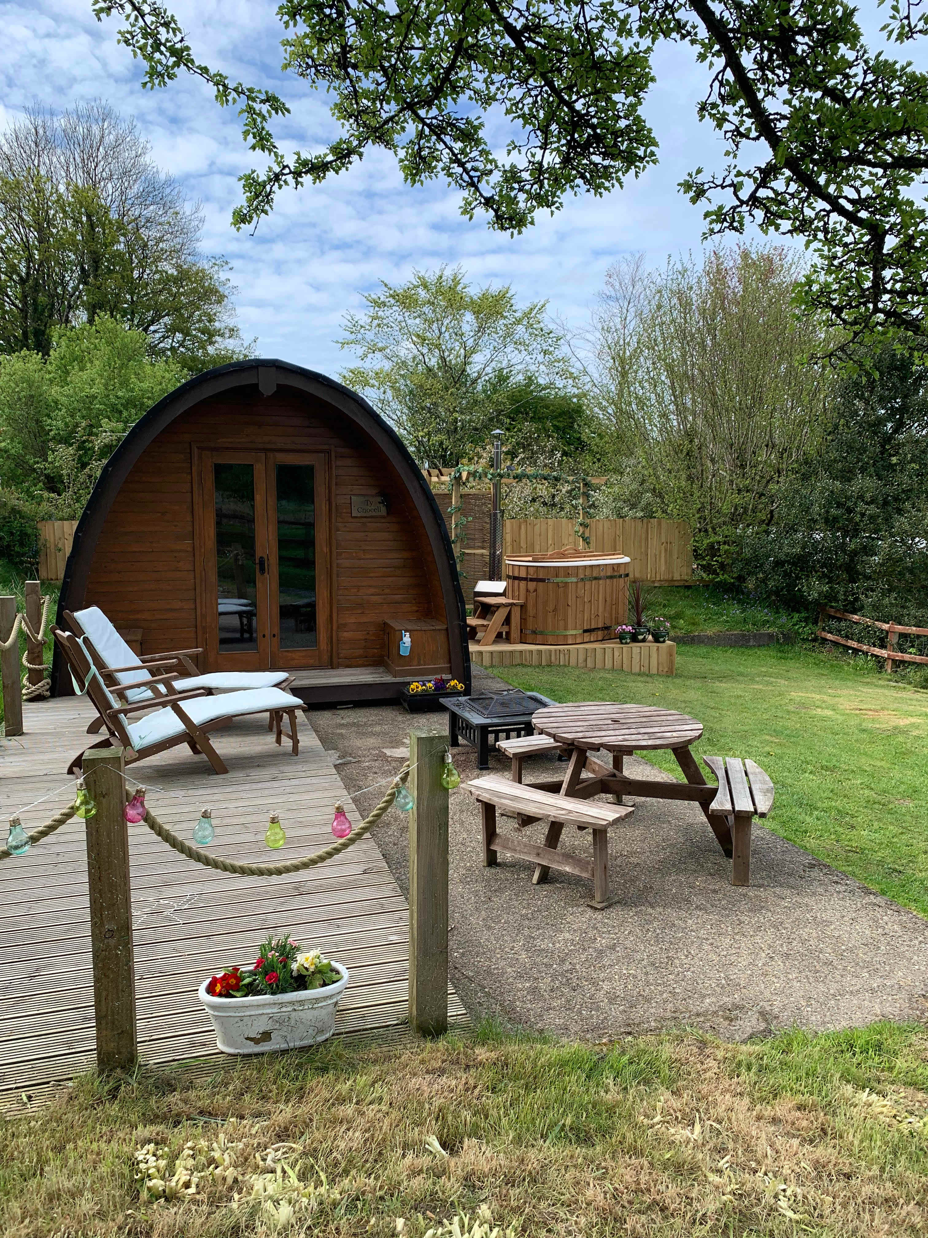 Based on a 4 acre sight that dates from 17th century with it's own natural fed pond. Many generations of different families have farmed here for years. Renovating Ty Cnocell was the first major project we carried our, culminating with the installation of the wood fired hot tub, since we 'escaped to the country'.Ty Cnocell Is a Spacious Glamping Pod set in it's own area of our 4 acre small holding. You can watch the ducks in the adjoining pond and feed the donkeys treats over the fence in the adjacent field. There is plenty of room for children to run around in the Pod's enclosed garden and it also has it's very own private wood fired Hot Tub (which we heat up for you as required). When not out and about enjoying everything Pembrokeshire has to offer, you can sit back and enjoy the view of the Preseli Hills. The pod itself is heated for all year round use and has a very well appointed kitchen, and when weather permits a Fire pit BBQ. Everything you need to get away from it all