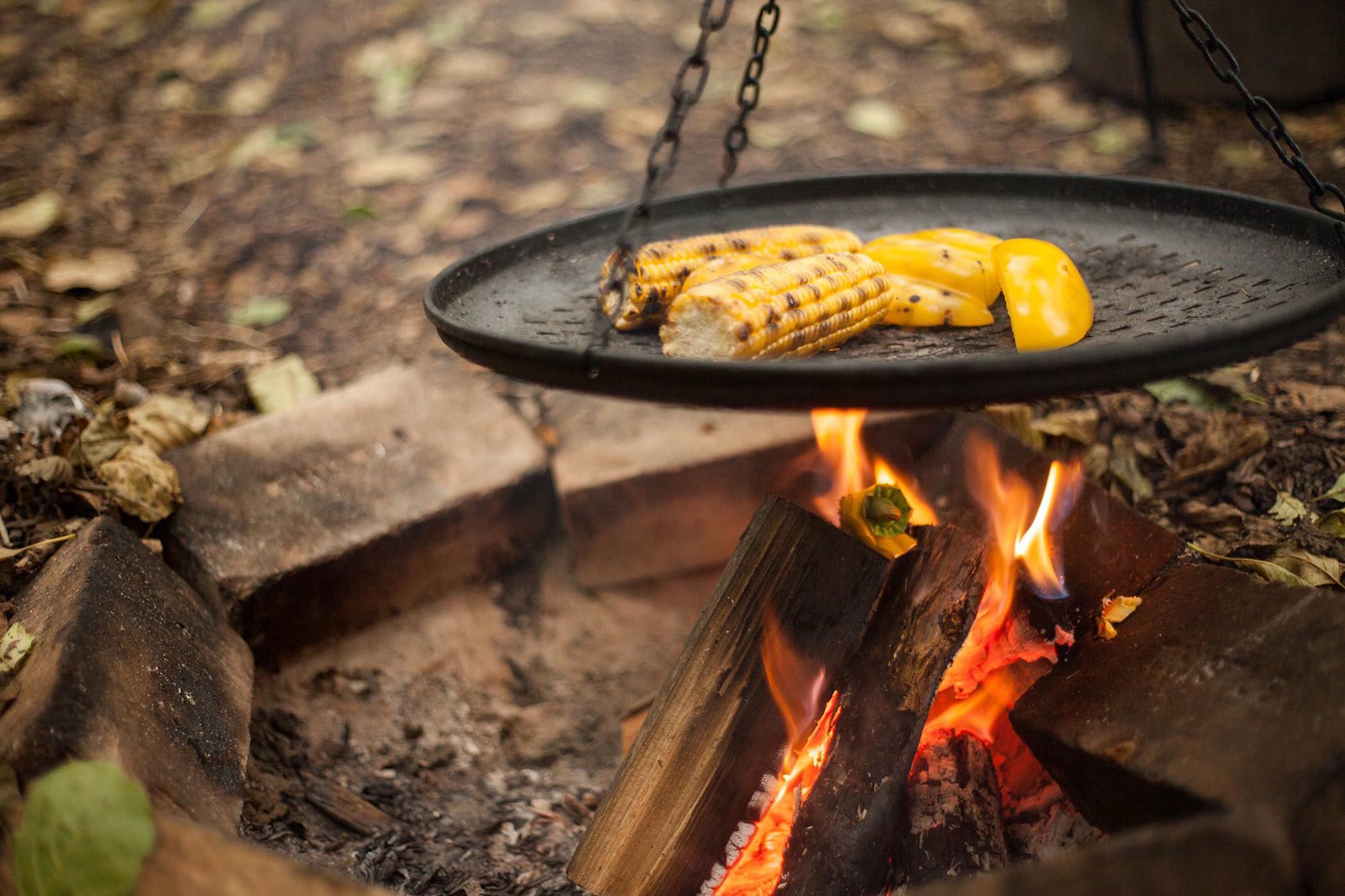 over a campfire, from tripods, skillets and pots