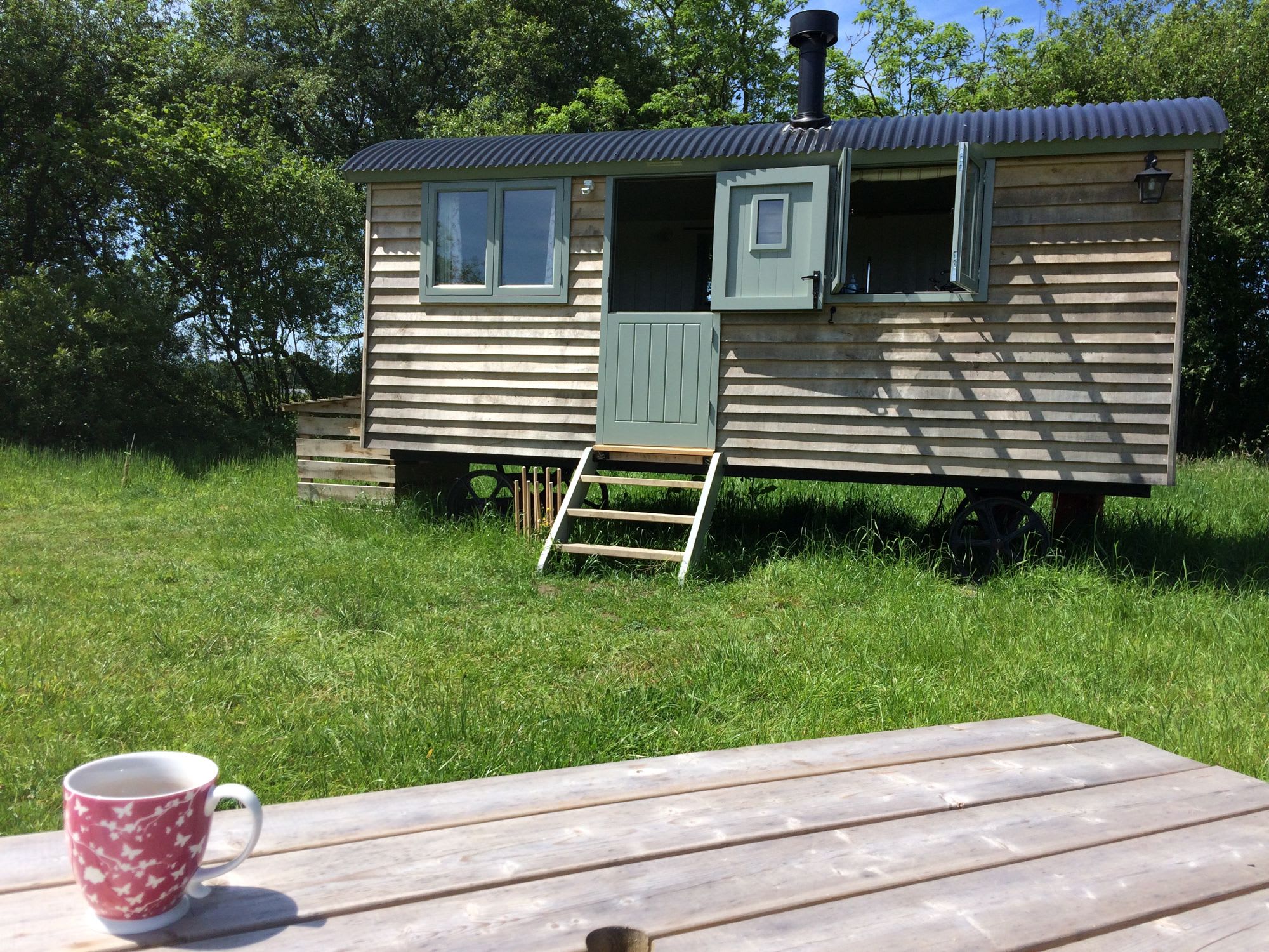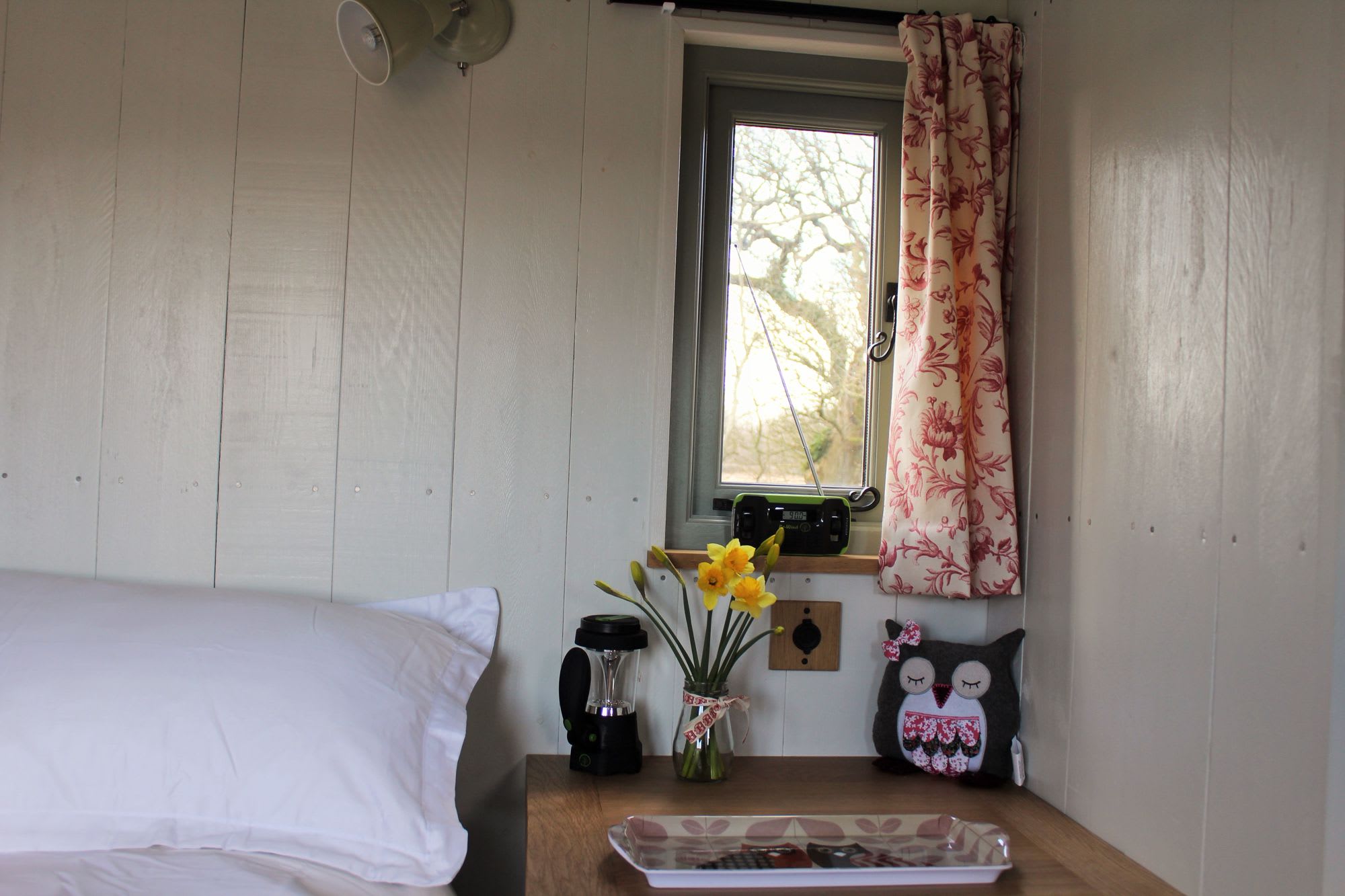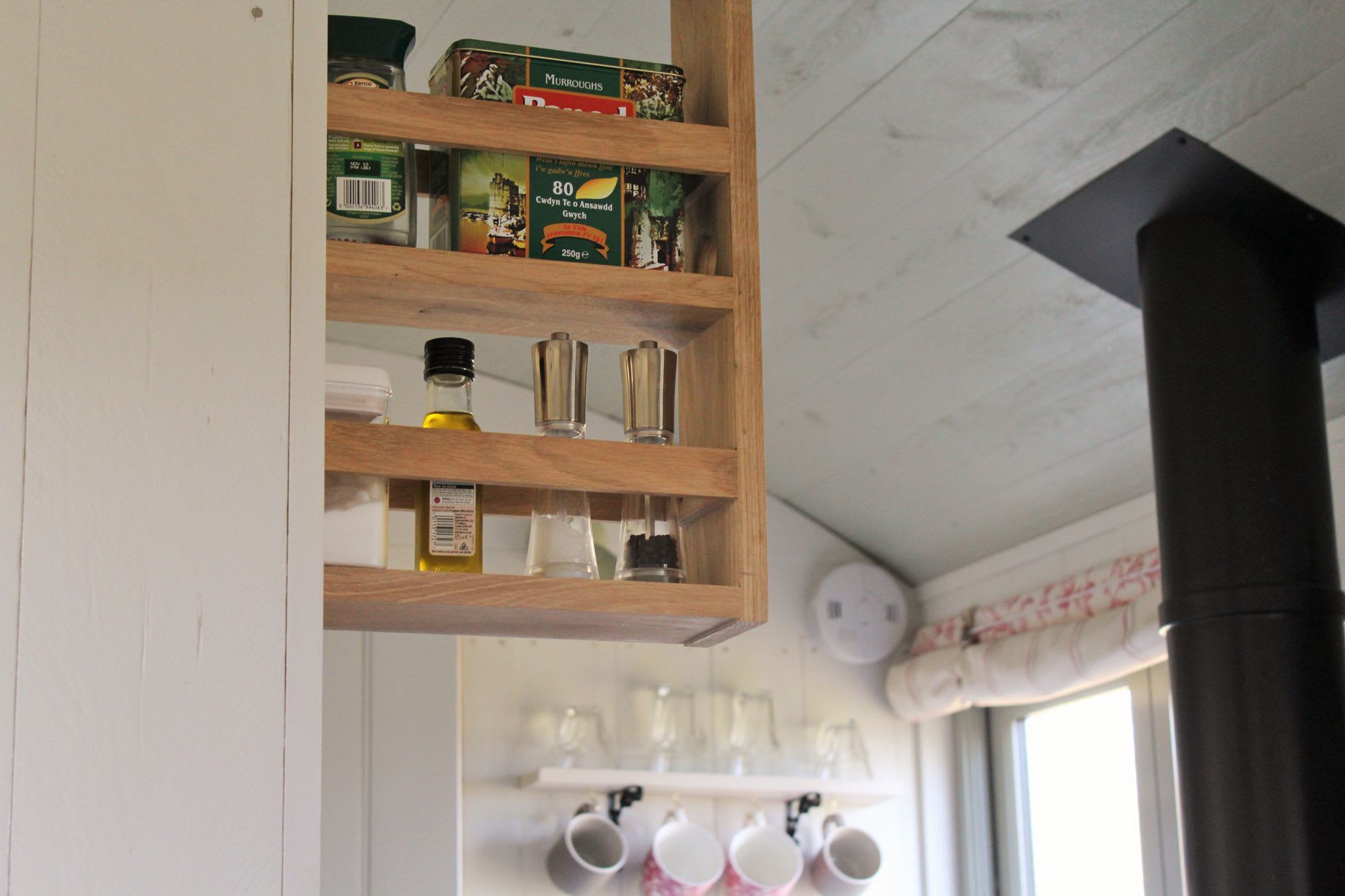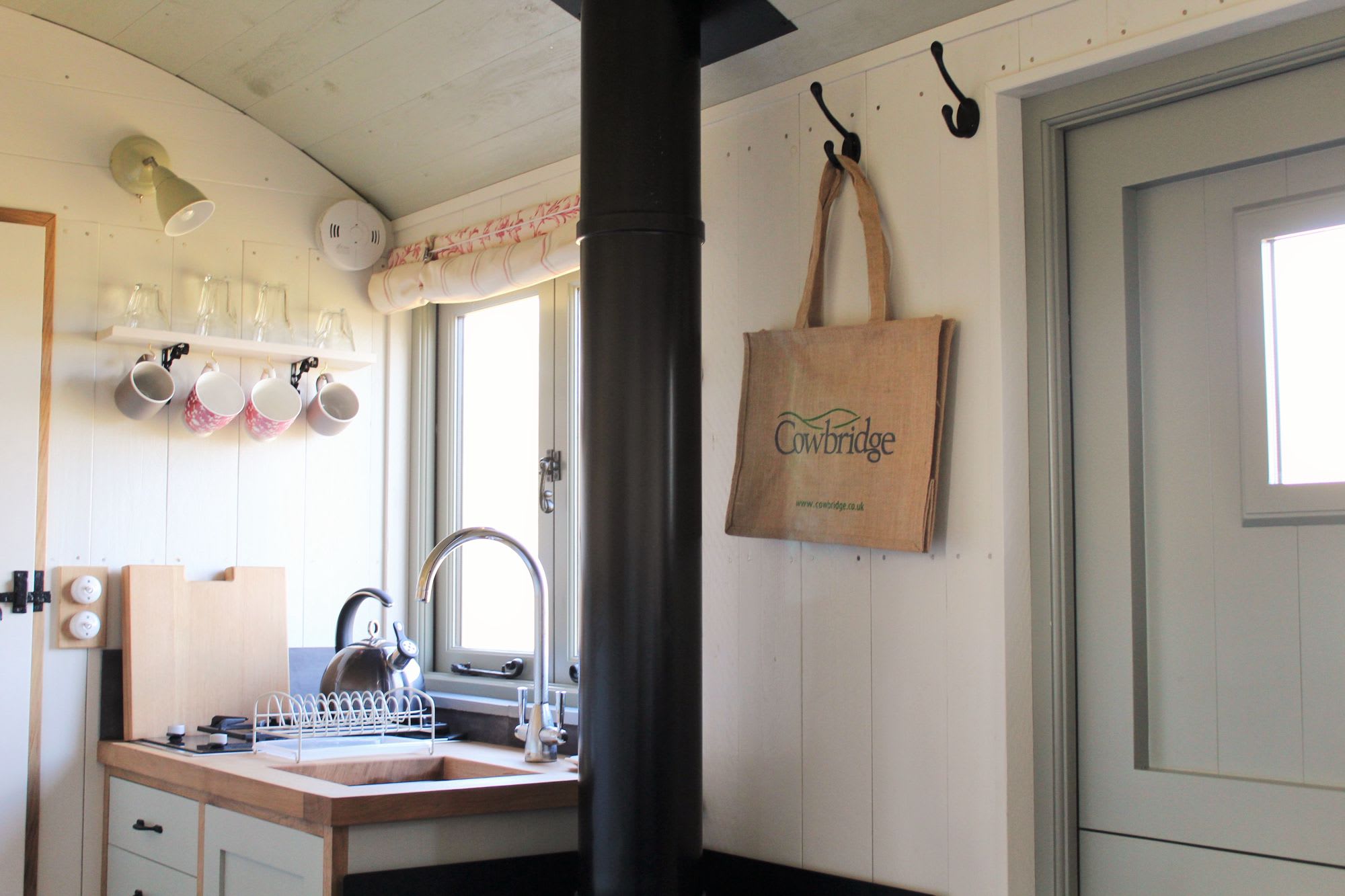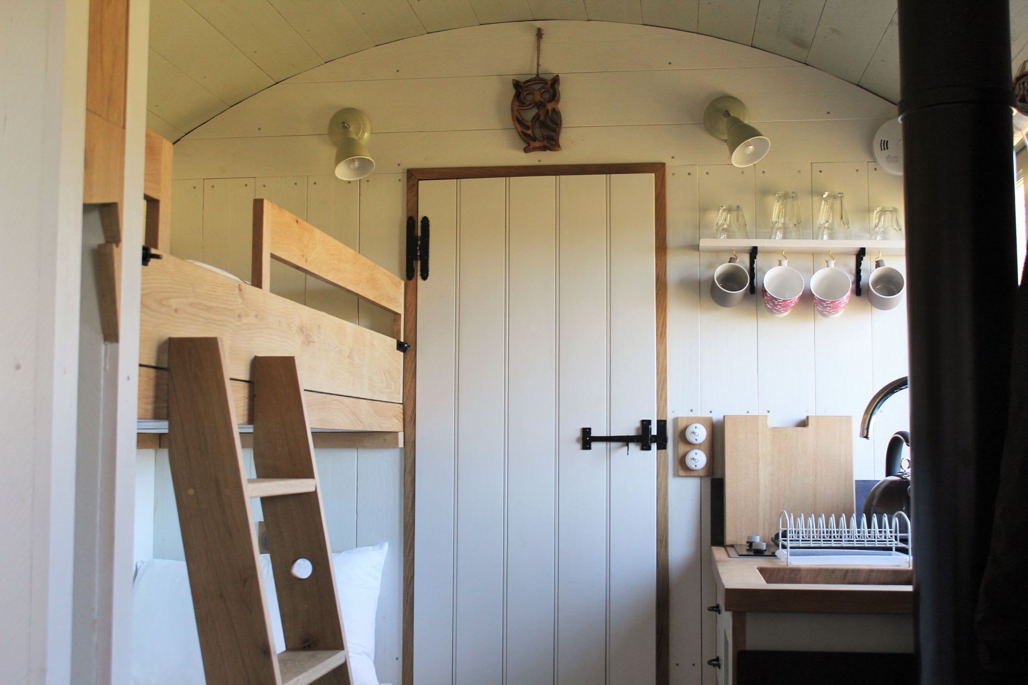 Needy glampers shouldn’t put up a cry at the sight of the words ‘off-grid’ though. These are far from the humble hillside huts of old. Inside they are furnished with everything you could possibly need for a more modern getaway in the hills. Through Gwdihŵ’s, shepherd hut stable doors guests find not only a fitted kitchenette with a fridge, hobs and deep, Belfast sink, but also an en-suite bathroom with a proper shower and flushing toilet. The oak dining table folds down before a double bed is revealed, pulled seamlessly out of the wall, and, on the opposite side, a bench becomes the lower half of two comfortable bunks.