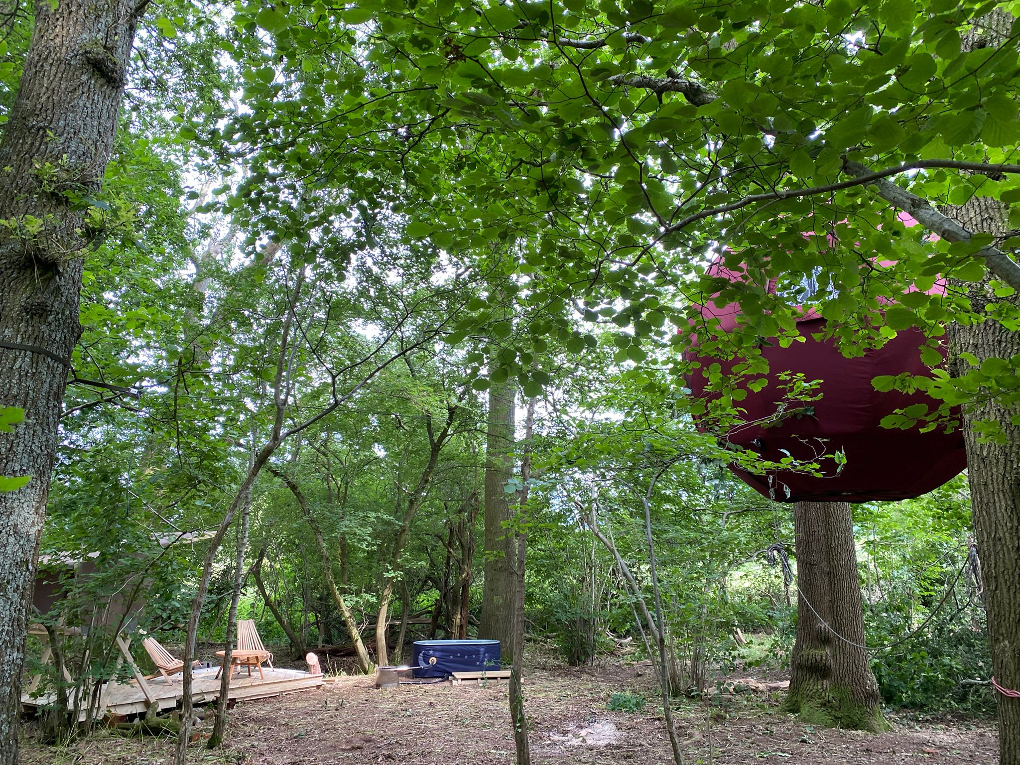 Camping - elevated! A brand new offering to West Sussex, the Tree Tent is a glamping experience unlike no other. This sustainable, comfortable and unique setting provides a different perspective of the British woodlands. Your stay includes this whole site, with no other campers in site! The Tree Tent, kitchen and dining space, wood-fired bath and separate bathroom and shower are all yours for the duration of your stay. The Tree Tent sleeps one or two, complete with a double bed with bespoke bedding, heating, skylight, USB ports, desk and storage. Solar power lights up the site and provides you with electricity in the Tree Tent too. There is also private use of the Hot Tank, a wood-fired outdoor tub designed for wild bathing, and an outdoor heater and pizza oven. With thoughtful design and amenities, and gorgeous views across Little Thakeham Farm through your treetop haven, this private sanctuary above the forest floor allows you to truly immerse yourself in nature, and forget the hustle and bustle of the daily grind. When it comes to food and drink, your tea and coffee needs are provided - as well as a wood-fired pizza oven. Collect fresh ingredients from the local farm shops, or visit one of the lovely restaurants and vineyards in the area. Not to mention - when the bluebells are in bloom, they coat the forest floor below you! ---- 🚗 ~30 mins from Brighton 🚗 ~12 mins from Billingshurst Station, which is - 🚅 ~1 hr 10 mins from London Victoria