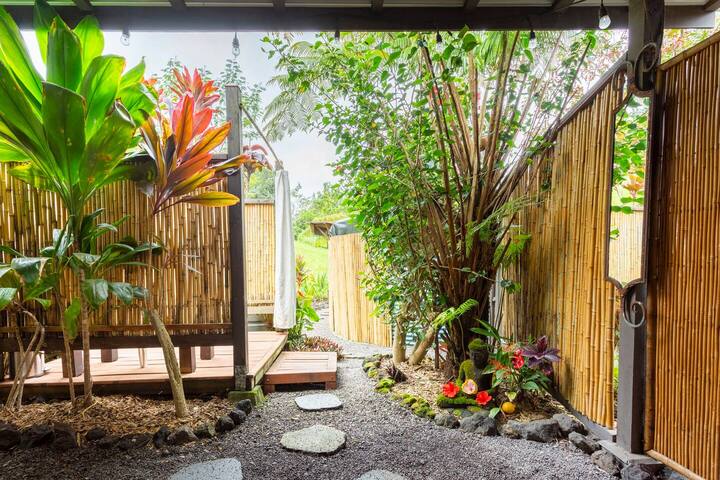 Our glamping site is located on a private 8-acre property situated on the luscious east side of the Big Island. You'll be surrounded by a vibrant tropical oasis, teeming with wildlife and native flora. Take a guided edible farm tour, hike through the surrounding food forest, take a bike ride on our road with the best views on the island, or an off-road excursion to the Green Sand Beach.