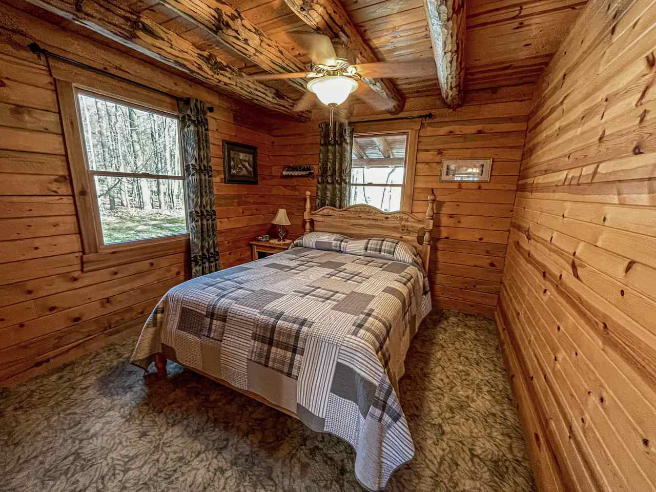 Step away from the stress of life as you relax in one of our six private cabins set on the edge of our 20+ acres of woods. Out front, you will see a 1-acre U-pick flower garden, a small, 2-acre pasture field with sheep and goats, as well as a larger pasture field with our Scottish Highlander cattle roaming the 10-acre hillside. Our cabins offer many luxurious and relaxing features to help you forget about the pressures of daily life. You’ll return home refreshed and renewed after staying in our furnished, quiet country cabins — ready to start fresh! Our cabins are spaced approximately 350 feet apart. During the winter season when the trees are bare, the cabins are slightly visible from our house and the road. But after the leaves are out, the log cabins are very secluded, and you can relax in the privacy of your hideaway oasis.