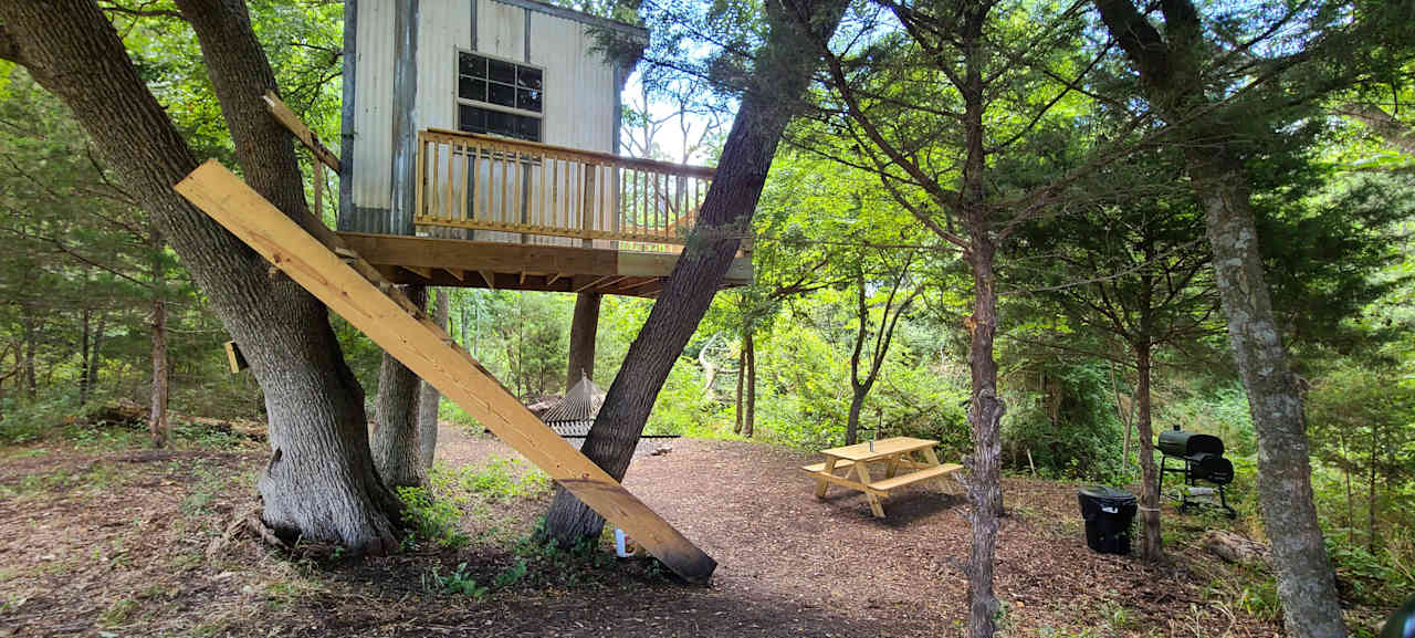 The tiny handcrafted Hummingbird Tree House is perched on an elevated deck overlooking the front pond. and features a queen bed, a bed in the loft for two small kids, electricity, lights, fan, hummingbird stained glass windows, screened operable windows and a screened, operable porthole window in the kids loft. The deck has lights, tables and chairs and outdoor table and chairs and a thatch covered umbrella. There is no heat or AC in the tree house. You must bring your own sleeping bags, blankets and pillows. No food, smoking or pets allowed in the tree house.