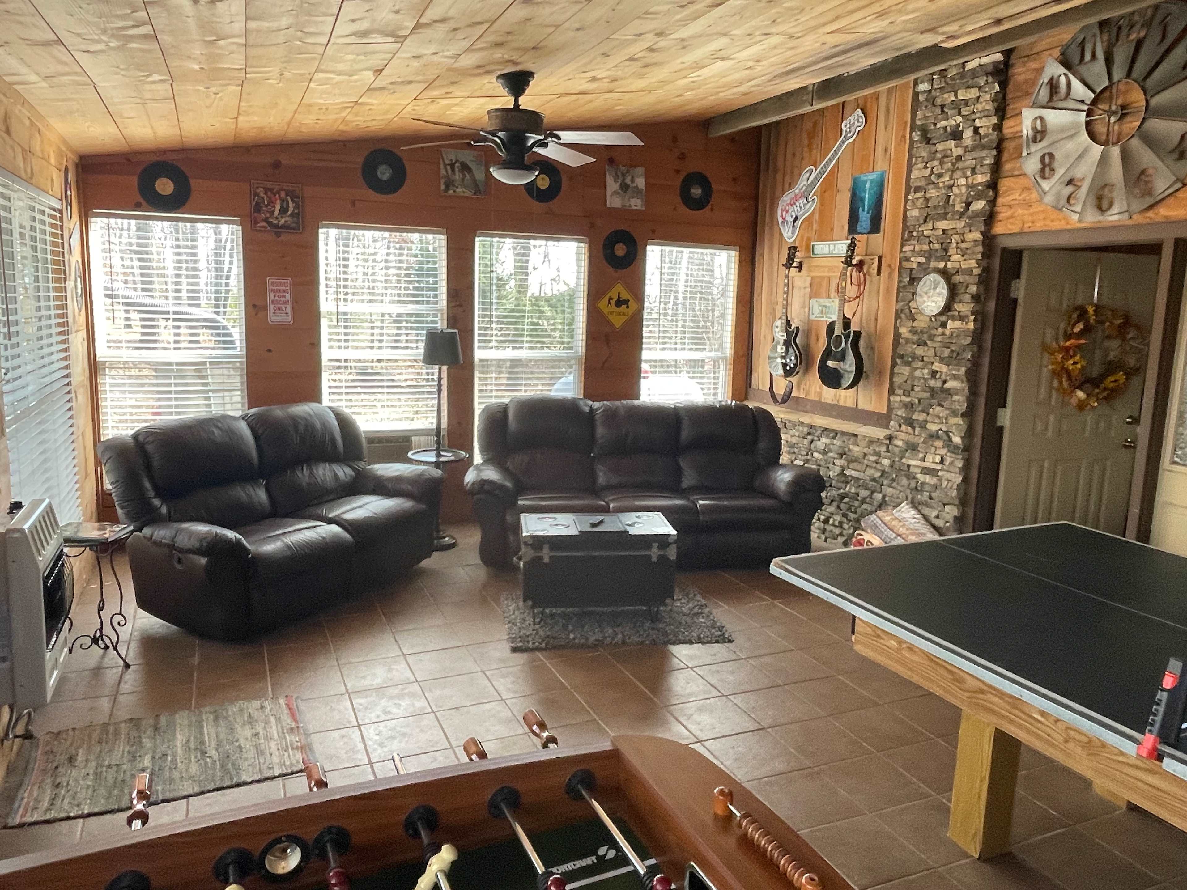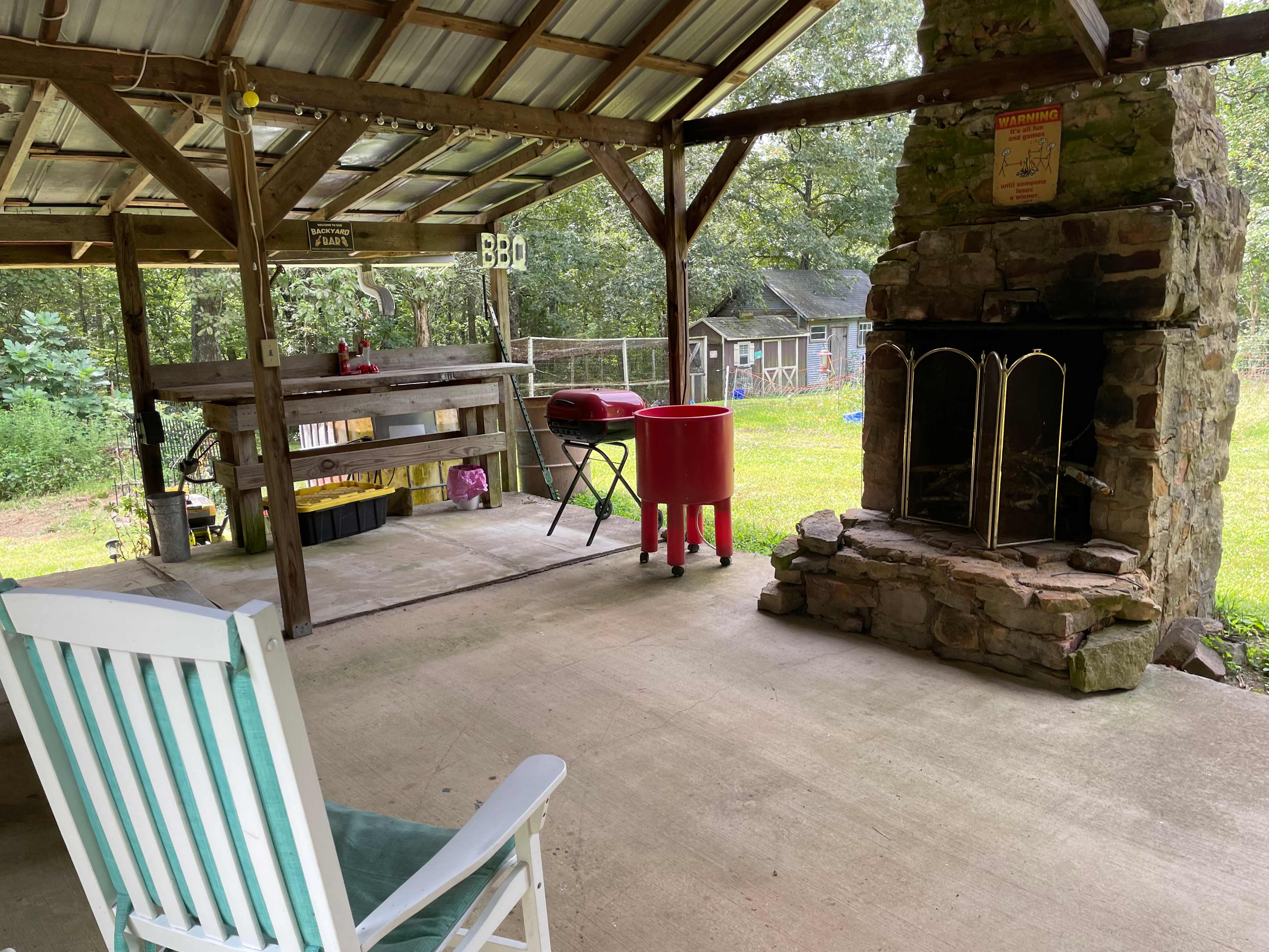 Unique 3-story cabin with 2 bedrooms and 1.5 baths located on a working farm. Large living room with ping pong table. Multiple outdoor spaces including covered pavilion with a fireplace and TV. Combines the serenity of the outdoors with the modern conveniences such as a fully stocked kitchen and high speed internet. The 40 acre property has some nice hiking trails with beautiful views and a small catch and release pond. Although it is in a secluded spot, it is just 15 minutes for grocery stores and Walmart, and it is centrally located to multiple larger hiking spots.