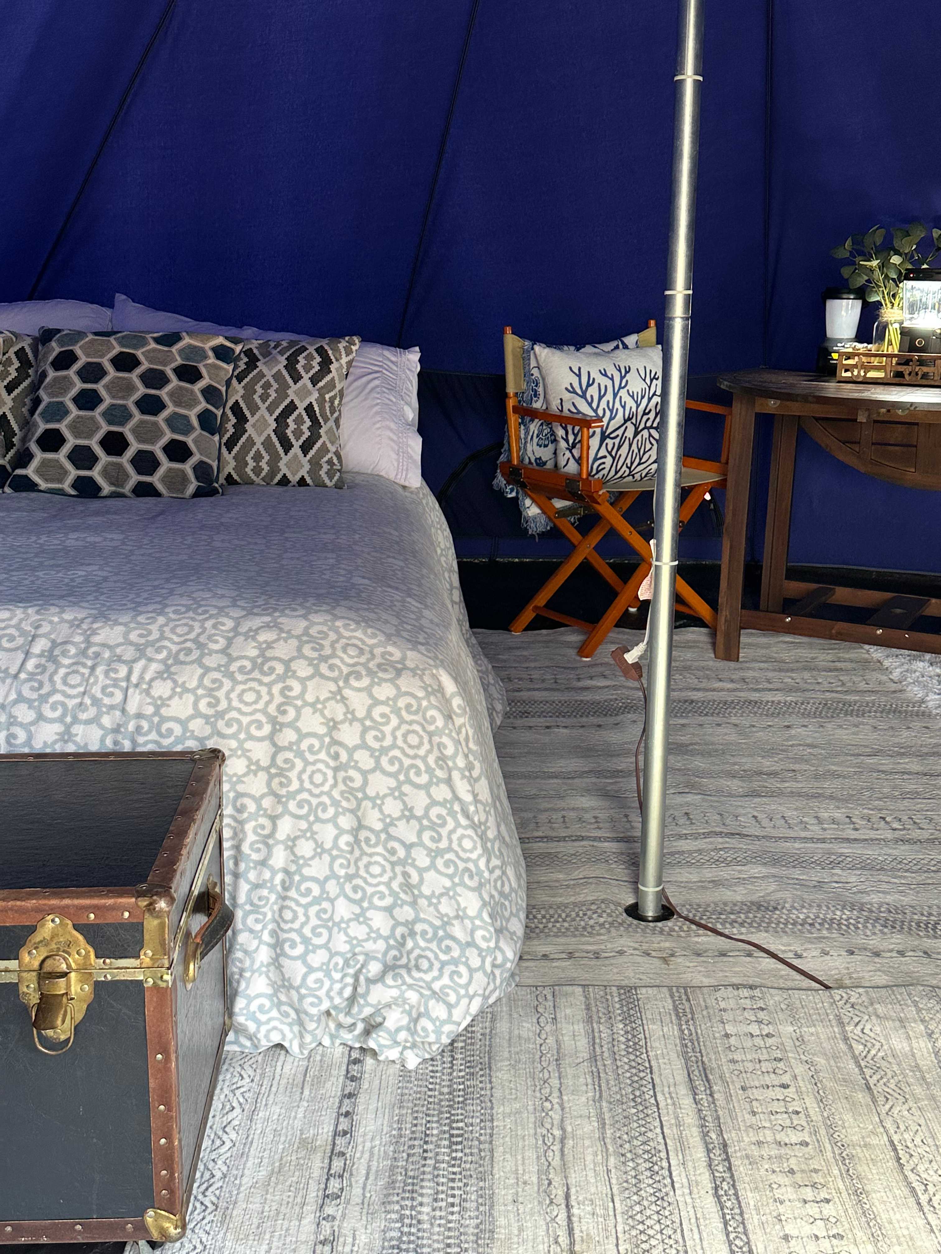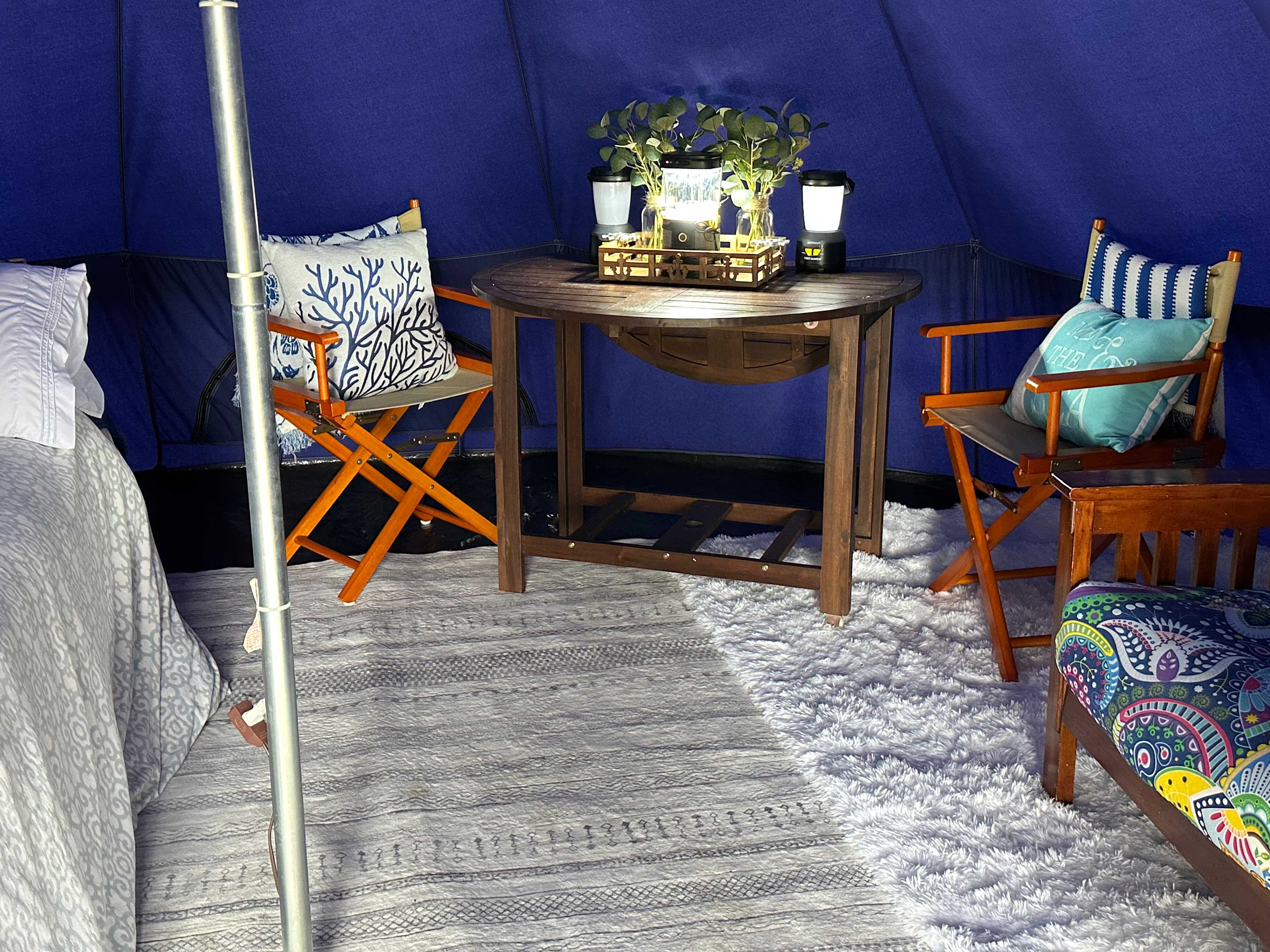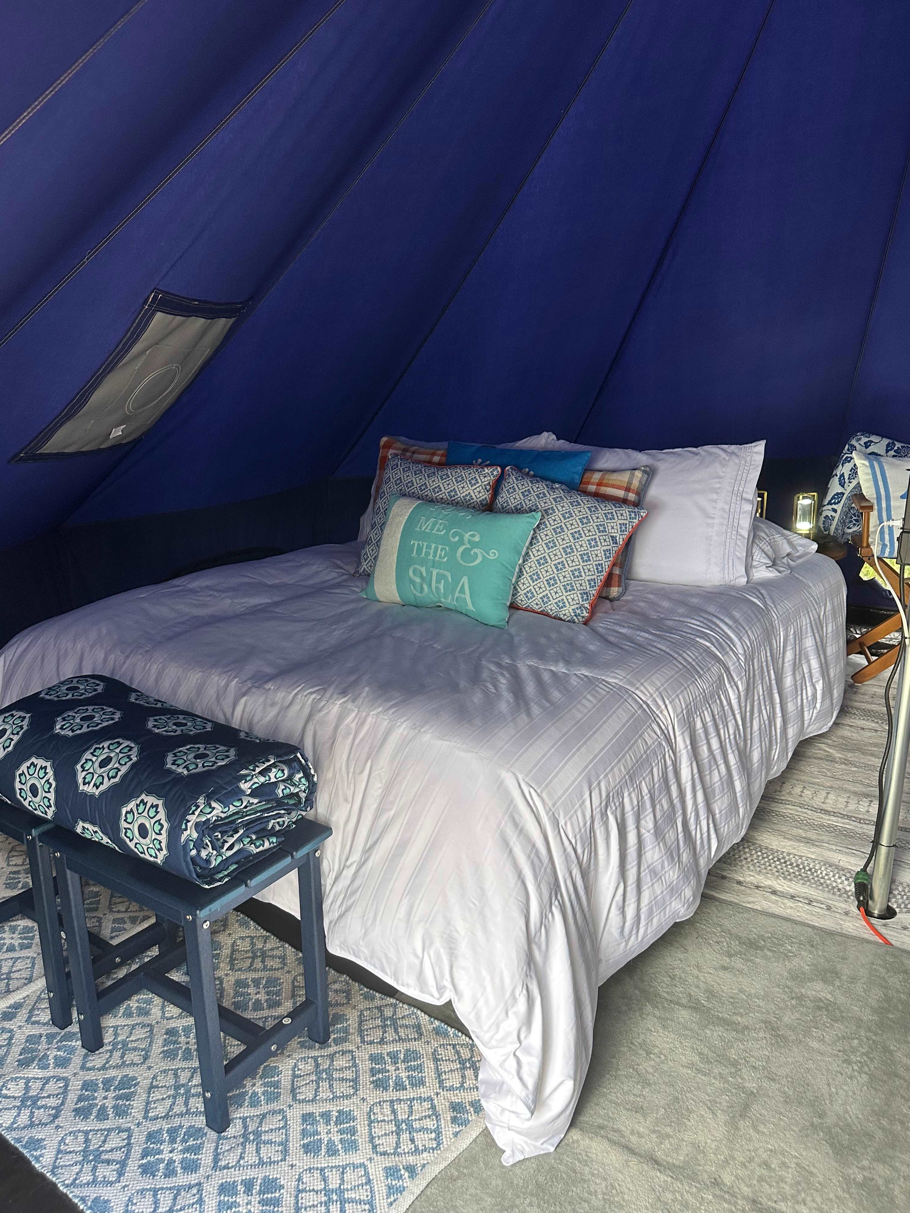 We enjoyed our first visit so much came back and tried out their other tent. We were not disappointed. The queen bed was as great as tent #2 bed and linens. Comfortable, decor is a bit more Boho w/brighter color theme, very nice. Had its own picnic table with huge umbrella, fire pit with a first nights firewood ready to fire up and Adirondack Chairs w/ throw blankets, Lots of Lanterns, soft rugs, throw pillows, propane heater to take that evening chill away was available. It’s Harvest time, we picked Rhubarb, Red Raspberries that are huge, sweet and delicious, had fresh broccoli, cauliflower, lettuce so much produce to go with our fresh salmon we caught. Mel is a fantastic Hostess, she’s a fountain of local knowledge, assisted us with booking suggestion, best trails, restaurants, breweries, charters, and she knows everyone, glamping truly exposes you to more of the Best of a community from a locals view. We rented bikes and canoe the reservoir is another locals secret spot. Mel had, all the gear to loan out, We met the next morning to