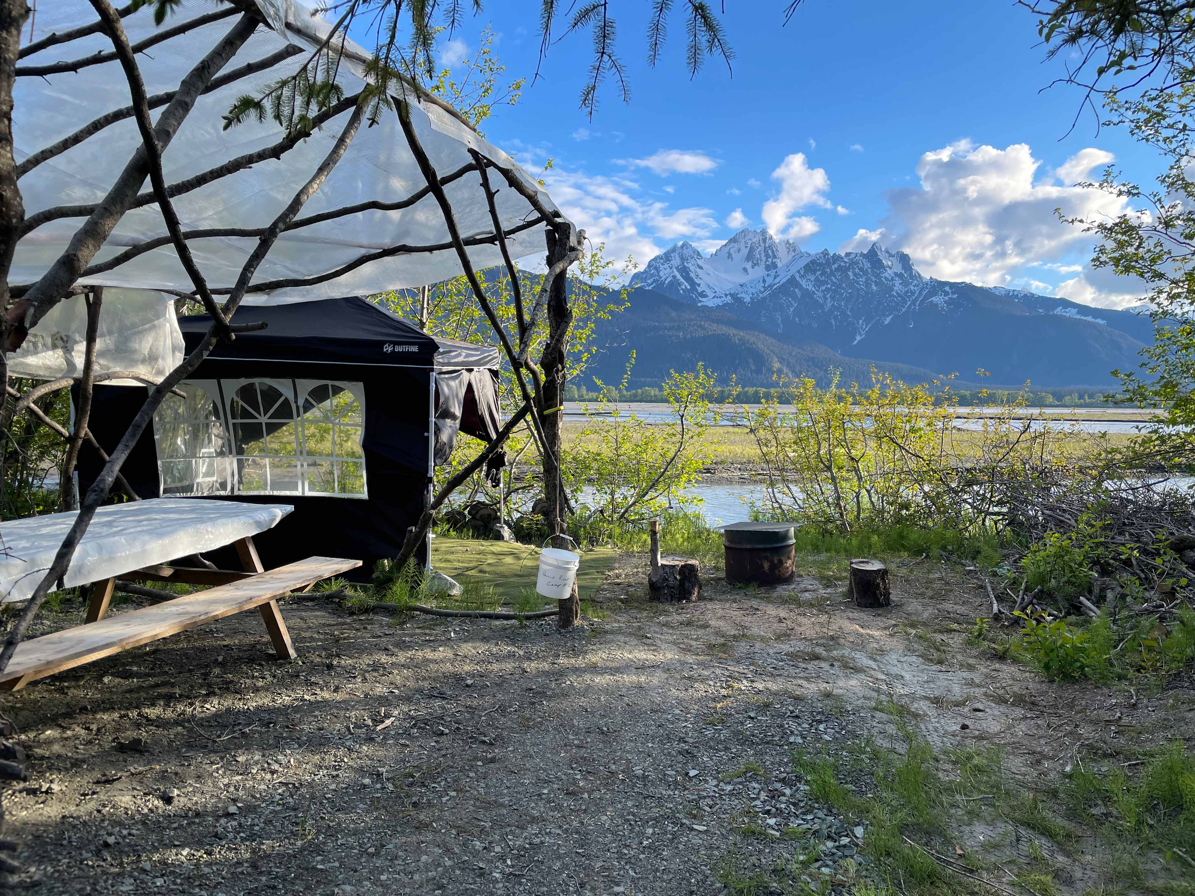 We have owned this property since 1996 and have found it to be a special healing place and have now decided to share it with other special people. It is approximately 6 acres on the Chilkat river, with about 1200 feet of river frontage. The Cathedral Peaks are directly across the river from the property, which has southern exposure and each campsite has sunset views. All the salmon species swim up the river. The subject property has nursery streams for the salmon. They do not spawn here, but the fry come from upstream spawning grounds to grow up a bit before heading out to the ocean. Swans nest in a nearby pond and sometimes play in the river out front. Evenings and nights are quite and peacefulThere are four riverfront campsites, spaced about 100 feet apart. Each site has a covered picnic table, fire ring and access to a composting toilet. These sites are perfect for tent campers and smaller recreational vehicles like camper vans or pickup campers. You will enjoy amazing views of the Chilkat river and surrounding mountains. Mountain Goats live above the camps and are fun to spot as they graze high up in the mountains. Parker Schnabel grew up next door and the rock resource mine his dad owned is still operating and that can be background noise during the day. The evenings and nights are quite and peaceful.