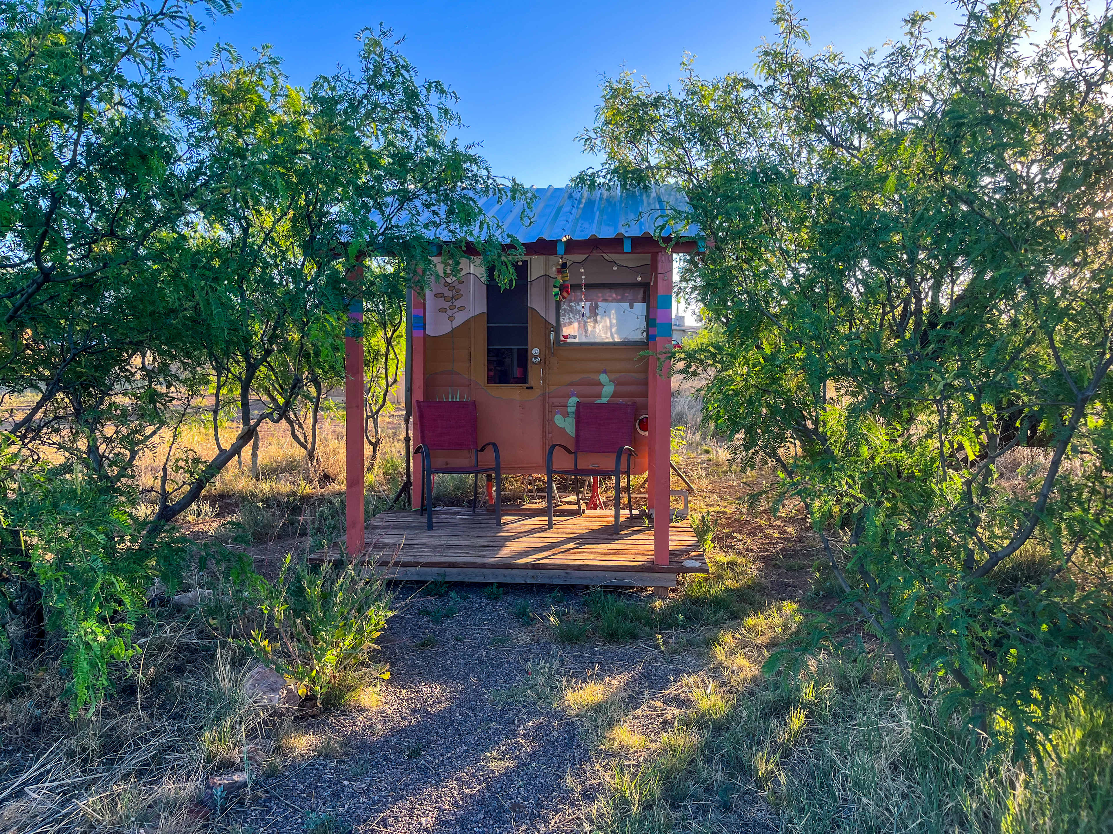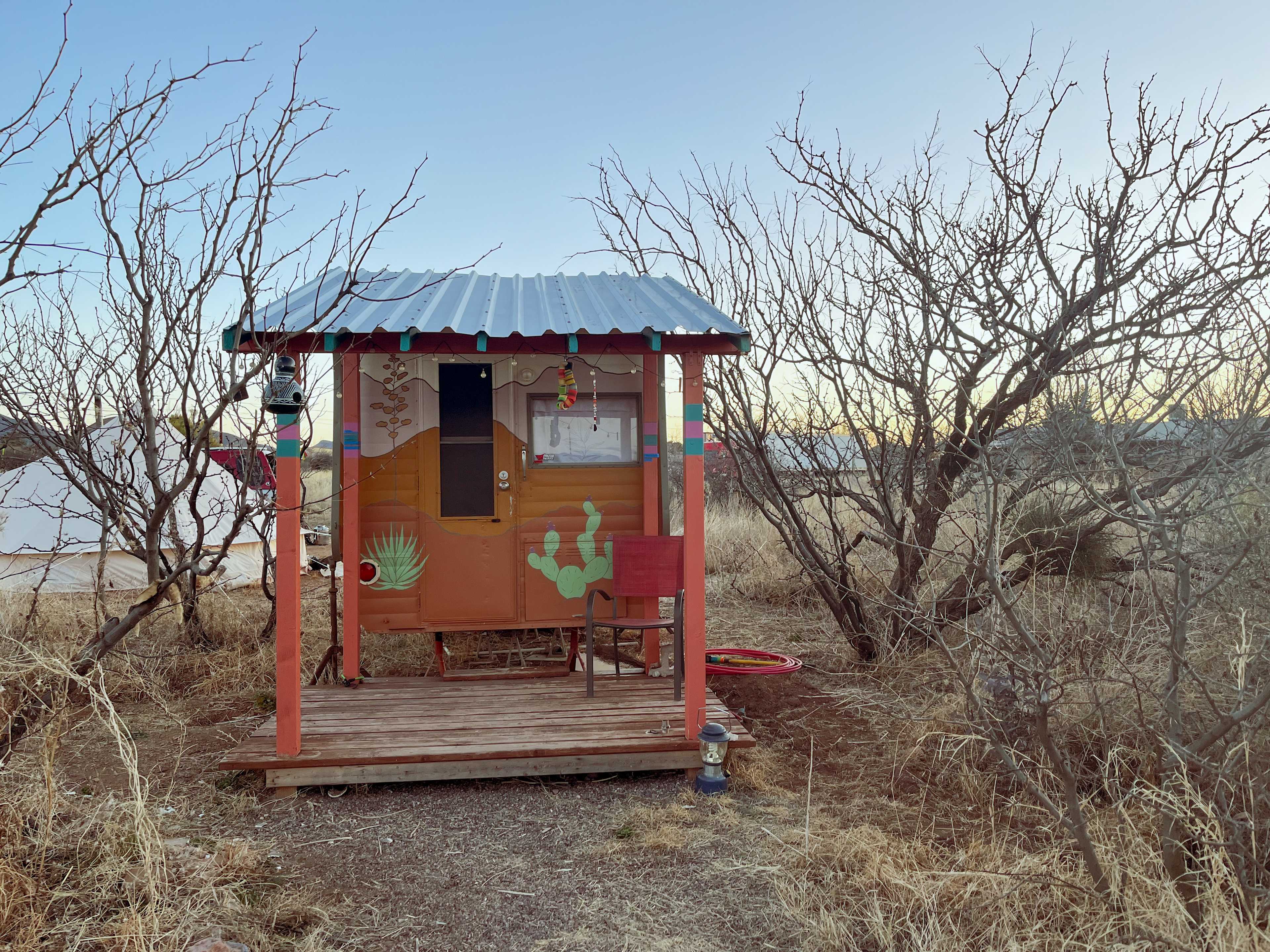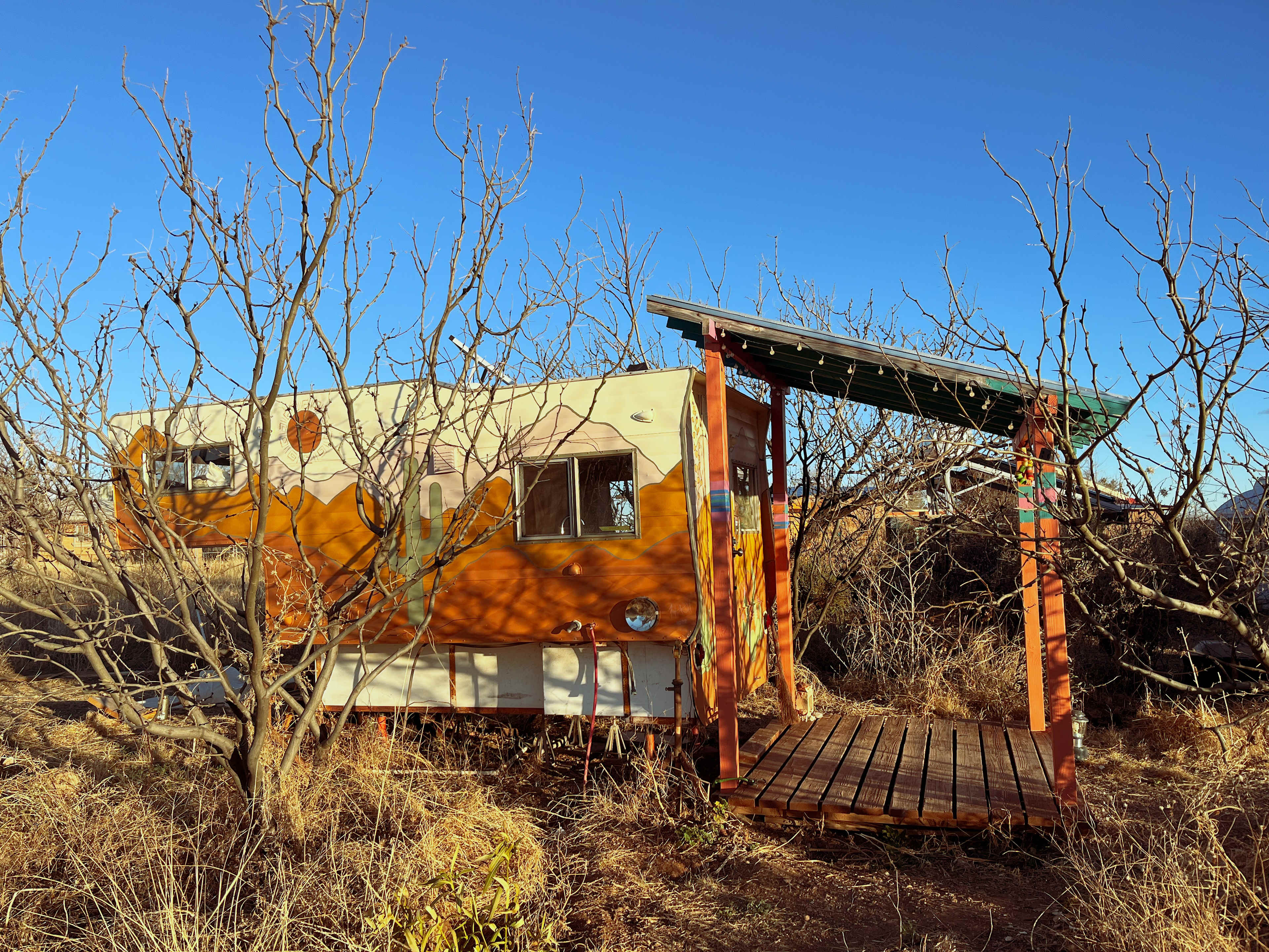 Camper del Desierto is amazing! It is a small camper at a wonderful location where the hosts are creating a lovely alternative life. Their stucco work and their own home on the property are beautiful! The hosts are really nice, especially their very attentive cat Cherimoya, who hung out with us a lot. This is not for people needing a four or five star hotel, but it is very much for people who need a break, can deal with a composting toilet and a propane range in the camper. The bed is raised up, so it is not for people who sleep standing up. :-) One can see Naco, Mexico from the location, and it's a few miles to Bisbee, going by the Lavender Pit on the way. Their garden, the goats and chickens, the ability to hang out with friendly people all make it worthwhile. We hope to be able to stay here again.