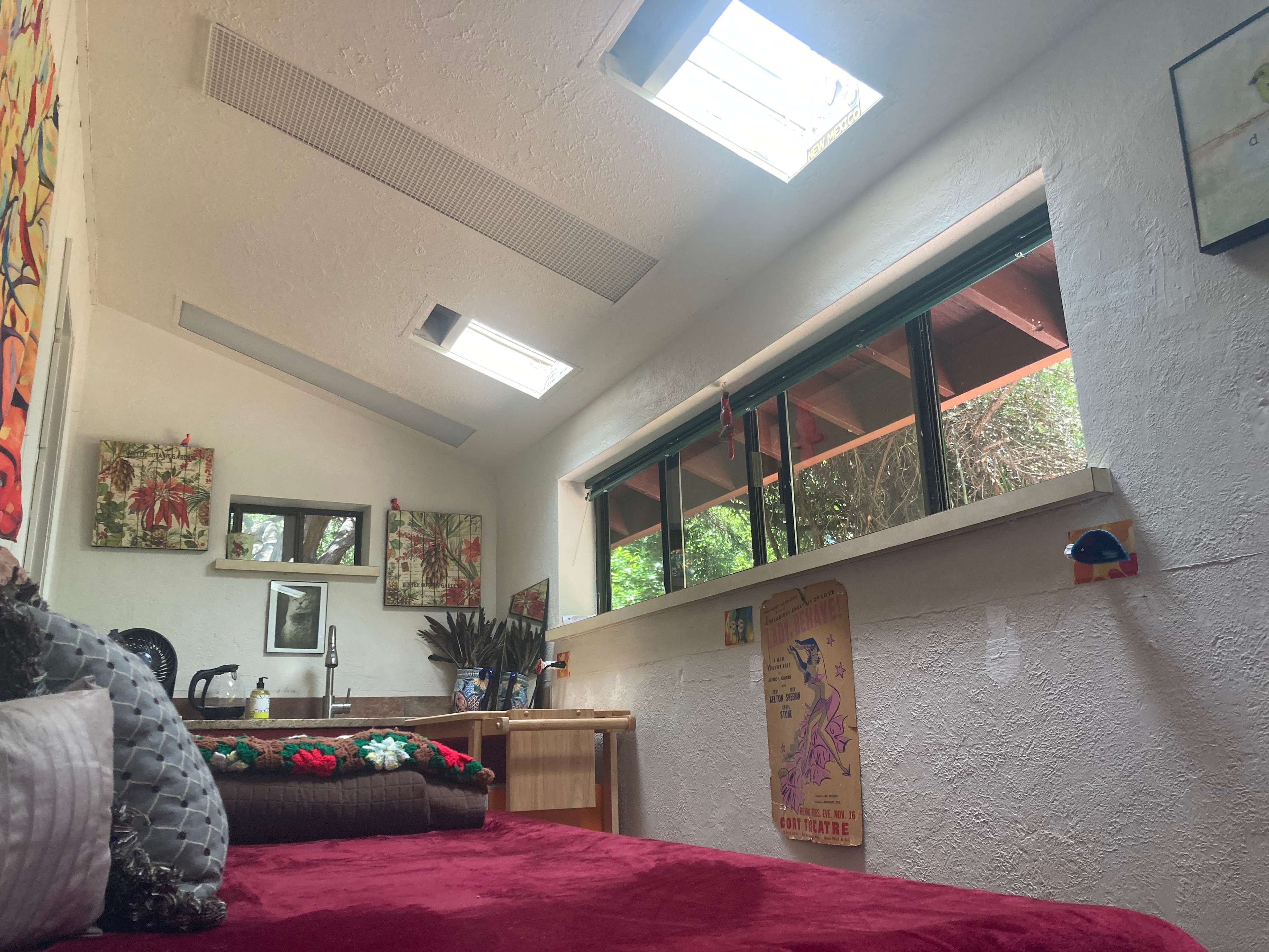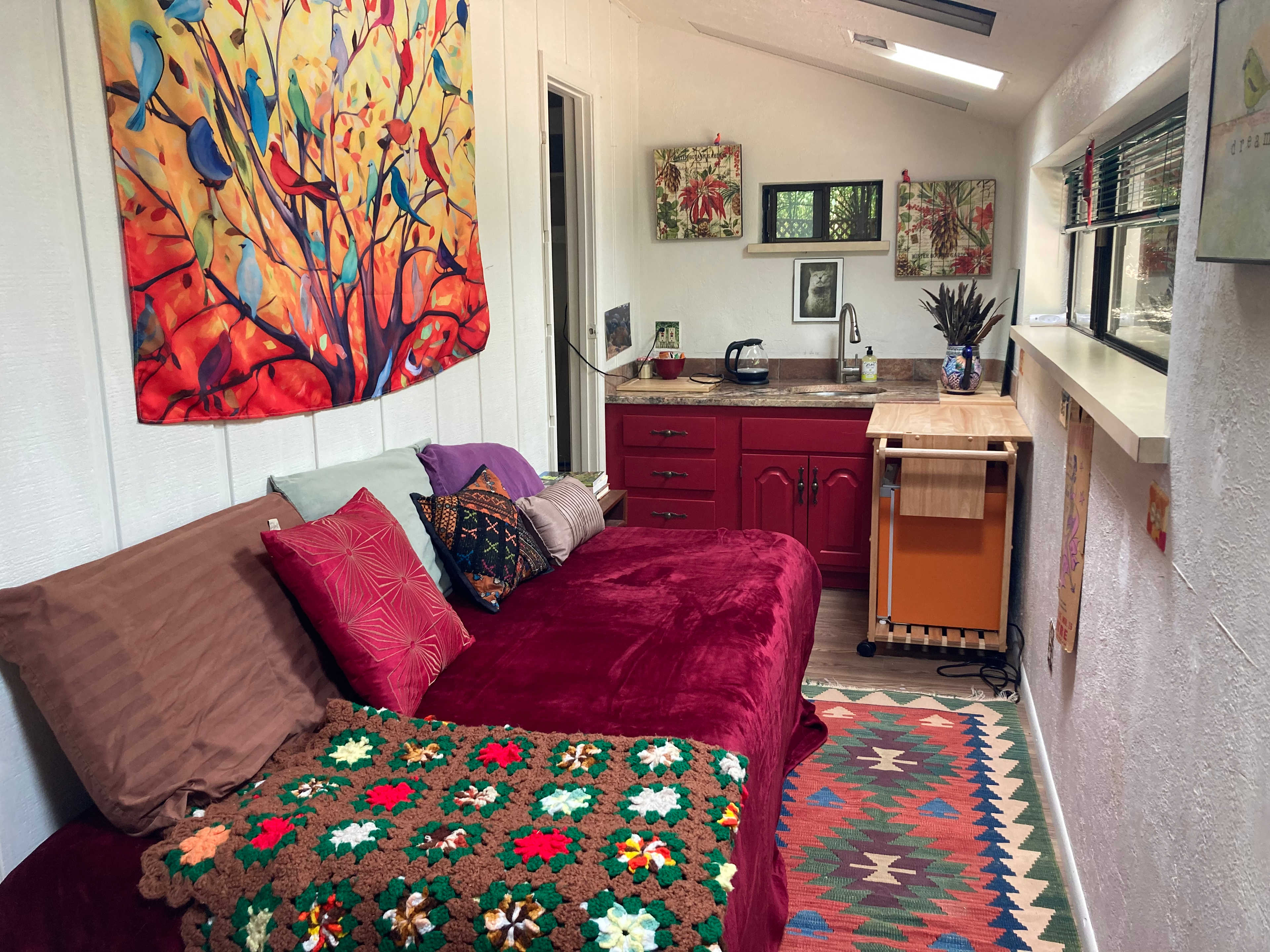 Welcome to the quirky, colorful and peace-filled BIrd's Nest! It is private room off my garage inspired by bird &tree energy Great for a stop on the way to or from camping in Sedona! Comfy twin bed Bamboo mattress Private toilet Sink with hot water, fridge Private entrance Codelock Lost of fresh air flow/screens. not camping but definately has a camping/nature vibe. Smells fresh. Space is about 110 square feet. There is NOT a shower in the Nest but you can come in the house ONCE per booked day to shower. Shower hours between 7 am and 730 pm Zero waste/no cleaning fee. Take trash and recycling The space Small but cozy like a birds nest this peaceful sanctuary is a retreat after a day exploring Sedona's majestic landscape. I aim to provide a serene and quiet refuge to relax and recharge. Space is best suited for experienced travelers,budget travelers,hikers,mountain bikers, nature lovers & creative types. It’s not optimal for those used to high end lodging. I might be open to hosting a very well behaved quiet pet.Message me to tell me more about your trip and pet and we’ll decide together if it might be a fit. No barking is key and there would be an additional $25 one time fee. Please indicate you read listing upon contact. Thanks! Guest access You have a nice outdoor space under the Grandmother Juniper Tree. There is no oven. It is not a place to cook. Other things to note The Nest does not have WiFi, but you can use your data.There is WiFi at Starbucks a couple blocks away. Sedona Public Library also has free wifi, a great outdoor space to work and also even Zoom private booths, all free. IF I am home and have my hotspot on I can give you the pass code but access to this is not guaranteed. Possible ebike rental.This small cozy rental unit is on the back of a garage on a 1/4 acre proporty under Thunder Mountain in West Sedona. You also have access to a secxtion of the yard with a huge juniper tree with chairs. The property IS in a residential neighborhood and is generally quite quiet although this cannot be guaranteed.