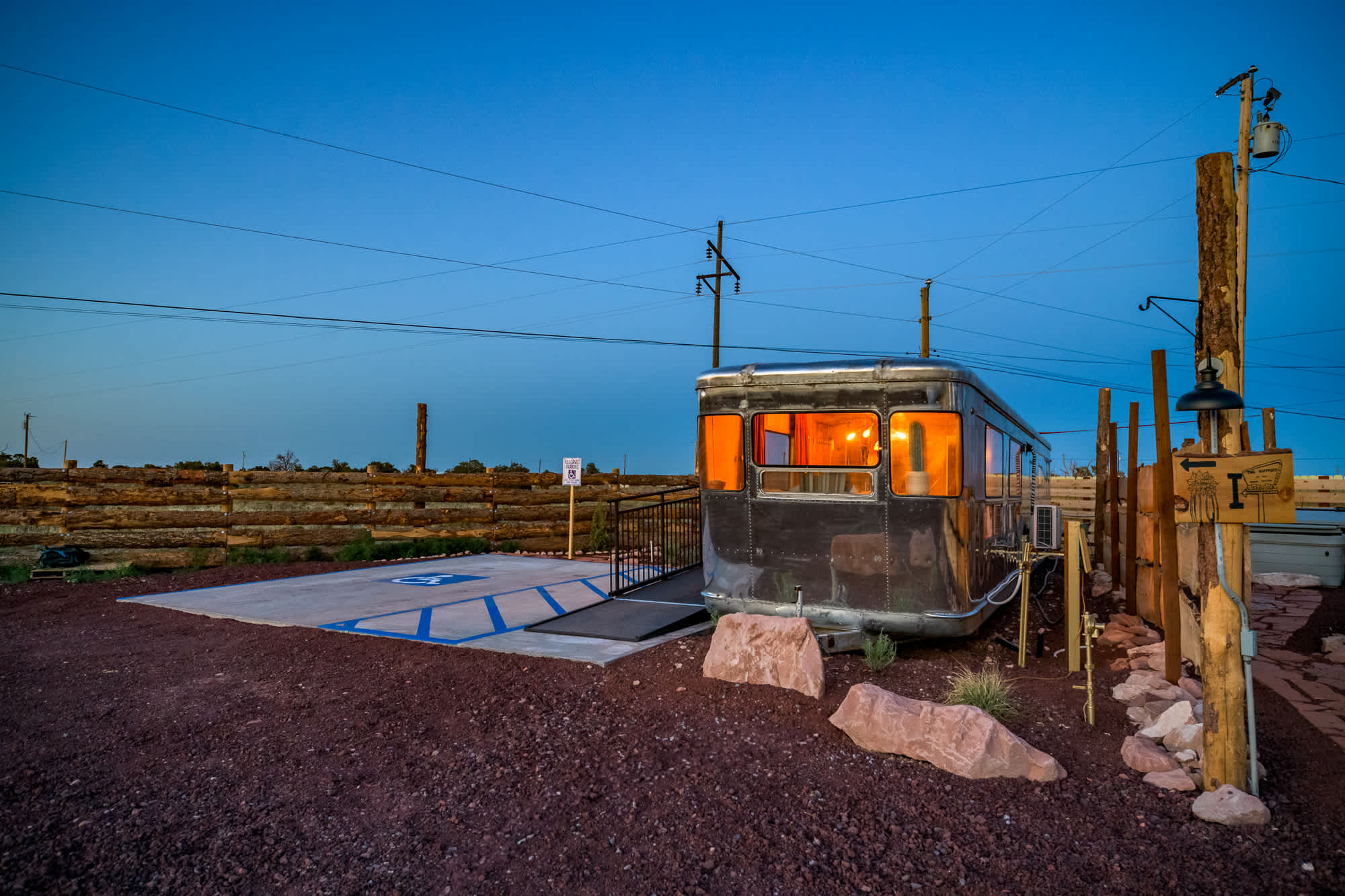 Airstream I (The Spartan) is thoughtfully designed to provide accessible comfort and modern convenience—ideal for guests with mobility needs. • ADA-accessible layout with roll-in shower & grab bars • Queen bed with 12" memory foam mattress • L-shaped sofa (24" x 74") for lounging or additional sleeping • Kitchenette with coffee & cooking essentials • Full ADA bath: roll-in shower, grab bars, flushable toilet & sink • WiFi, flatscreen TV, AC & heat • Private hot tub, fenced patio & outdoor lounge Guests enjoy access to curated shared amenities, including: • A communal sauna and outdoor shower • BBQ lounge • Dog-friendly with on-site dog park • Planned cold plunges (coming soon!) The Outpost is your gateway to star-filled nights, crisp desert air, and unforgettable Grand Canyon days.